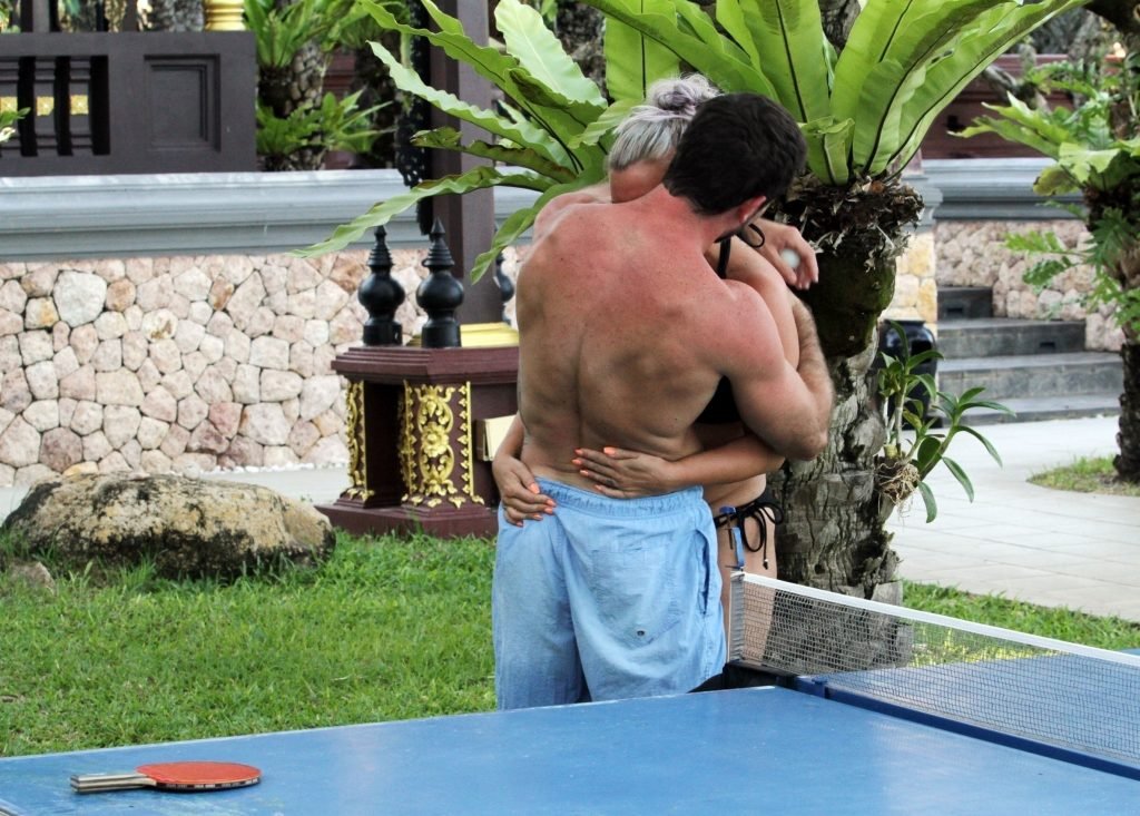 Kerry sourit largement, montrant son esprit compétitif alors que le couple s’amuse lors d’une partie de ping-pong au complexe Ammatara Pura Pool Villas en Thaïlande. Il n’y avait pas de perdants dans ce match d’amour, car Kerry et Ryan ont partagé une étreinte intime pendant leurs vacances idylliques.