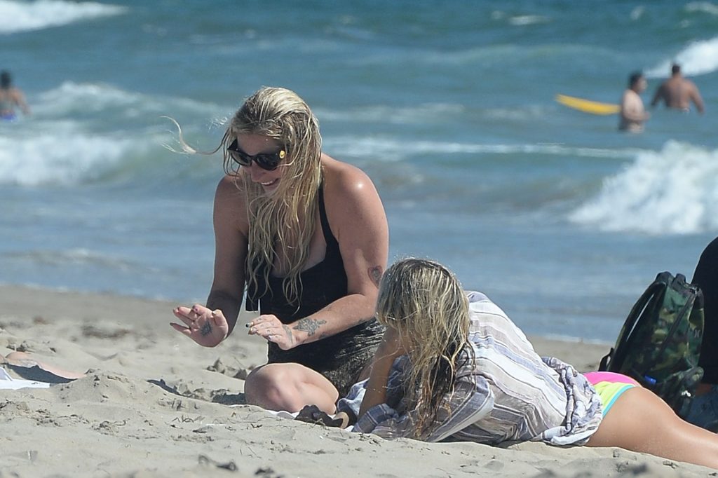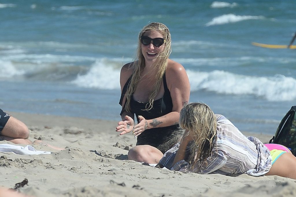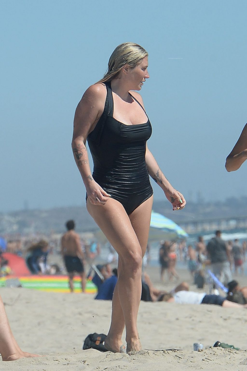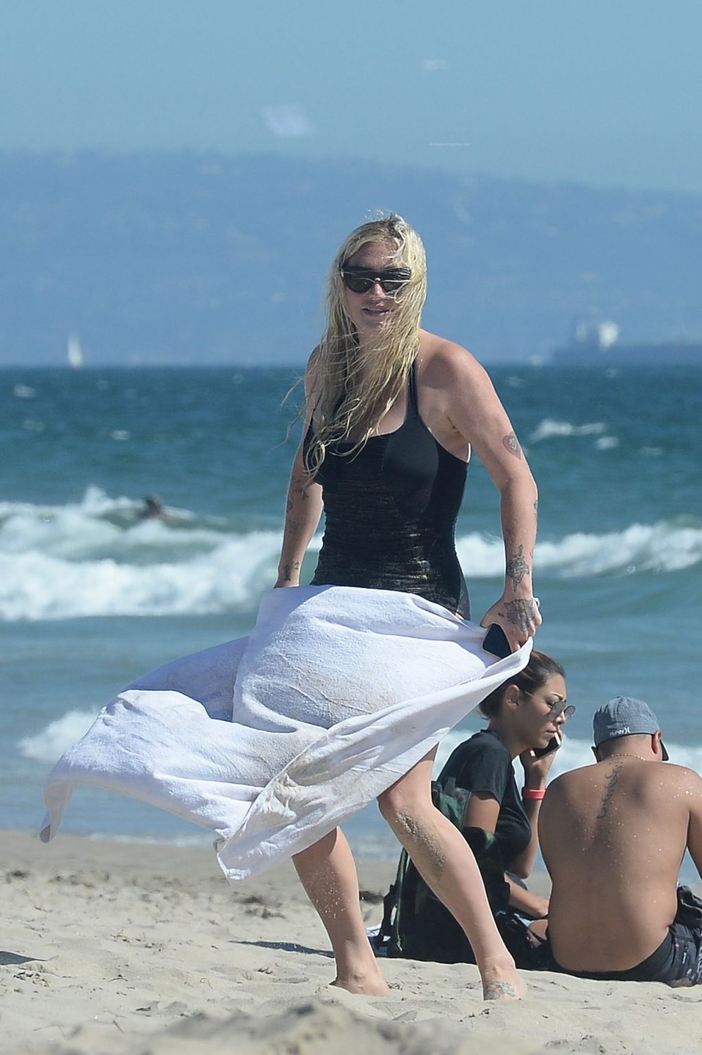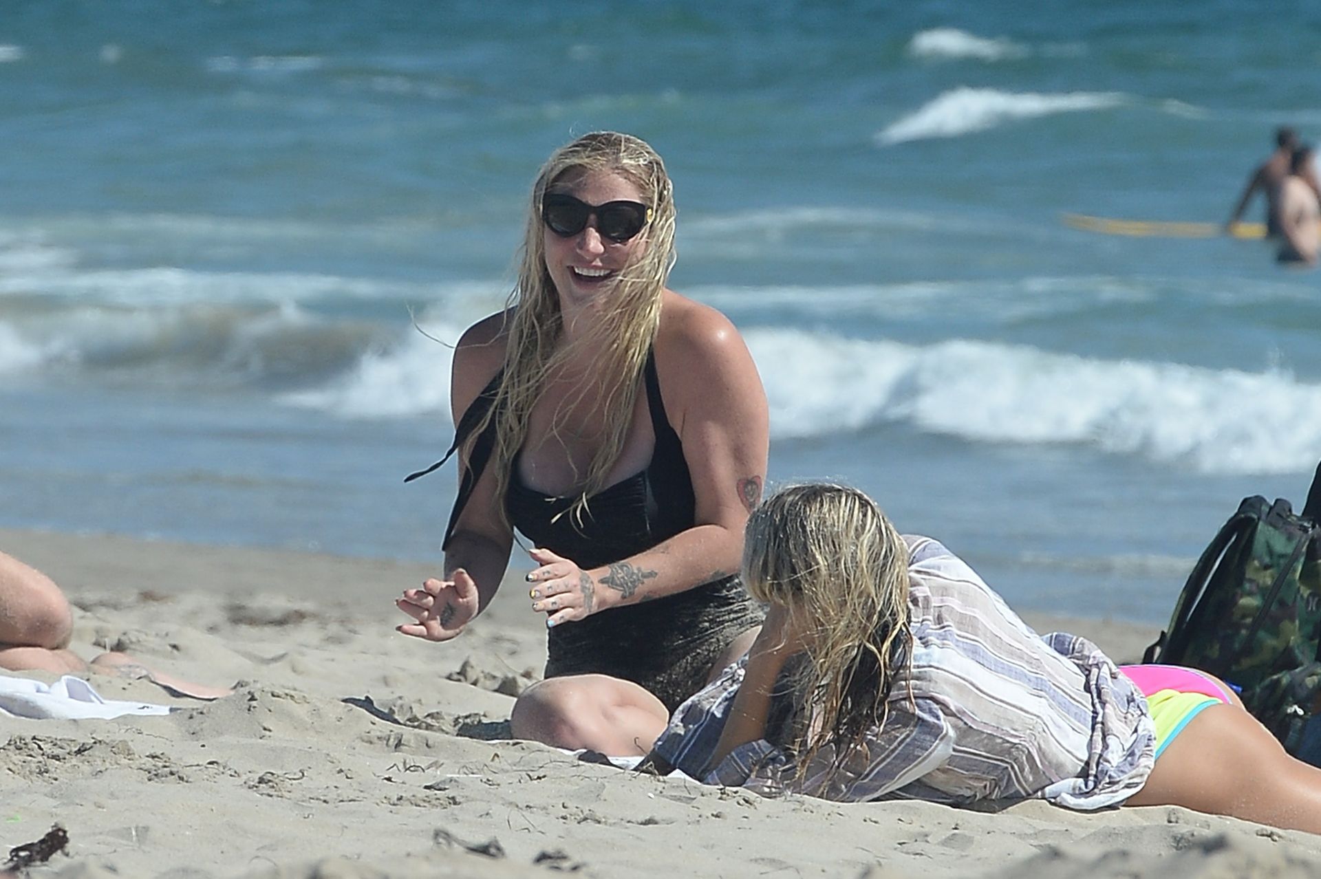 Kesha profite de la plage avec des amis à Los Angeles, 08/02/2021. La chanteuse pulpeuse de 34 ans s’est rafraîchie en se baignant dans l’océan en portant un maillot de bain une pièce noir.