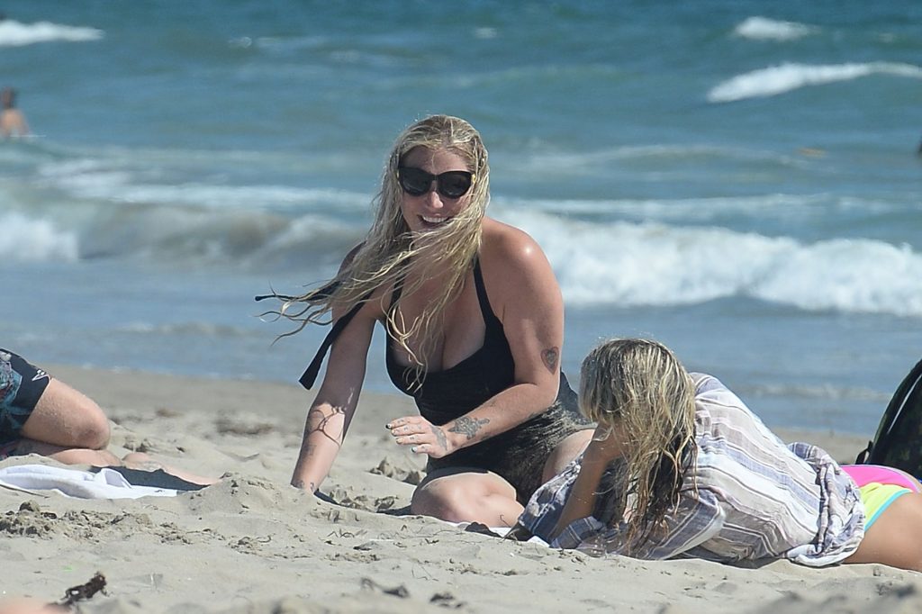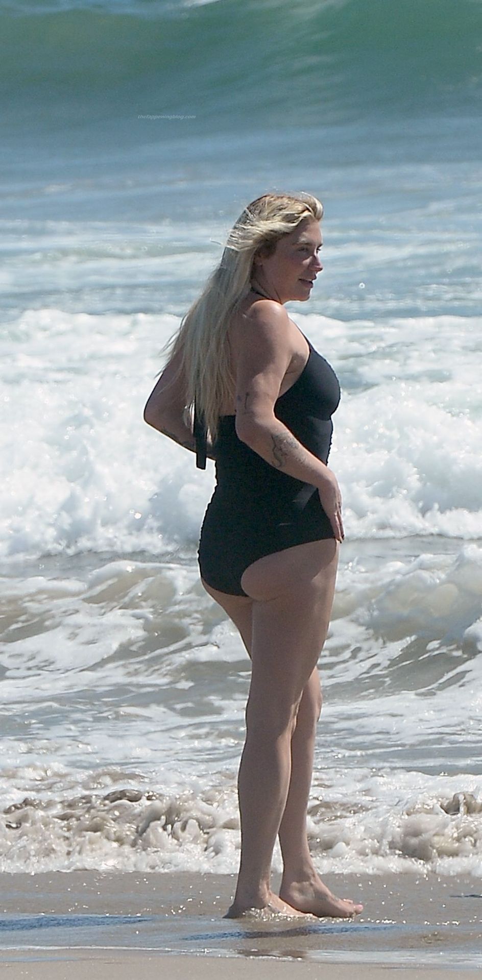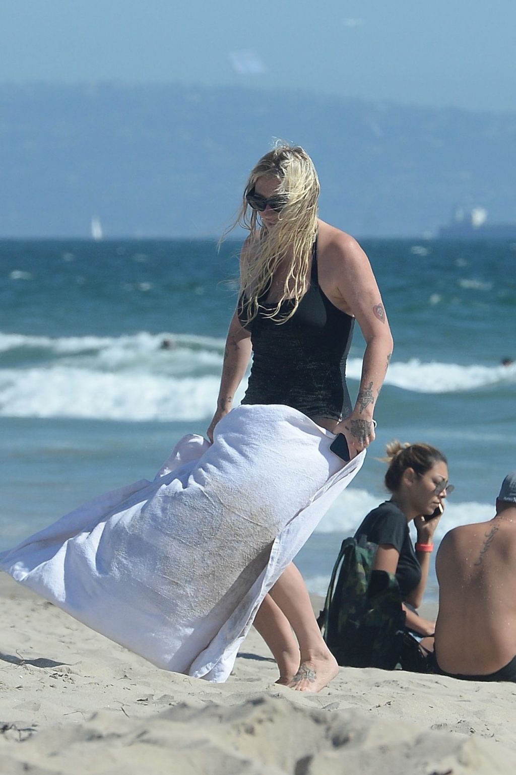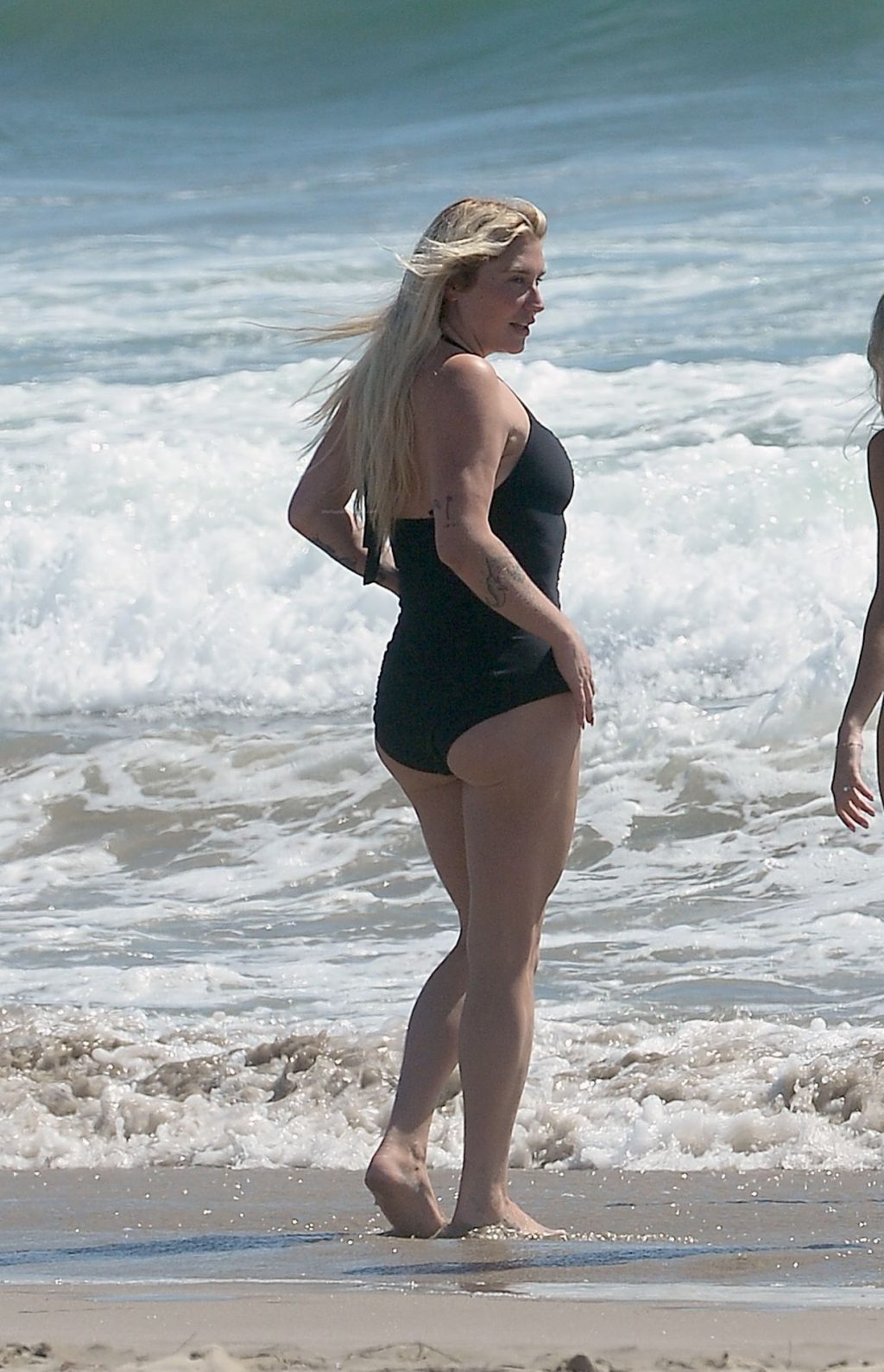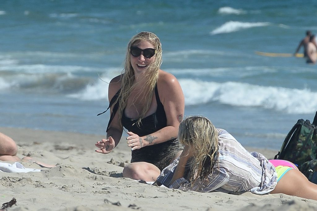 Kesha profite de la plage avec des amis à Los Angeles, 08/02/2021. La chanteuse pulpeuse de 34 ans s’est rafraîchie en se baignant dans l’océan en portant un maillot de bain une pièce noir.