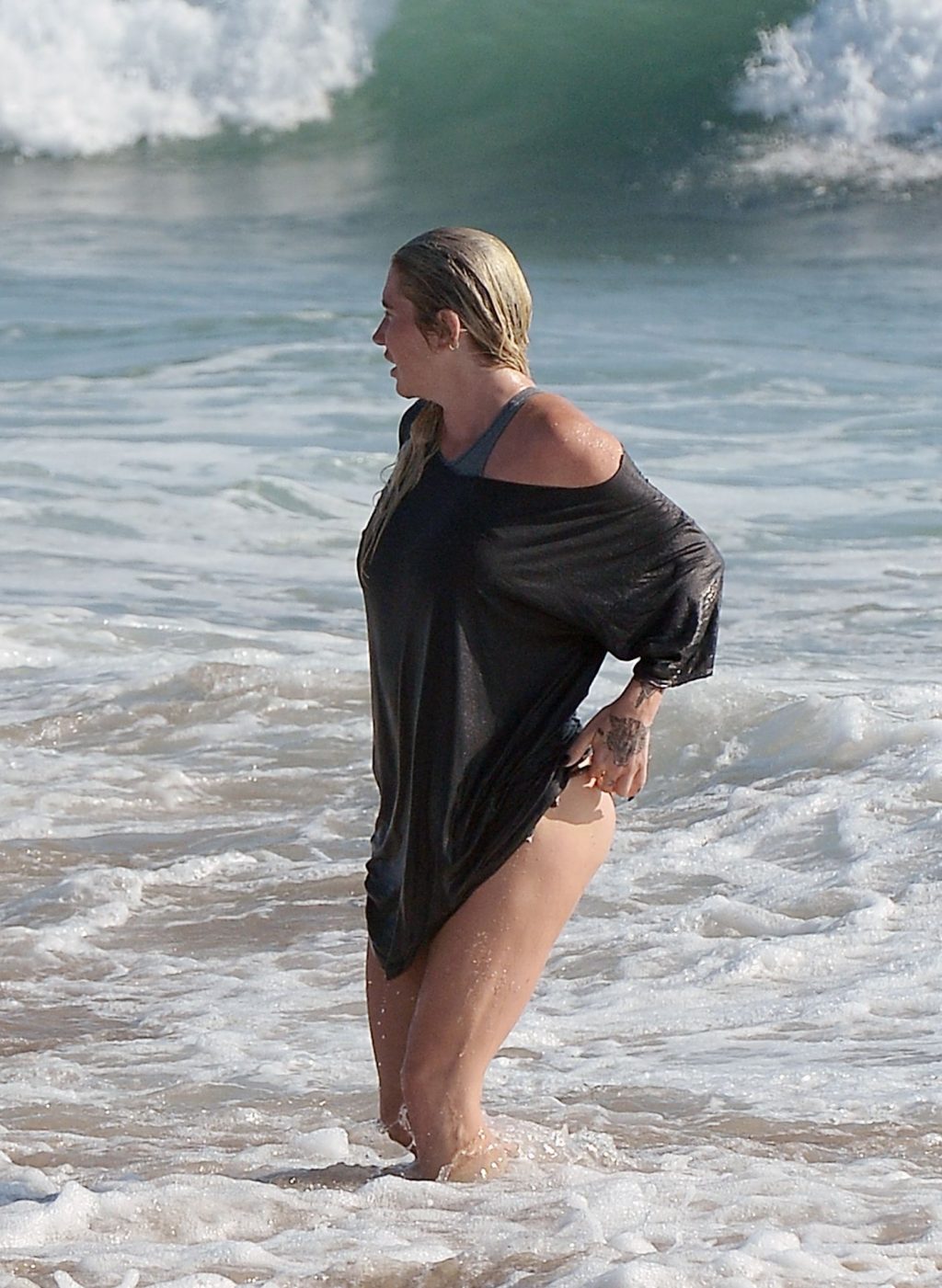 La chanteuse de 34 ans s’est rafraîchie en se baignant dans l’océan, vêtue d’une robe de plage grise et d’un bas de bikini à motifs.