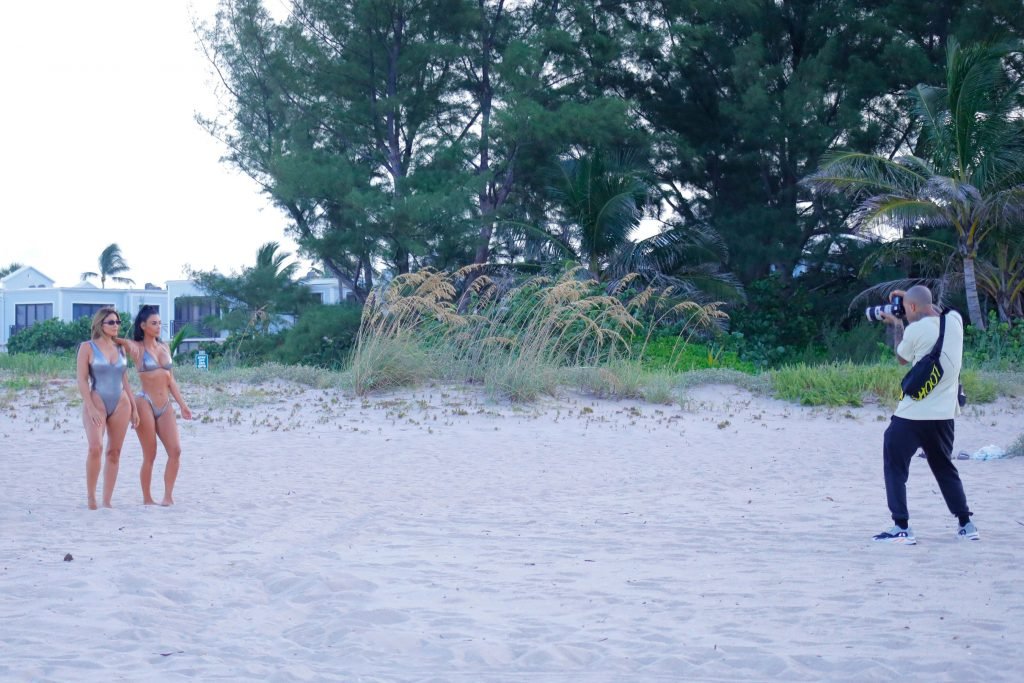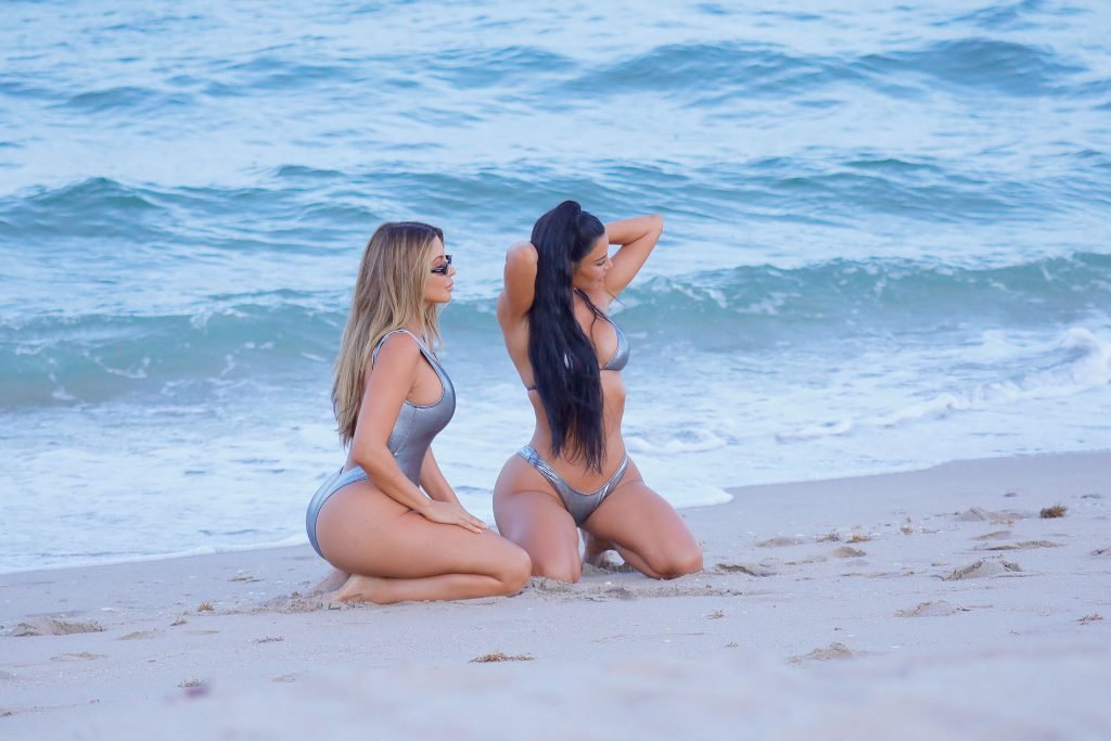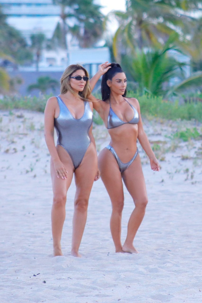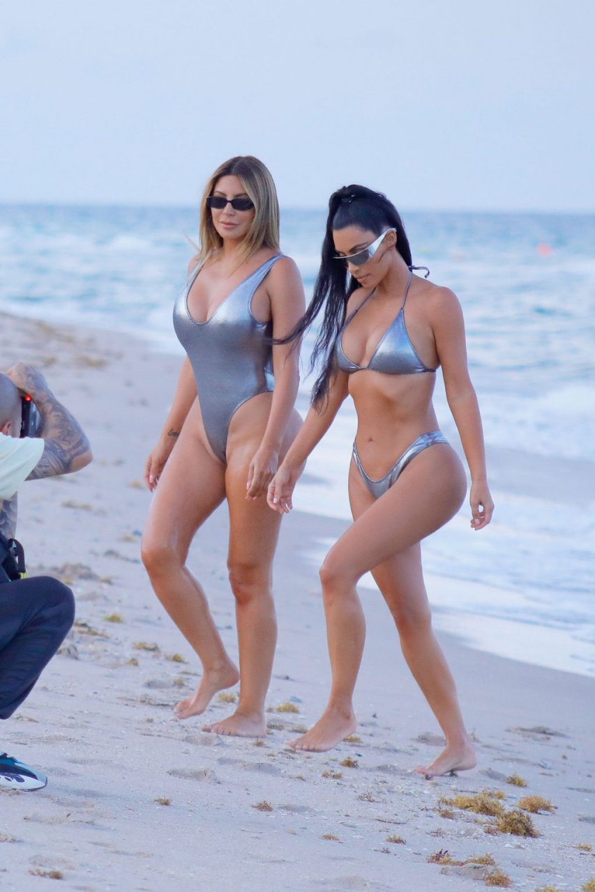 Les amies pulpeuses Kim Kardashian & Larsa Pippen profitent d’une journée en portant des bikinis/maillots de bain argentés assortis lors d’une séance photo à Miami, le 18/08/2018.