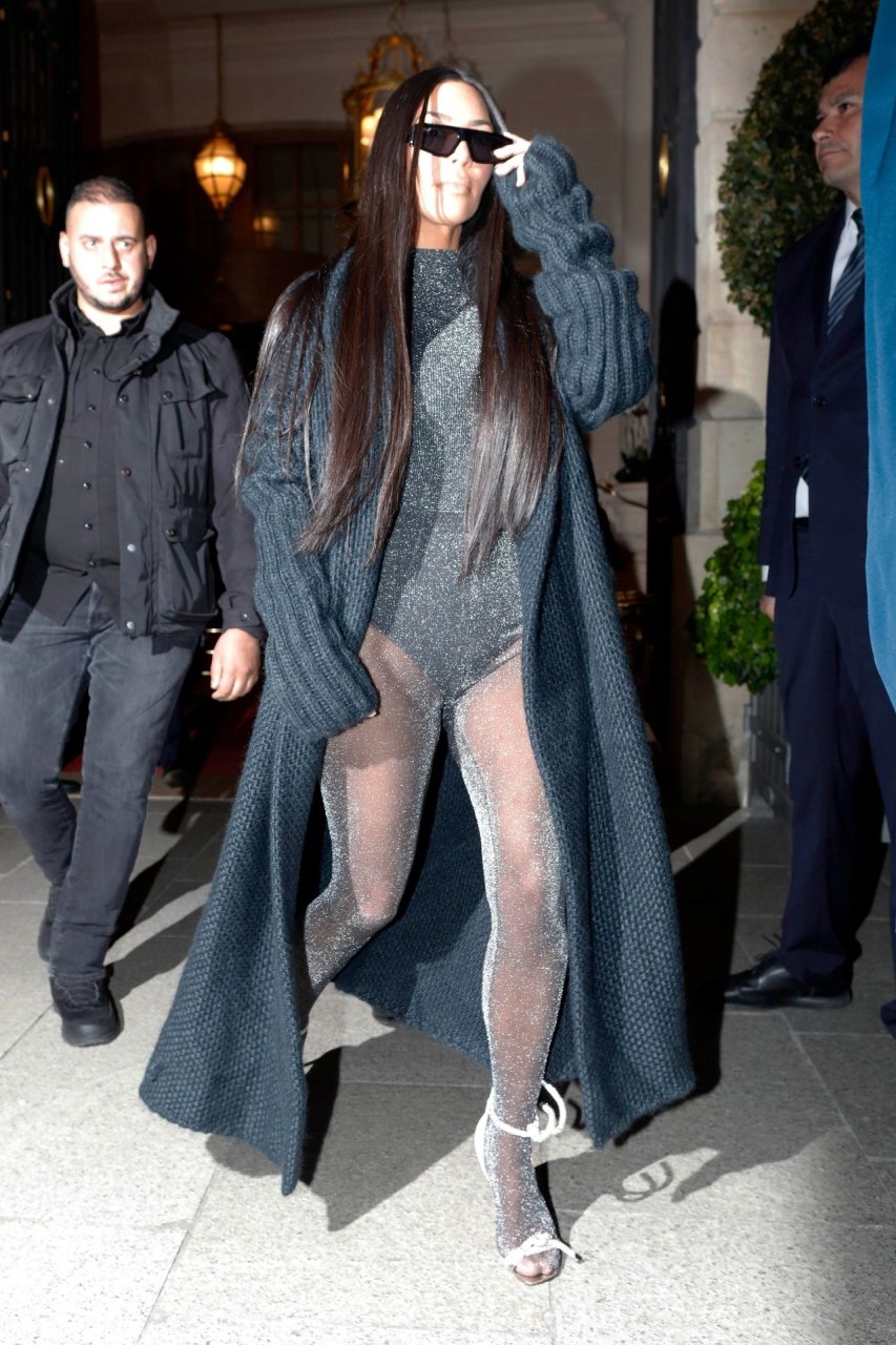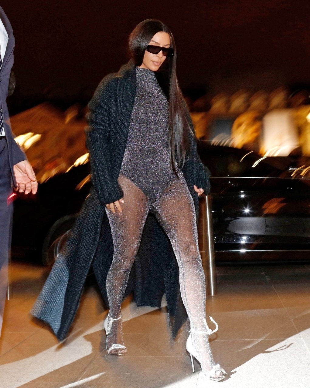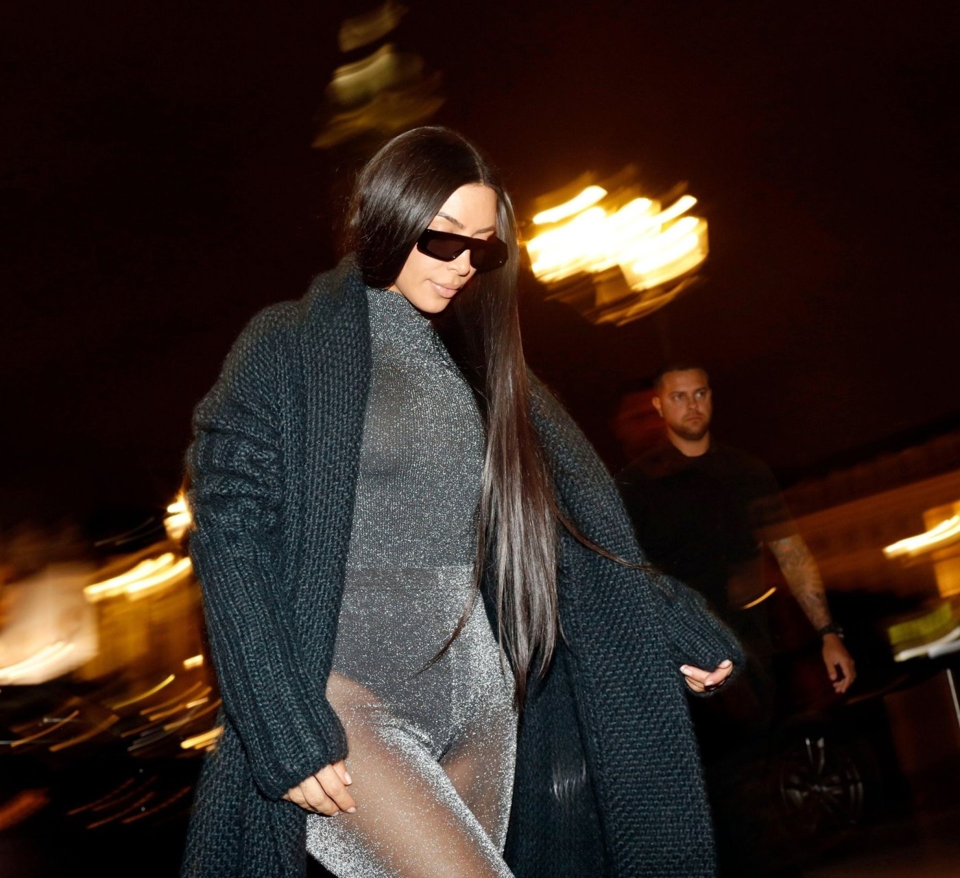 Kim Kardashian photographiée en train de retourner à son hôtel à Paris après avoir dîné au restaurant Ferdi. La star de la télé-réalité portait un manteau maxi en maille avec un justaucorps gris étincelant.