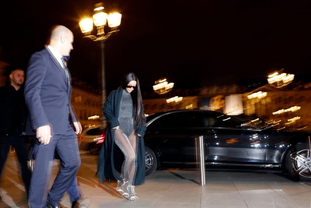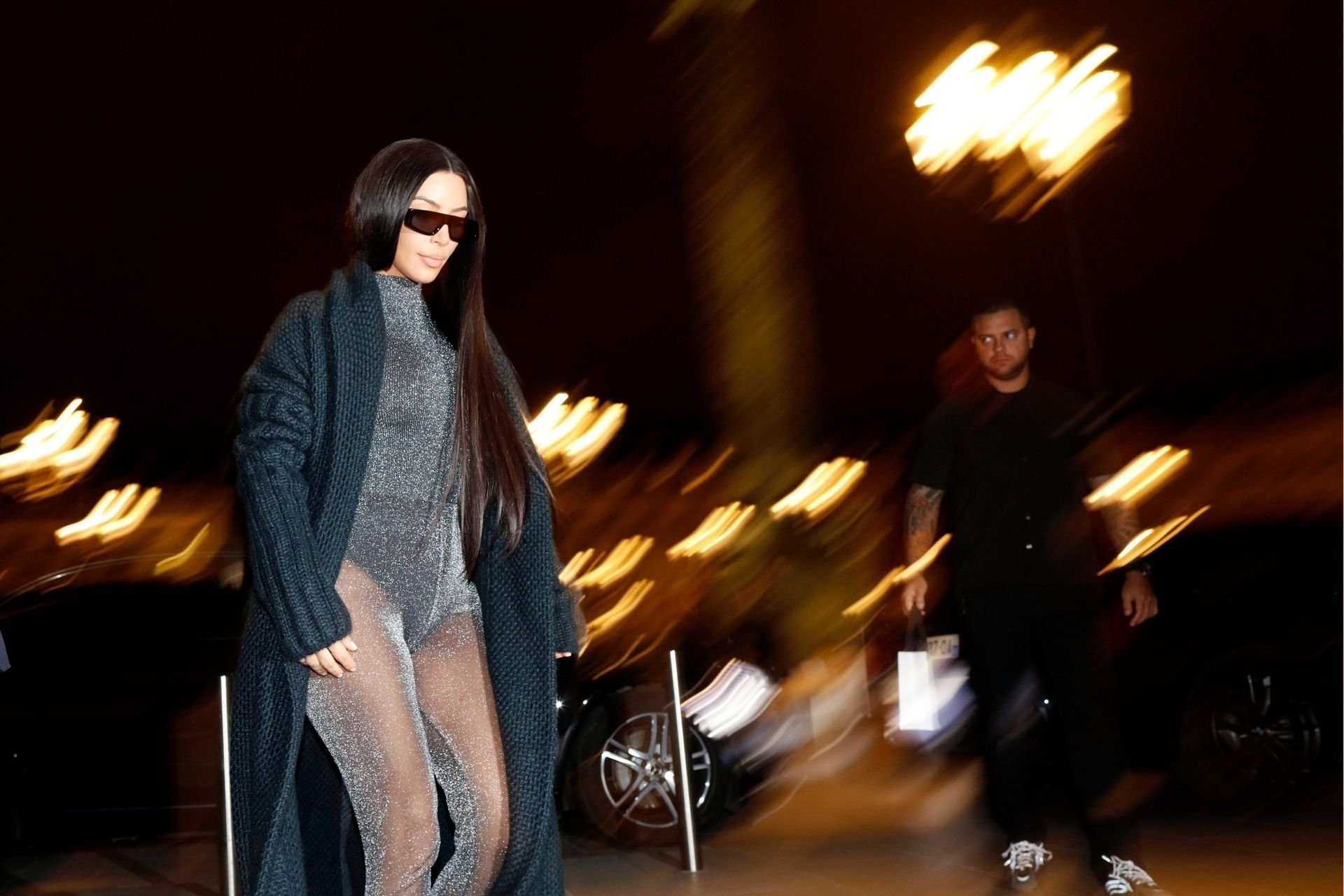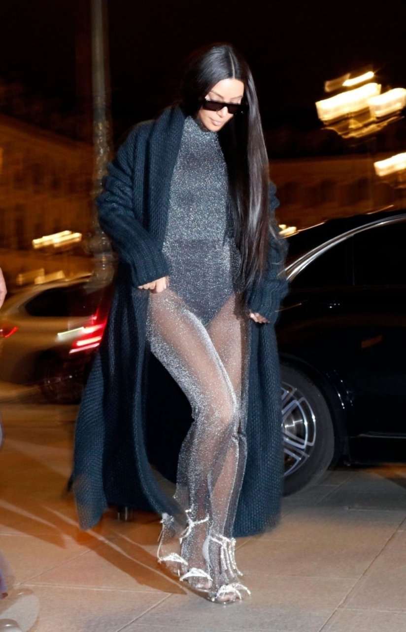 Kim Kardashian photographiée en train de retourner à son hôtel à Paris après avoir dîné au restaurant Ferdi. La star de la télé-réalité portait un manteau maxi en maille avec un justaucorps gris étincelant.