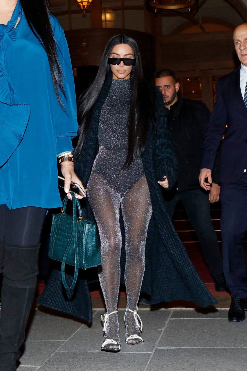 Kim Kardashian exhibe ses célèbres courbes dans un justaucorps gris étincelant en quittant son hôtel à Paris, portant des lunettes de soleil noires et un long manteau noir à motifs, 25/03/2019.
