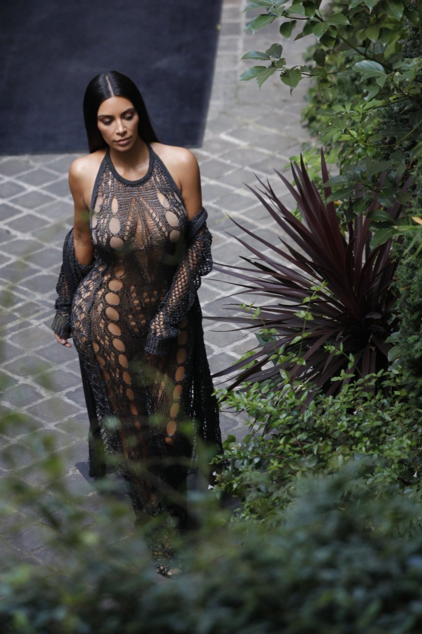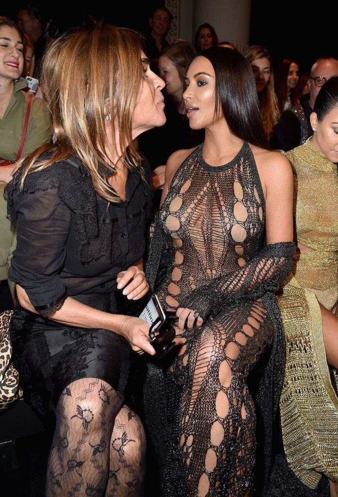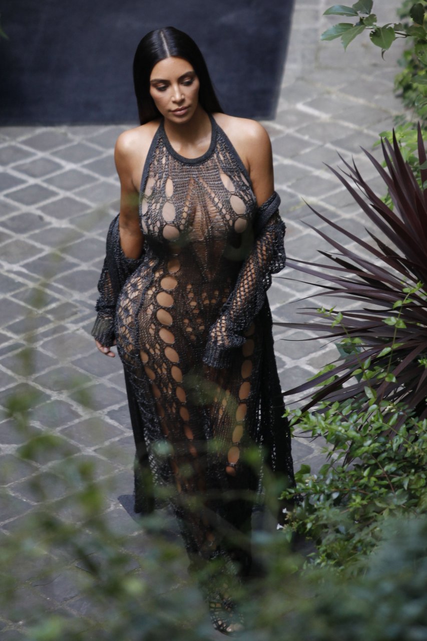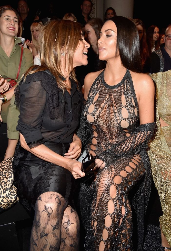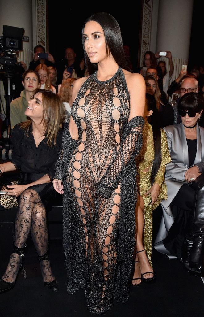 Kim Kardashian assiste au défilé Balmain dans le cadre de la Semaine de la mode féminine printemps/été 2017 à Paris, 29/09/2016. Poitrine tombant jusqu’au ventre… Kim Kardashian est une personnalité américaine de la télévision et des réseaux sociaux, mondaine et mannequin. Âge : 35 ans (21 octobre 1980).