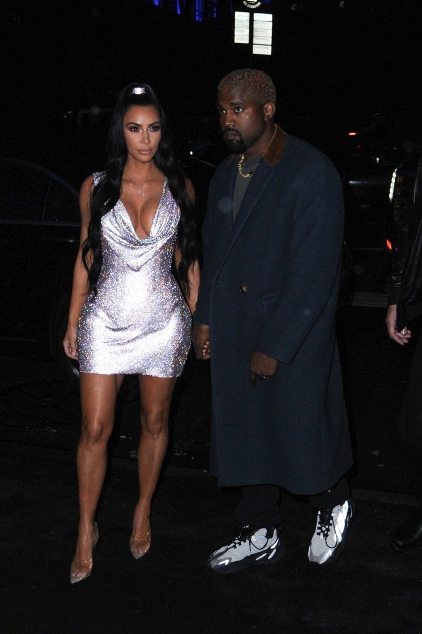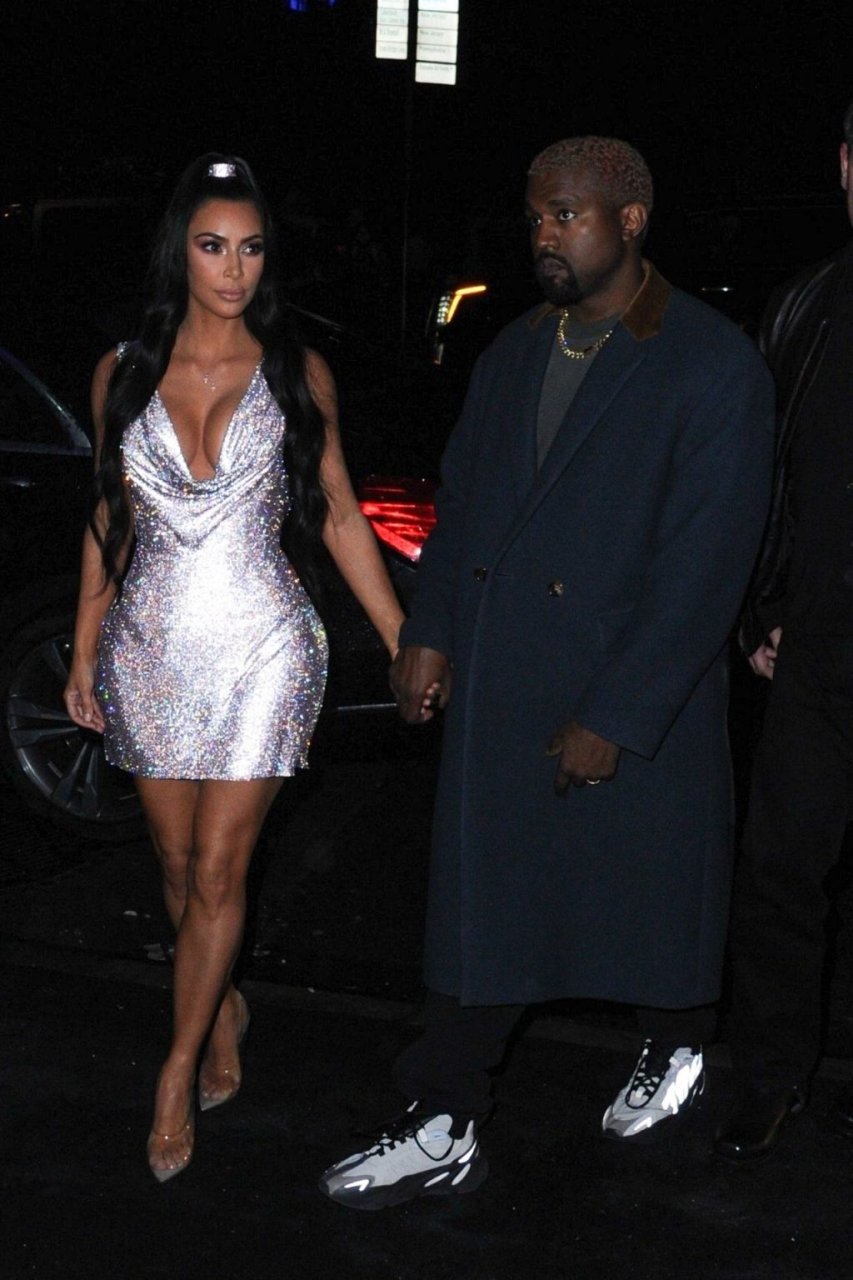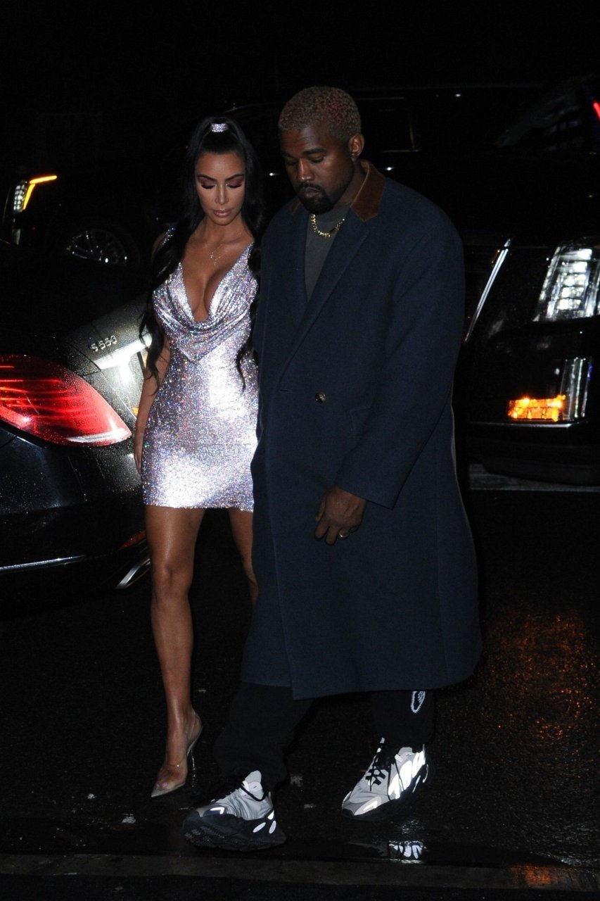 Kim Kardashian et Kanye West arrivent au défilé de mode Versace à New York, le 12/02/2018. Kim n’a pas laissé le froid l’arrêter, exhibant ses courbes dans une mini-robe argentée brillante et des talons transparents Yeezy.