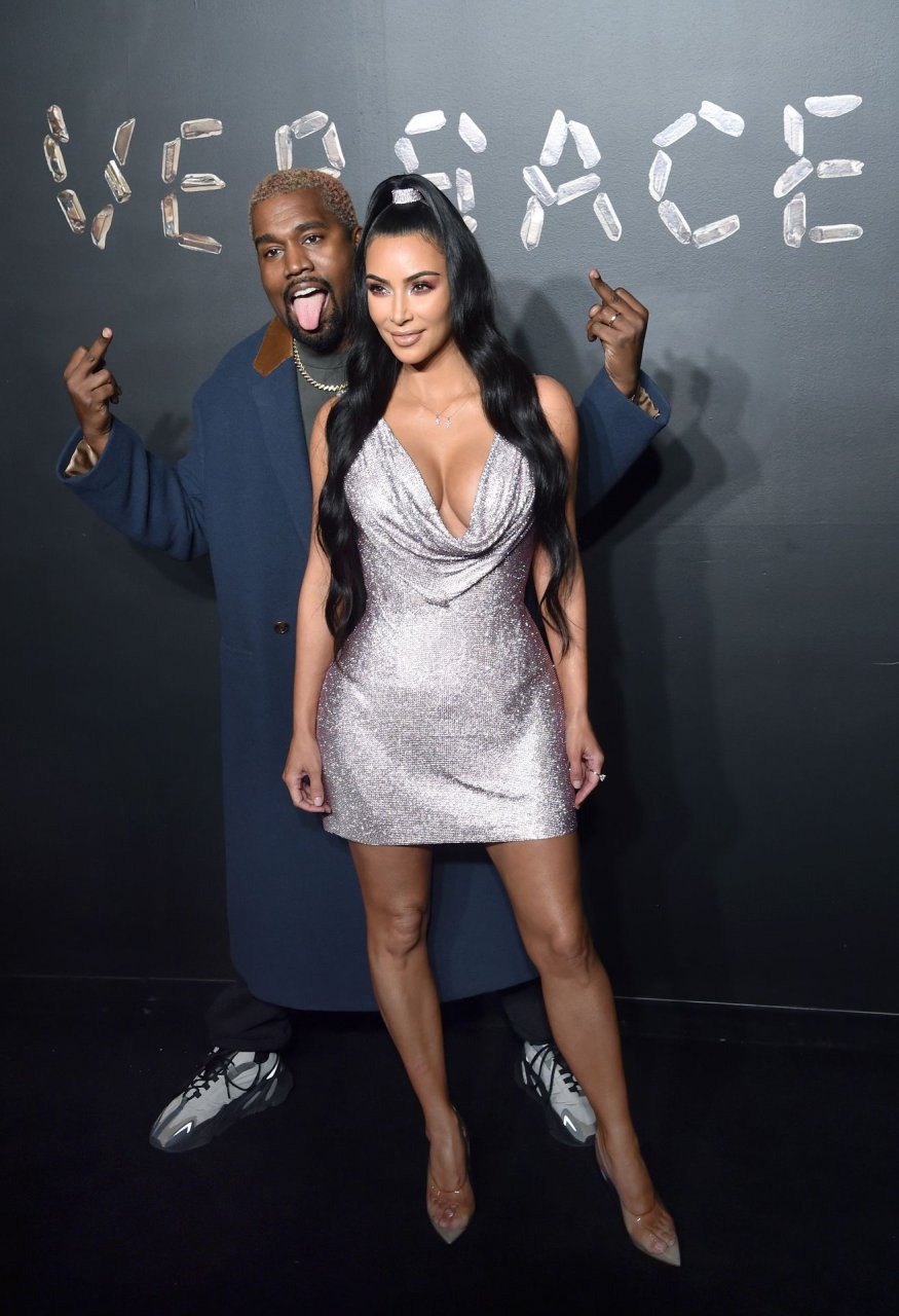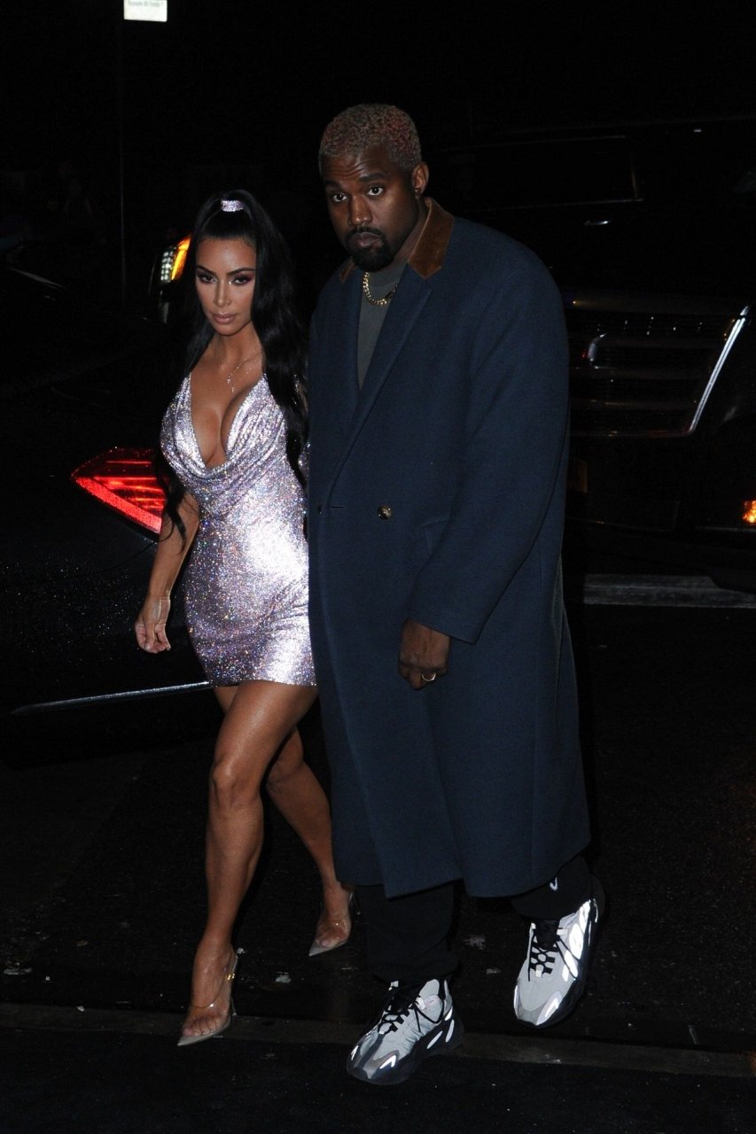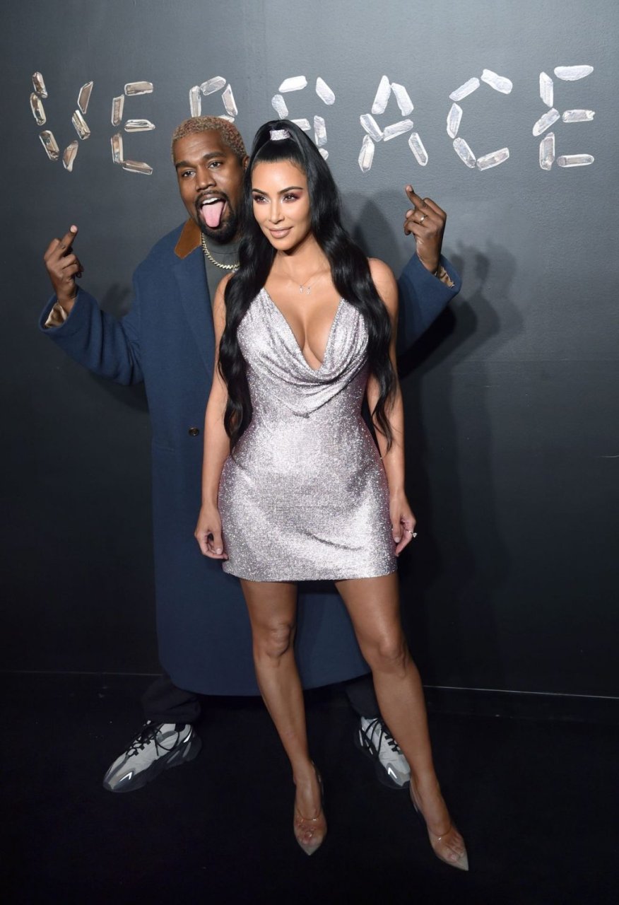 Kim Kardashian et Kanye West arrivent au défilé de mode Versace à New York, le 12/02/2018. Kim n’a pas laissé le froid l’arrêter, exhibant ses courbes dans une mini-robe argentée brillante et des talons transparents Yeezy.