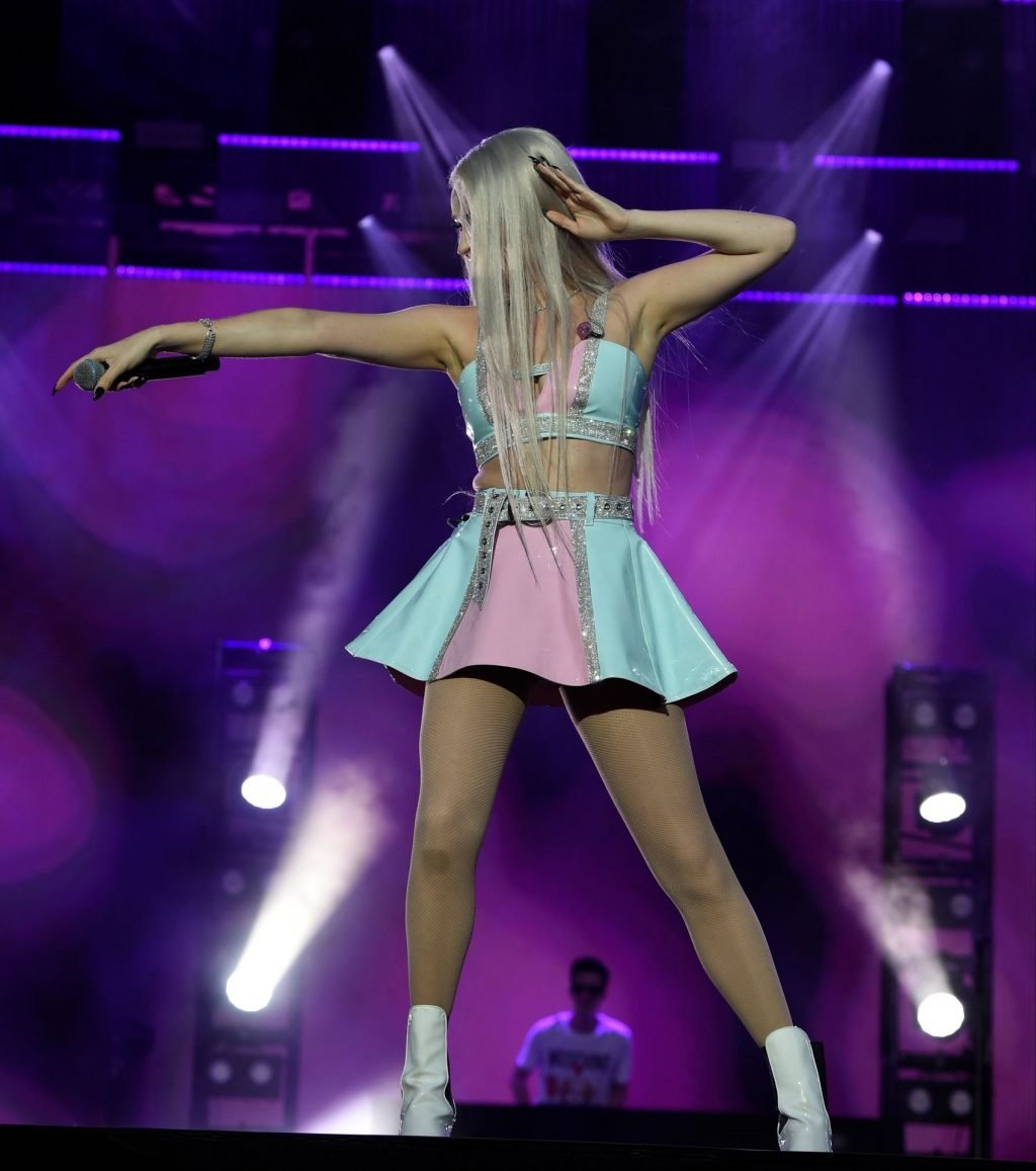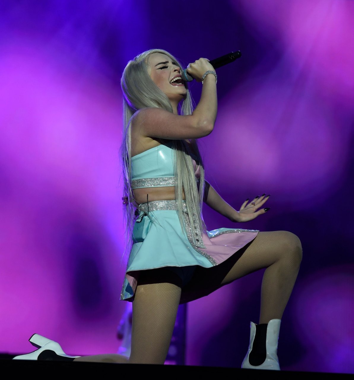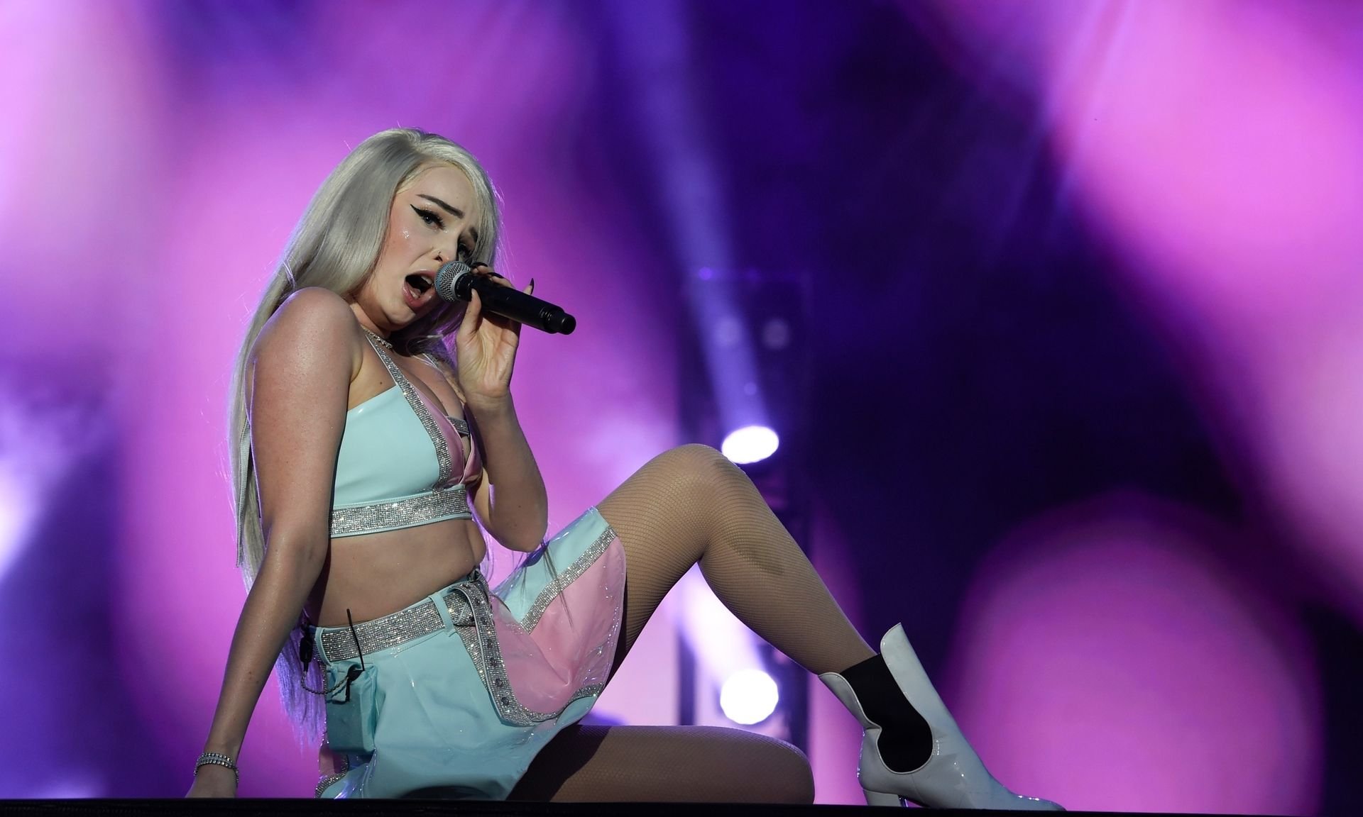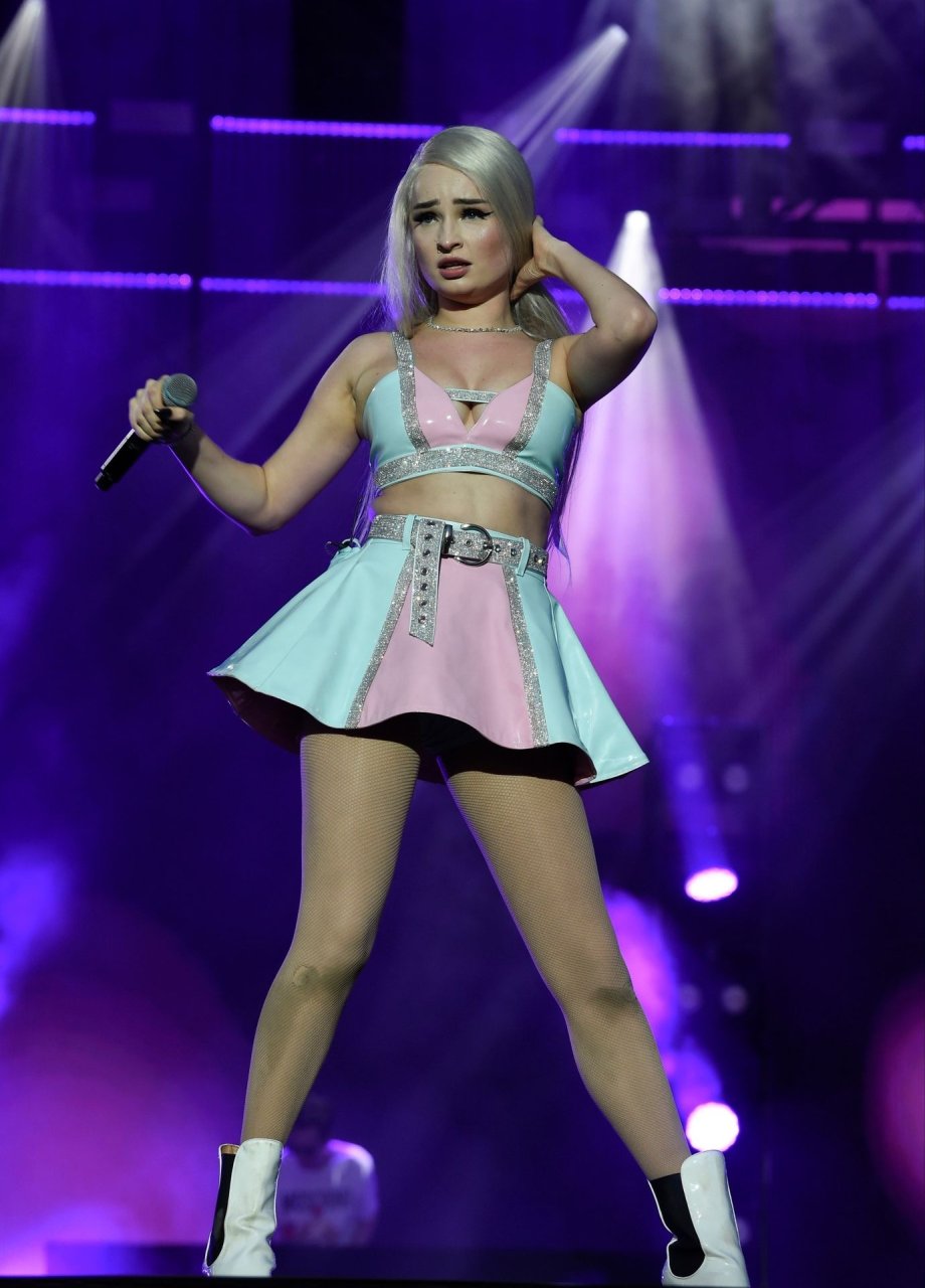 La chanteuse-compositrice allemande Kim Petras a été photographiée dans une robe courte, montrant sa culotte lors d’une performance sur scène au Manchester Pride à Manchester, le 24/08/2019.