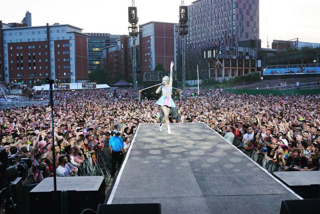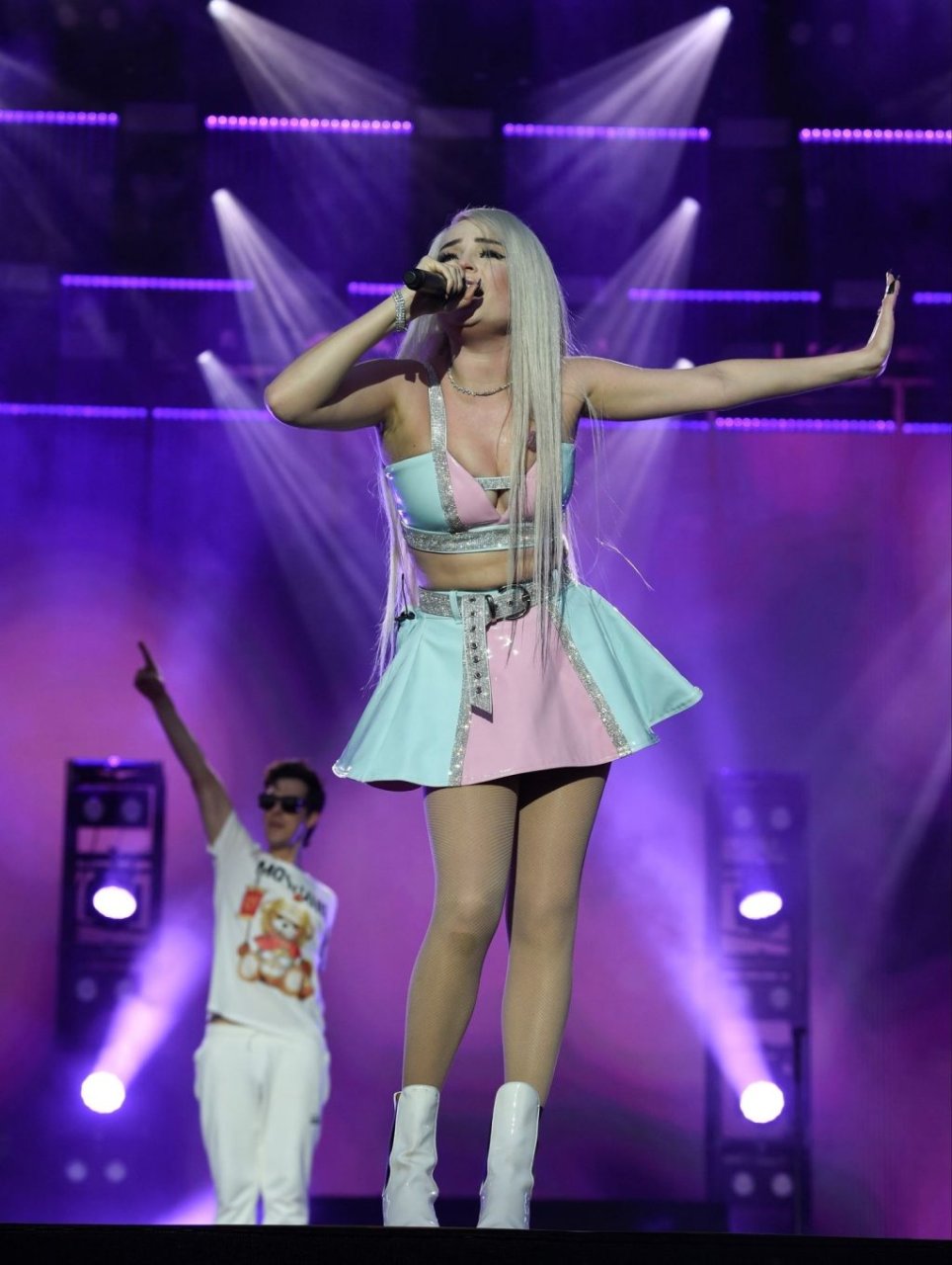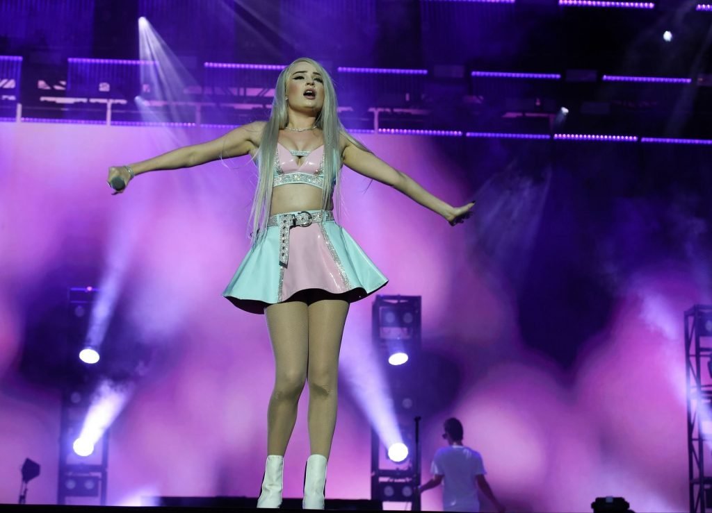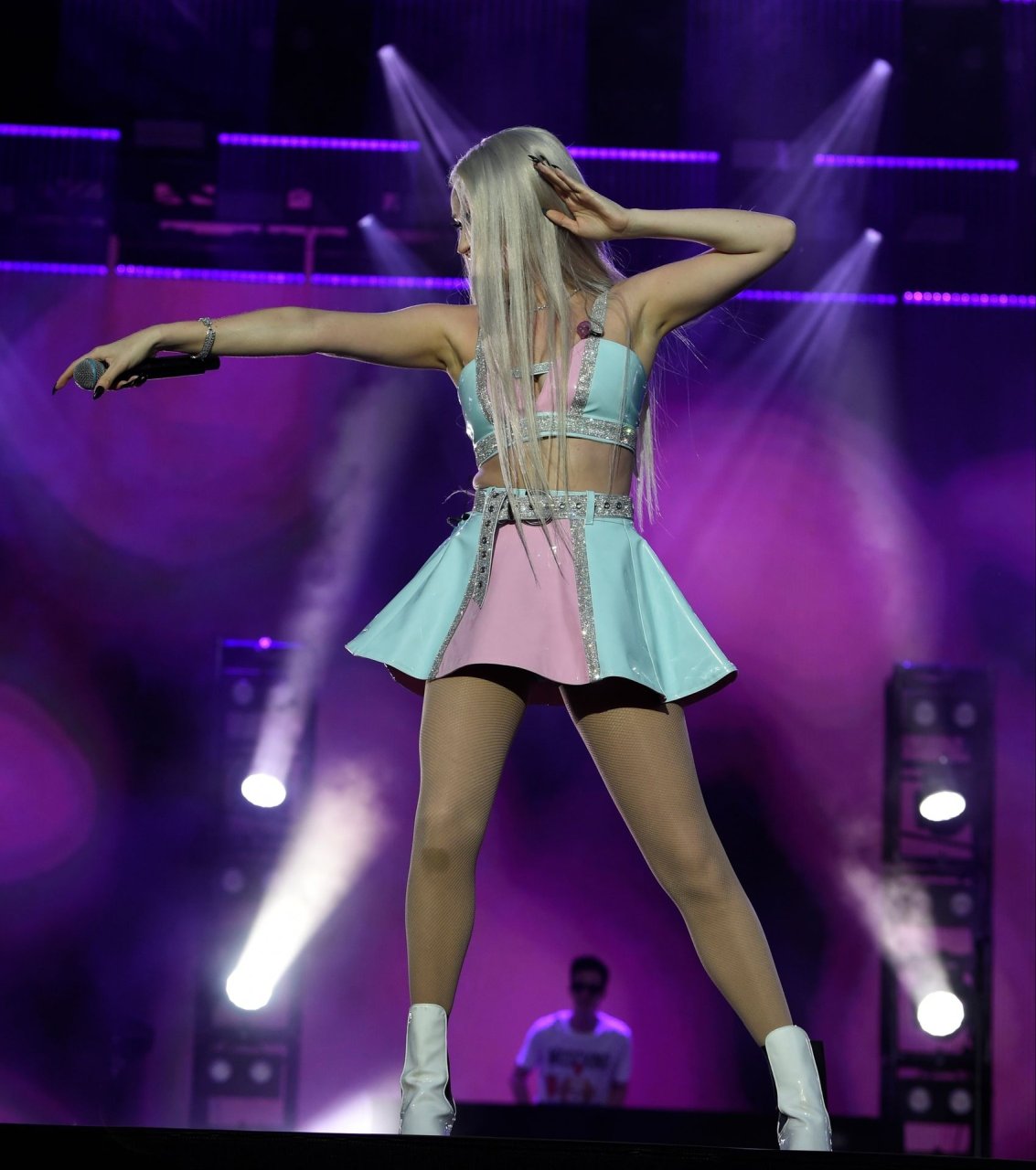 La chanteuse-compositrice allemande Kim Petras a été photographiée dans une robe courte, montrant sa culotte lors d’une performance sur scène au Manchester Pride à Manchester, le 24/08/2019.