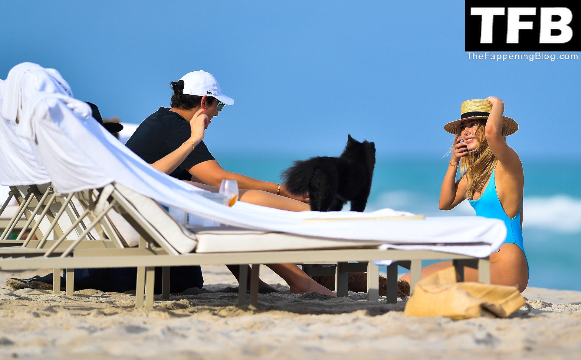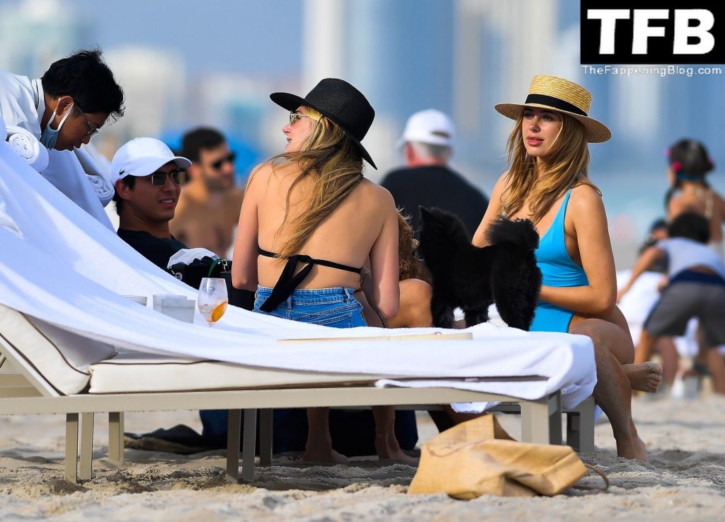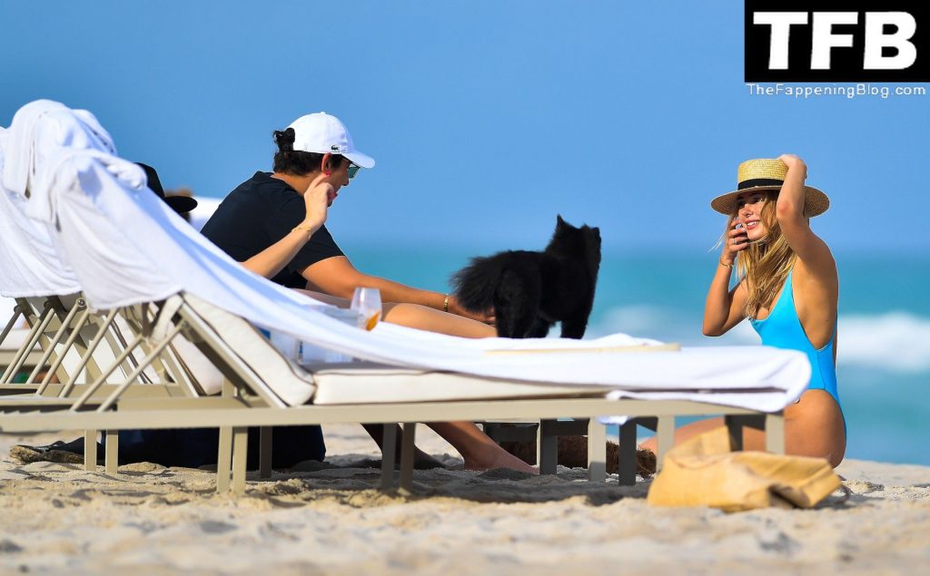 Le mannequin et créatrice de maillots de bain Kimberley Garner met en valeur sa silhouette incroyable dans un maillot de bain bleu moulant alors qu’elle gambade dans la mer lors d’un voyage à Miami, 19/12/2021.