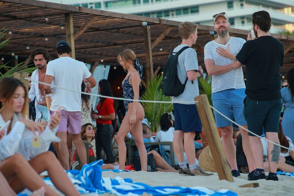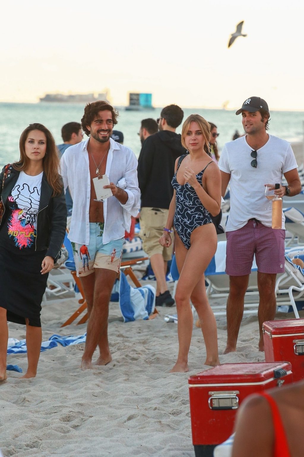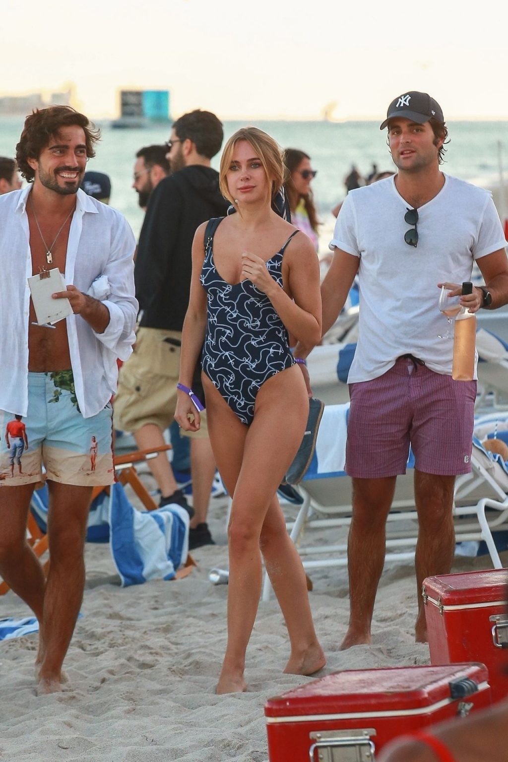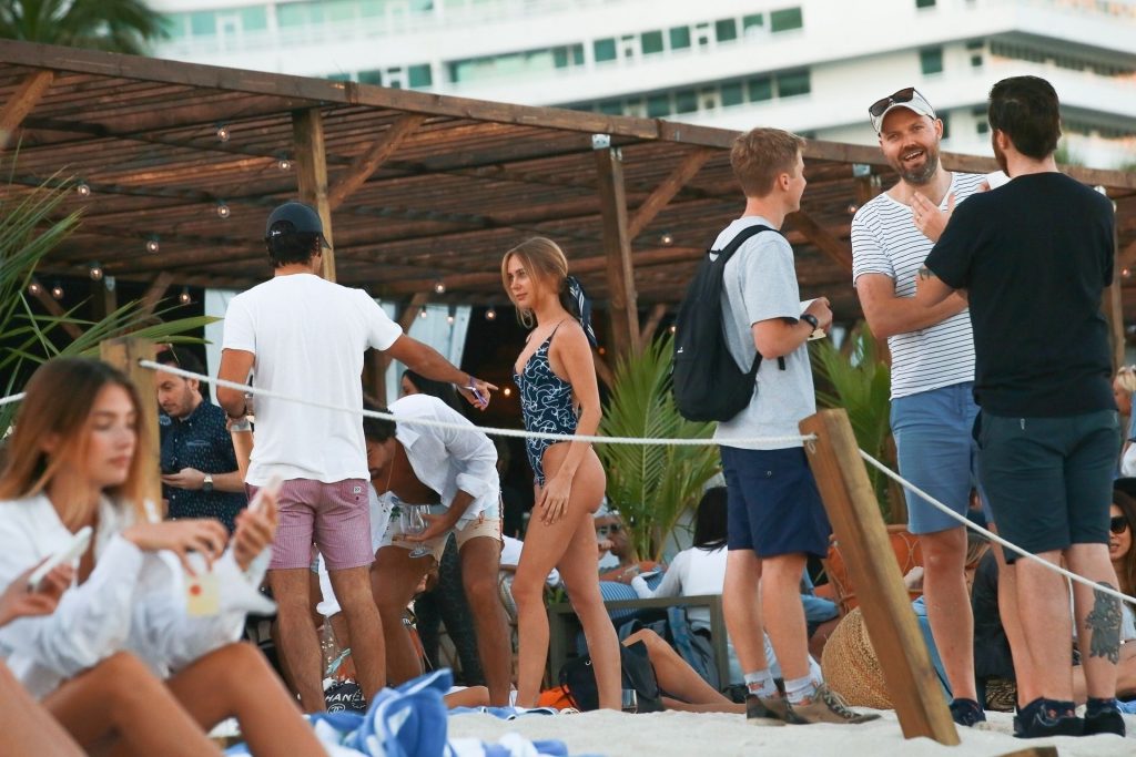 La créatrice anglaise de maillots de bain Kimberley Garner montre sa silhouette athlétique dans un une-pièce bleu alors qu’elle profite d’un après-midi détente avec des amis sur la plage de Miami, 12/06/2019.