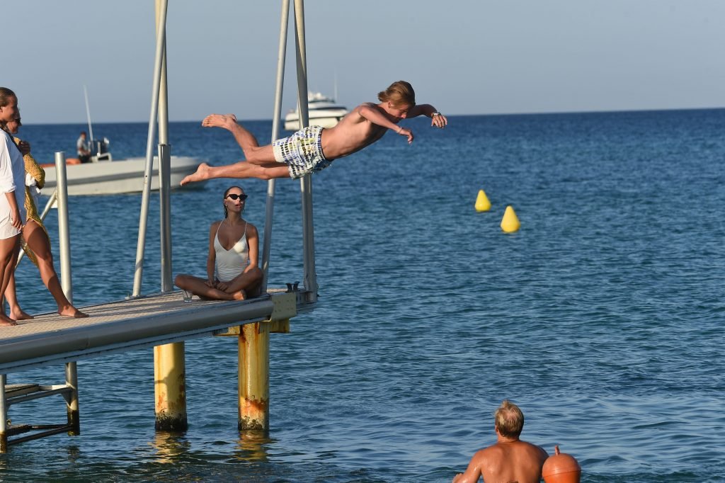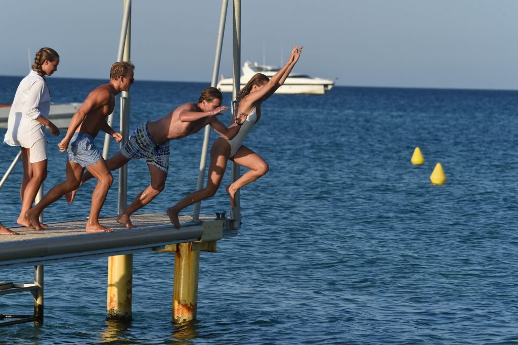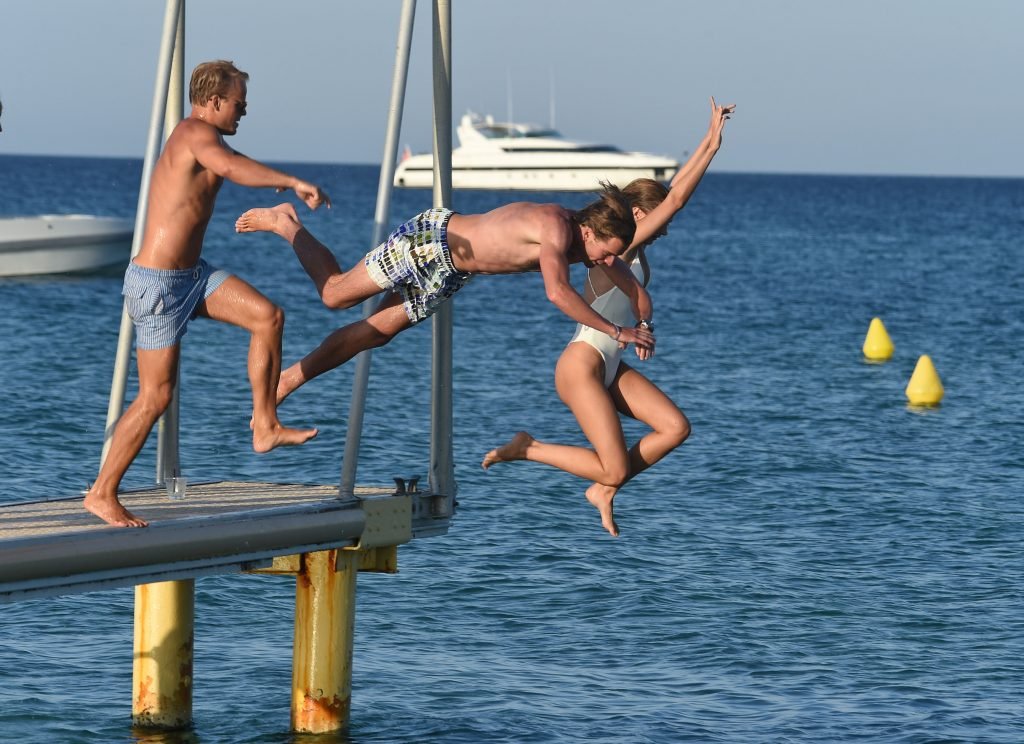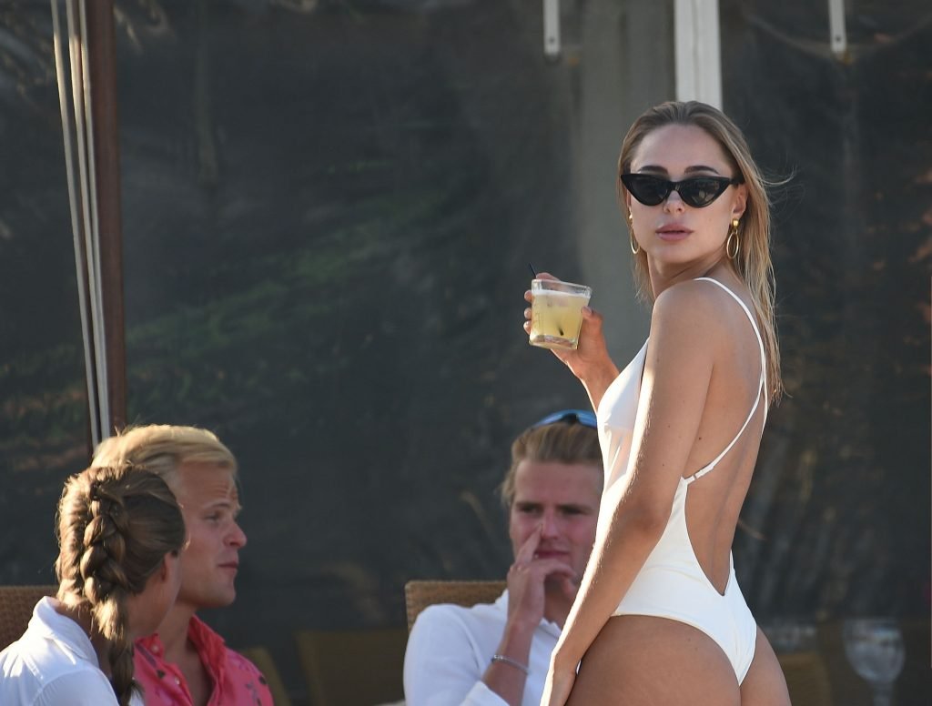 Kimberley Garner profite du soleil sur la plage à Saint-Tropez, France, 22/07/2018. Elle a été vue dans un petit maillot de bain blanc, profitant de ses vacances d’été avec des amis.