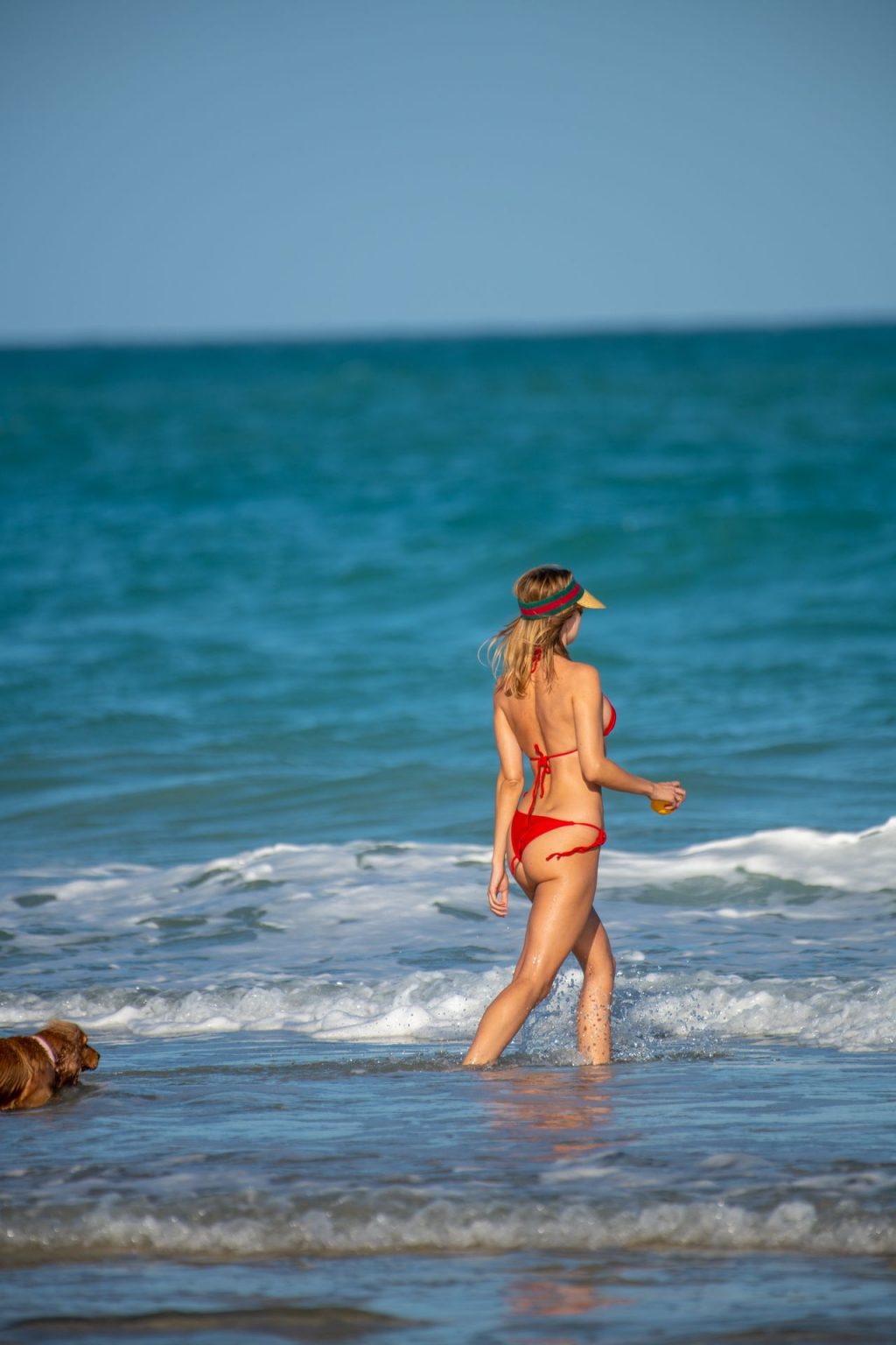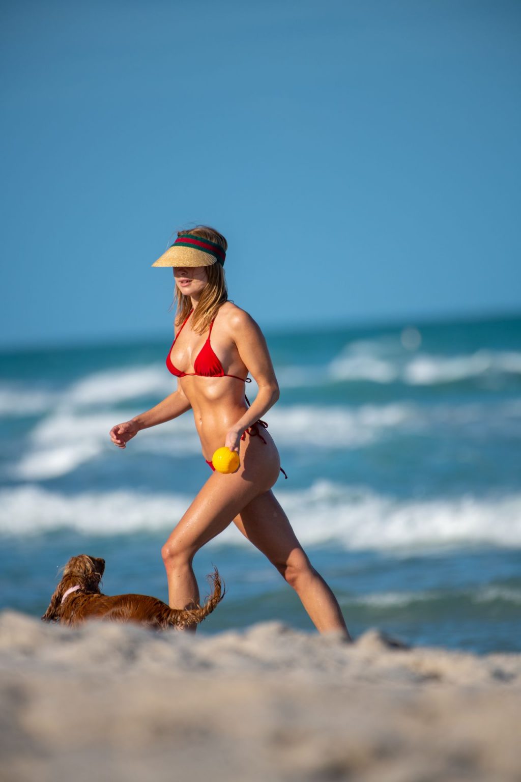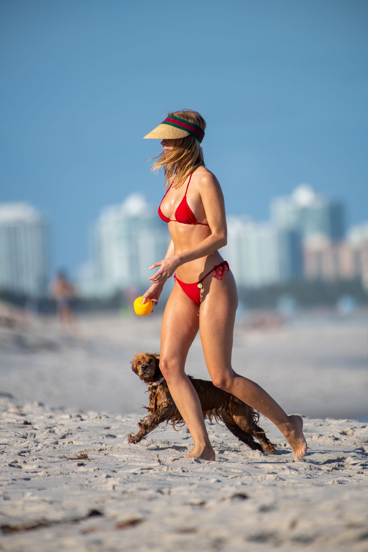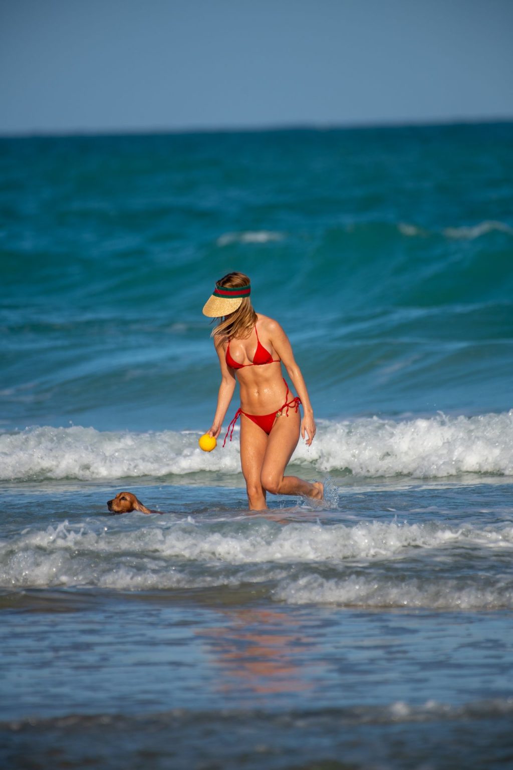 Kimberley Garner est vue en train de profiter d’une journée avec son chien sur la plage de Miami, le 14/01/2020. Elle porte un bikini rouge et une visière Gucci.