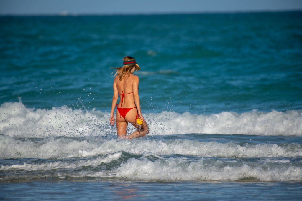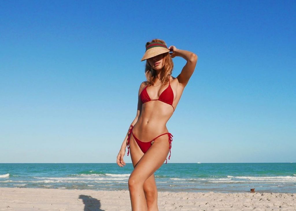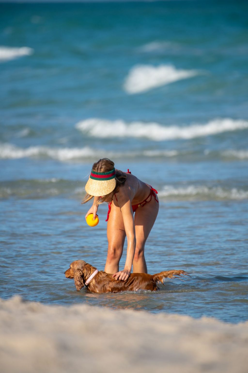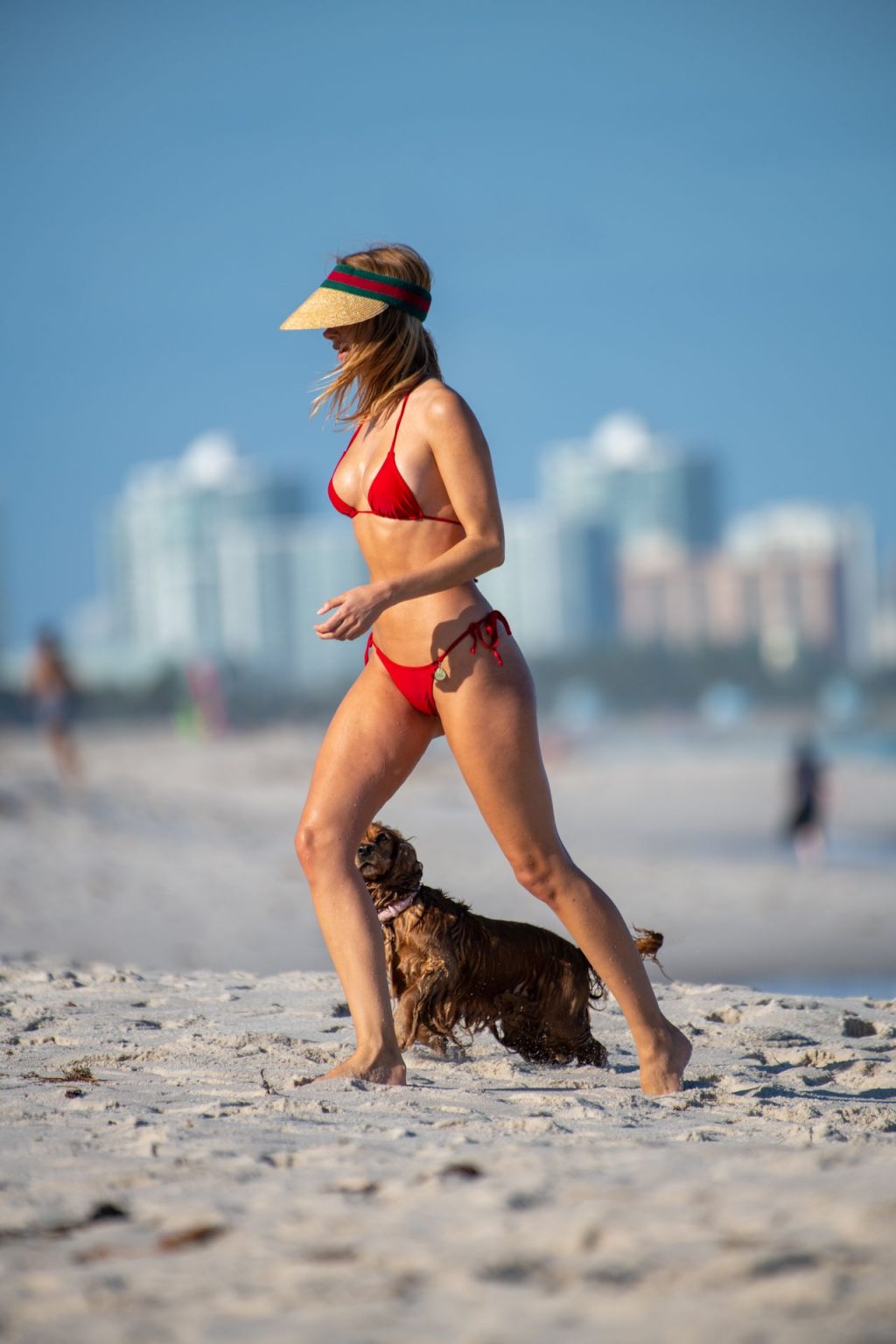 Kimberley Garner est vue en train de profiter d’une journée avec son chien sur la plage de Miami, le 14/01/2020. Elle porte un bikini rouge et une visière Gucci.