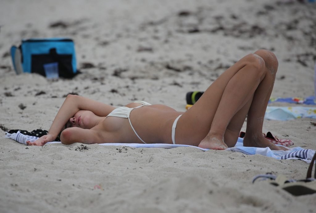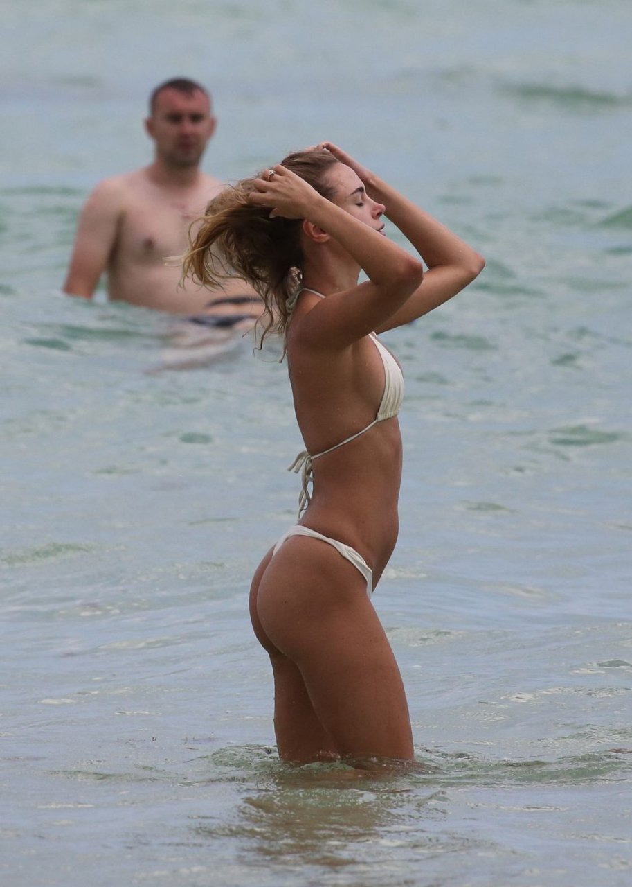 La bombe britannique Kimberley Garner porte un bikini blanc de sa propre ligne alors qu’elle se détend sur la plage à Miami, 02/04/2019.