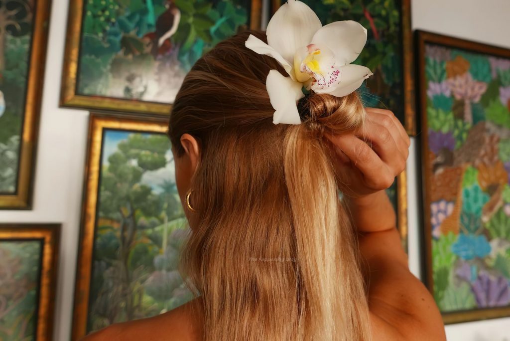 Kimberley Garner pose dans un bikini cygne bébé blanc d’une nouvelle collection de maillots de bain, mettant en valeur son beau corps (mars 2021).