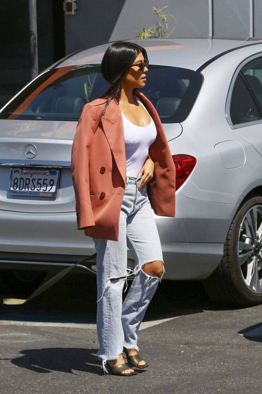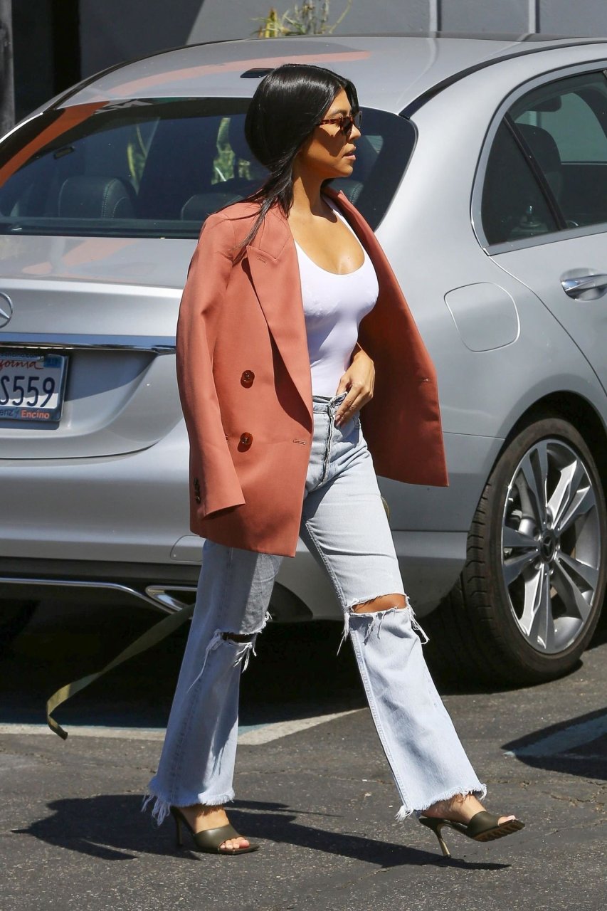 Kourtney Kardashian a été vue quittant le studio à Los Angeles, le 20/09/2019. La star de KUWTK porte un jean et un haut blanc assorti d’une veste corail élégante.