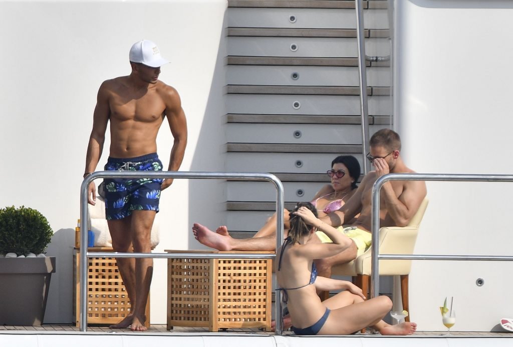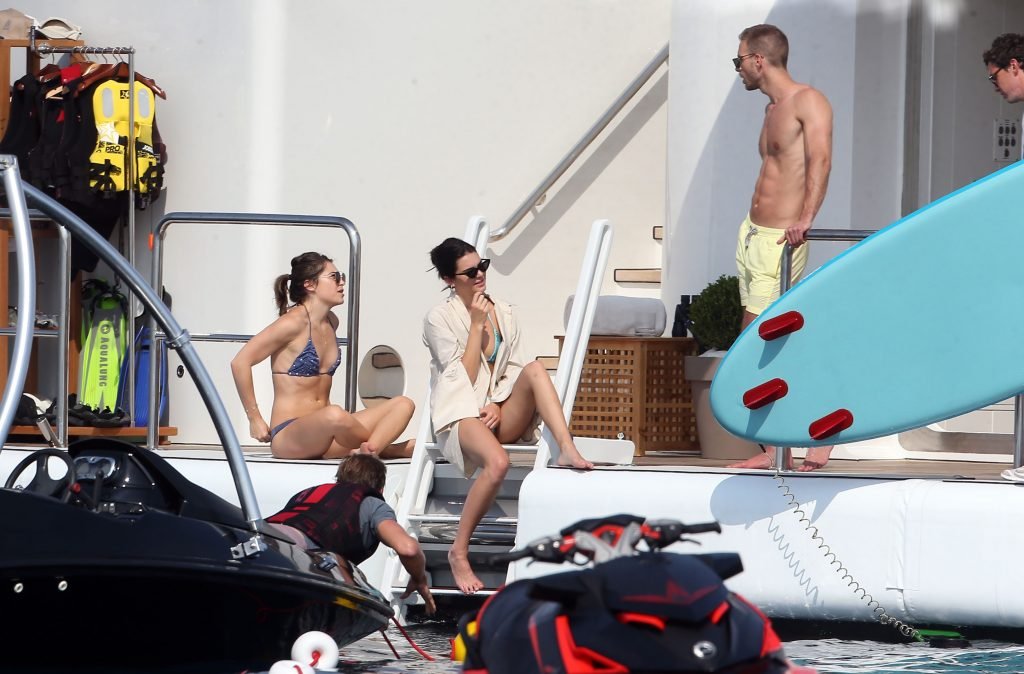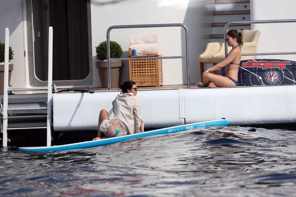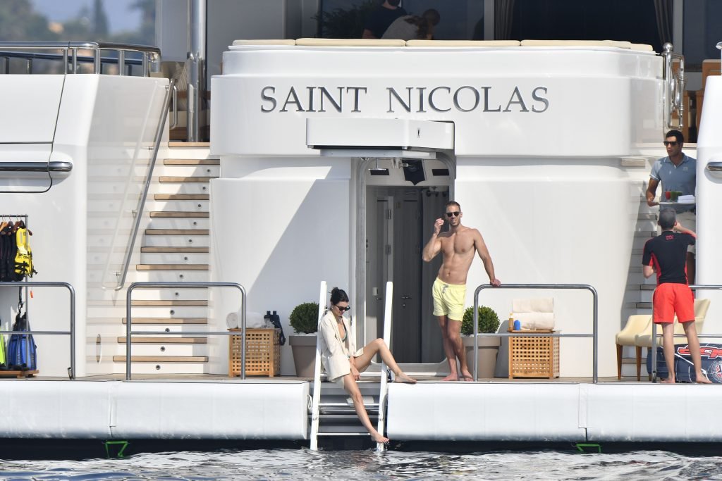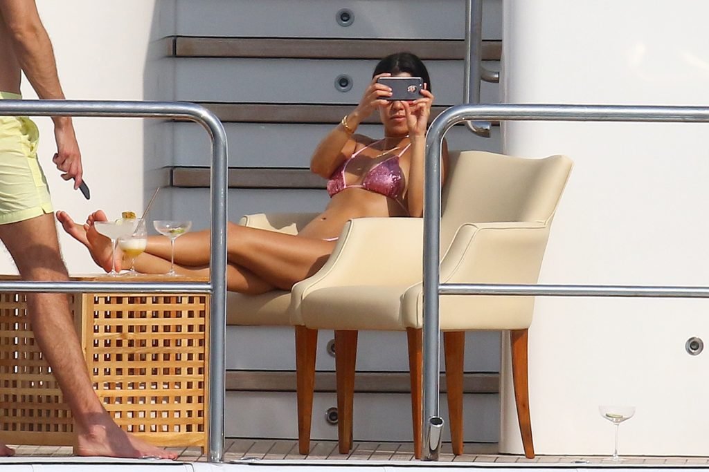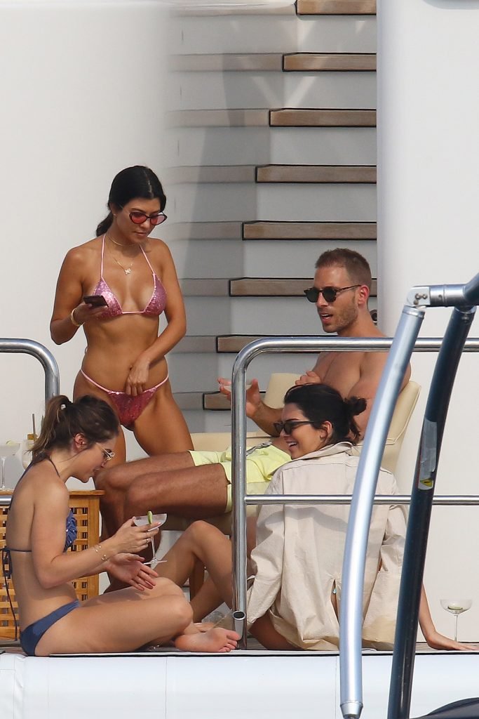Kourtney Kardashian et Kendall Jenner passent un bon moment sur un yacht à Antibes pendant le festival de Cannes, le 25/05/2017. Kourtney Kardashian est une star américaine de l’émission ‘Keeping Up with the Kardashians’, socialite, mannequin. Âge : 38 ans.