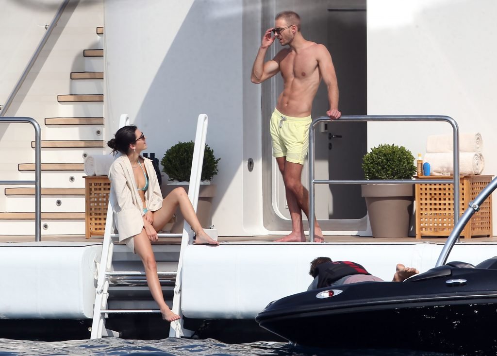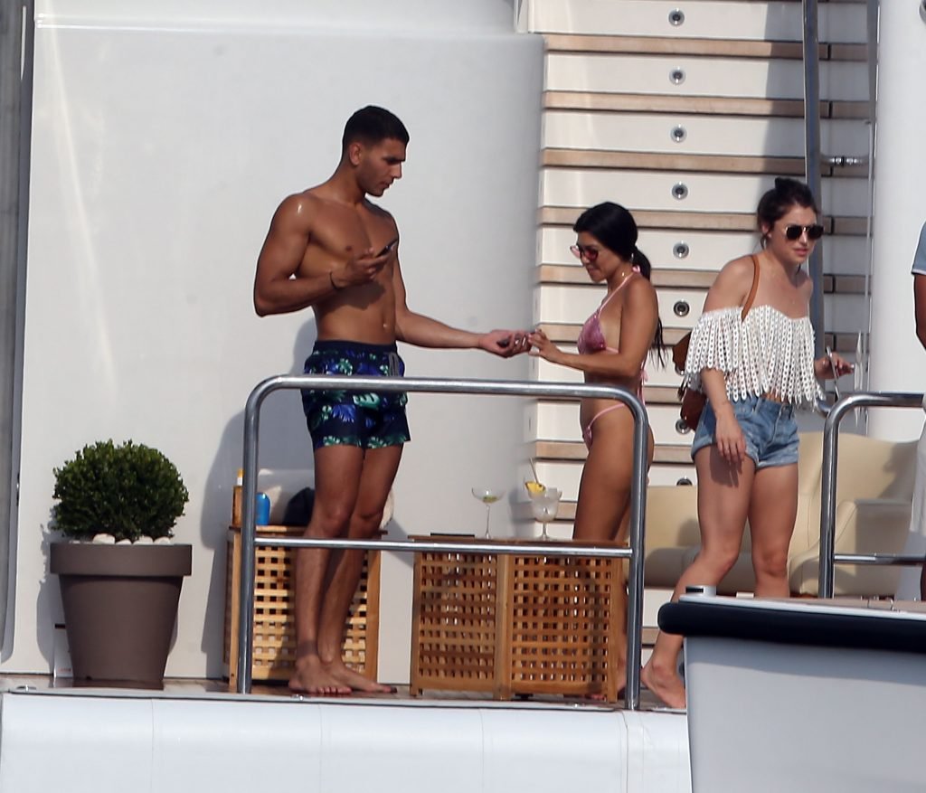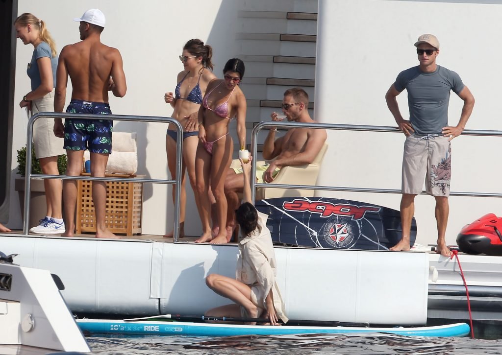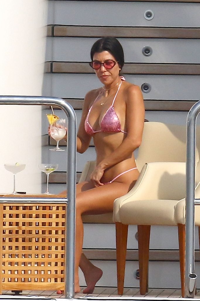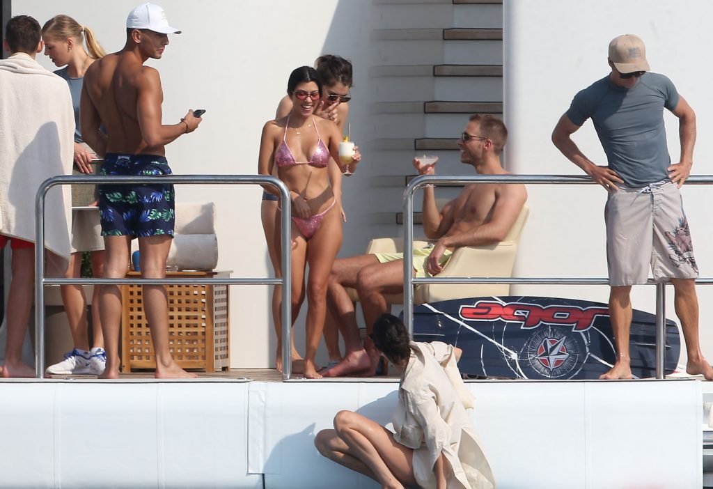 Kourtney Kardashian et Kendall Jenner passent un bon moment sur un yacht à Antibes pendant le festival de Cannes, le 25/05/2017. Kourtney Kardashian est une star américaine de l’émission ‘Keeping Up with the Kardashians’, socialite, mannequin. Âge : 38 ans.
