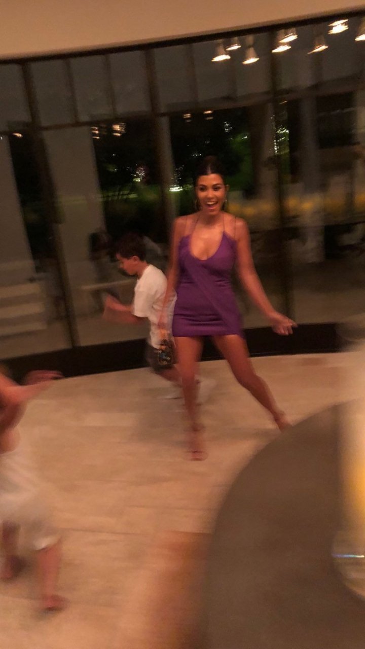 Kourtney Kardashian arrive à la fête d’anniversaire des 21 ans de sa petite sœur Kylie Jenner à West Hollywood, le 09/08/2018. Kourtney Kardashian (39 ans) a montré ses jambes sexy et son décolleté dans une robe violette.
