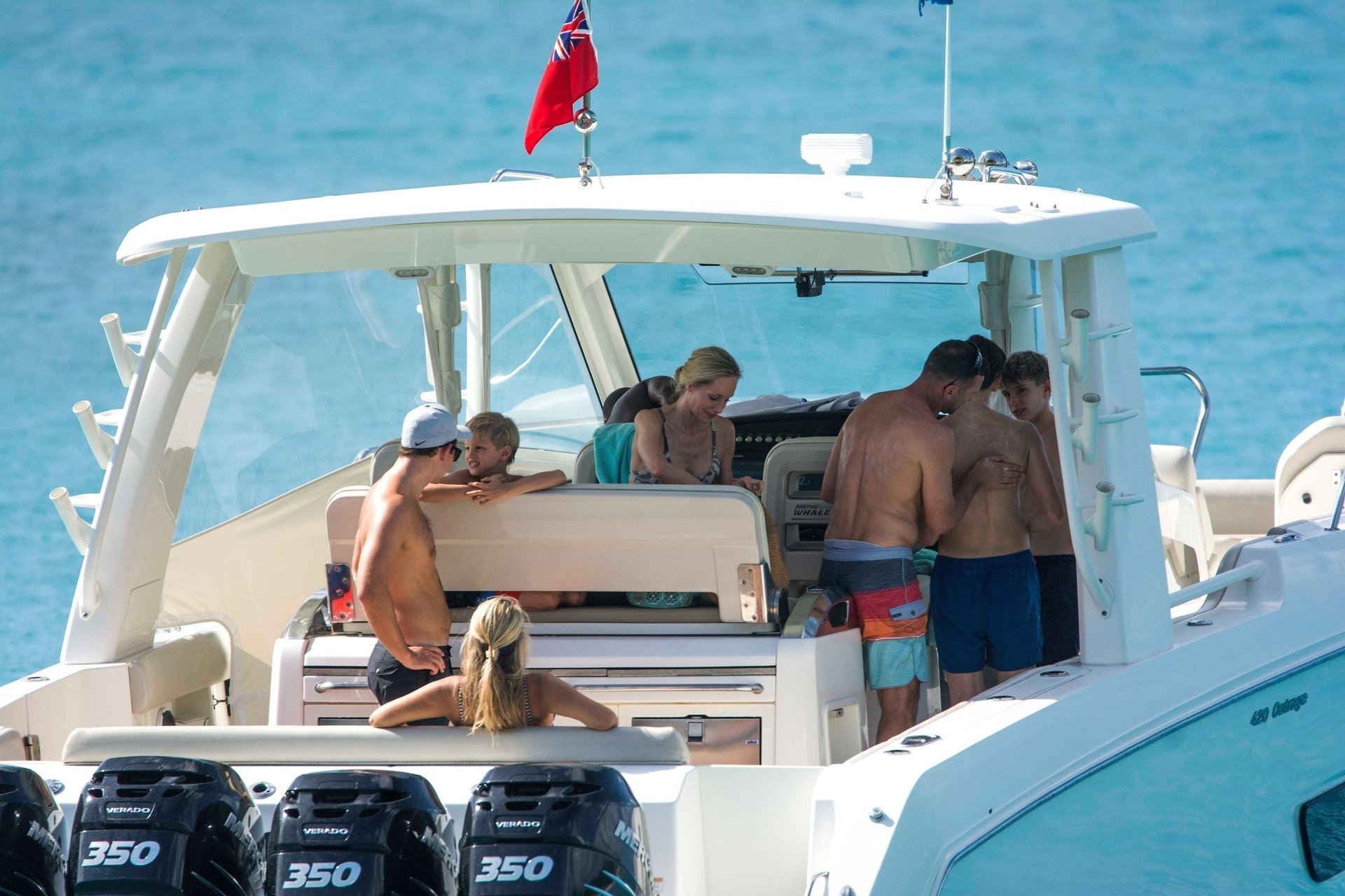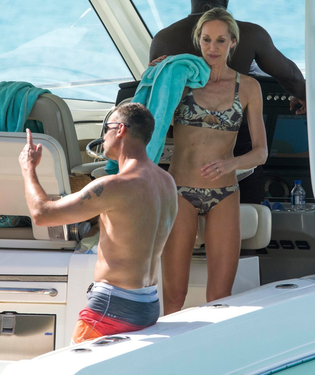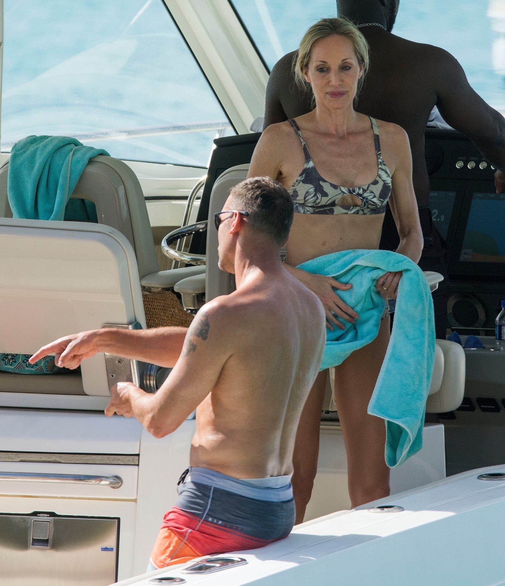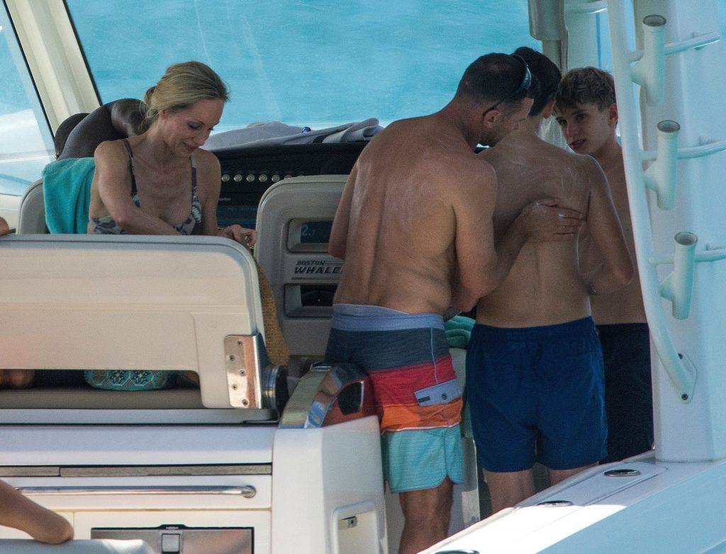 La légende du football ukrainien Andriy Shevchenko et sa femme Kristen Pazik profitent d’une journée en mer sur un bateau à la Barbade, 20/10/2019.