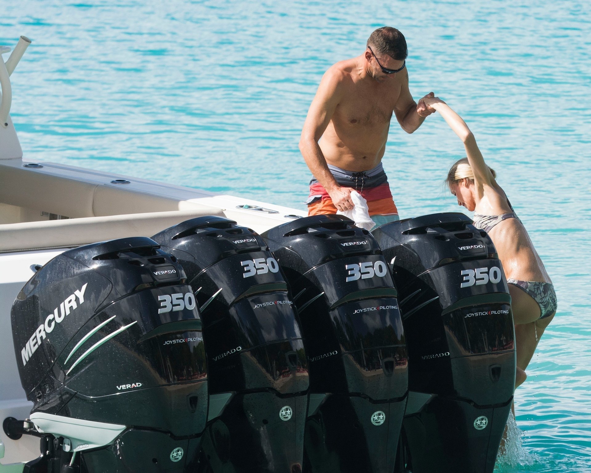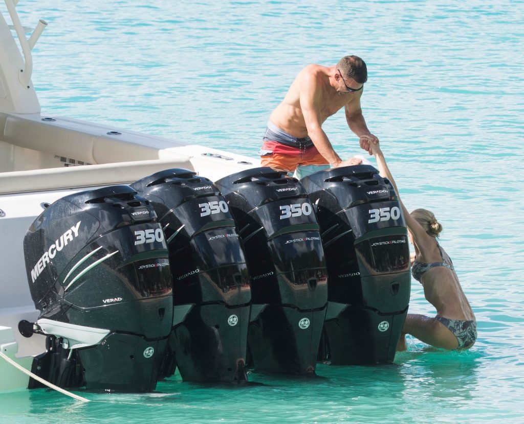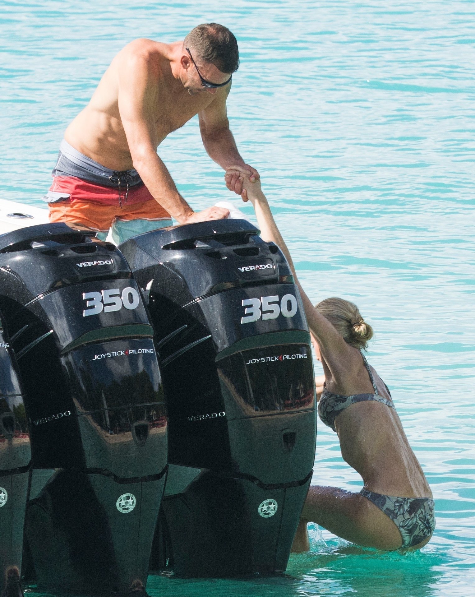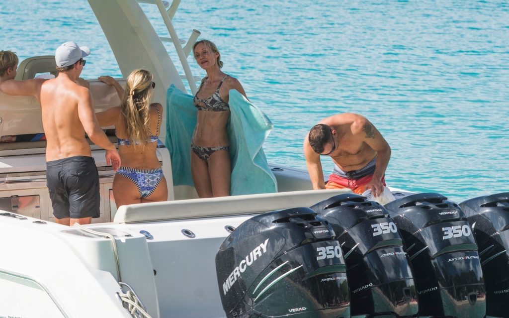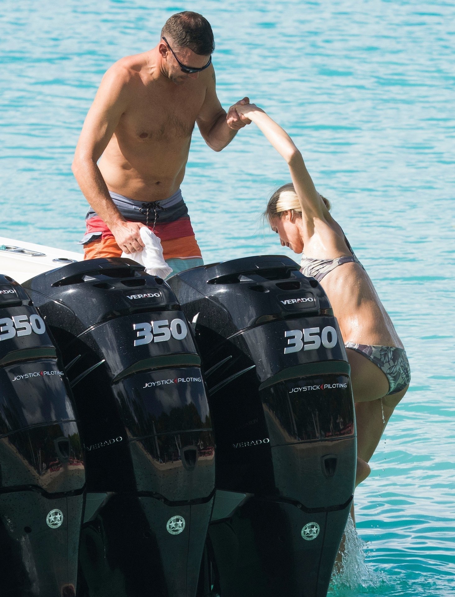 La légende du football ukrainien Andriy Shevchenko et sa femme Kristen Pazik profitent d’une journée en mer sur un bateau à la Barbade, 20/10/2019.