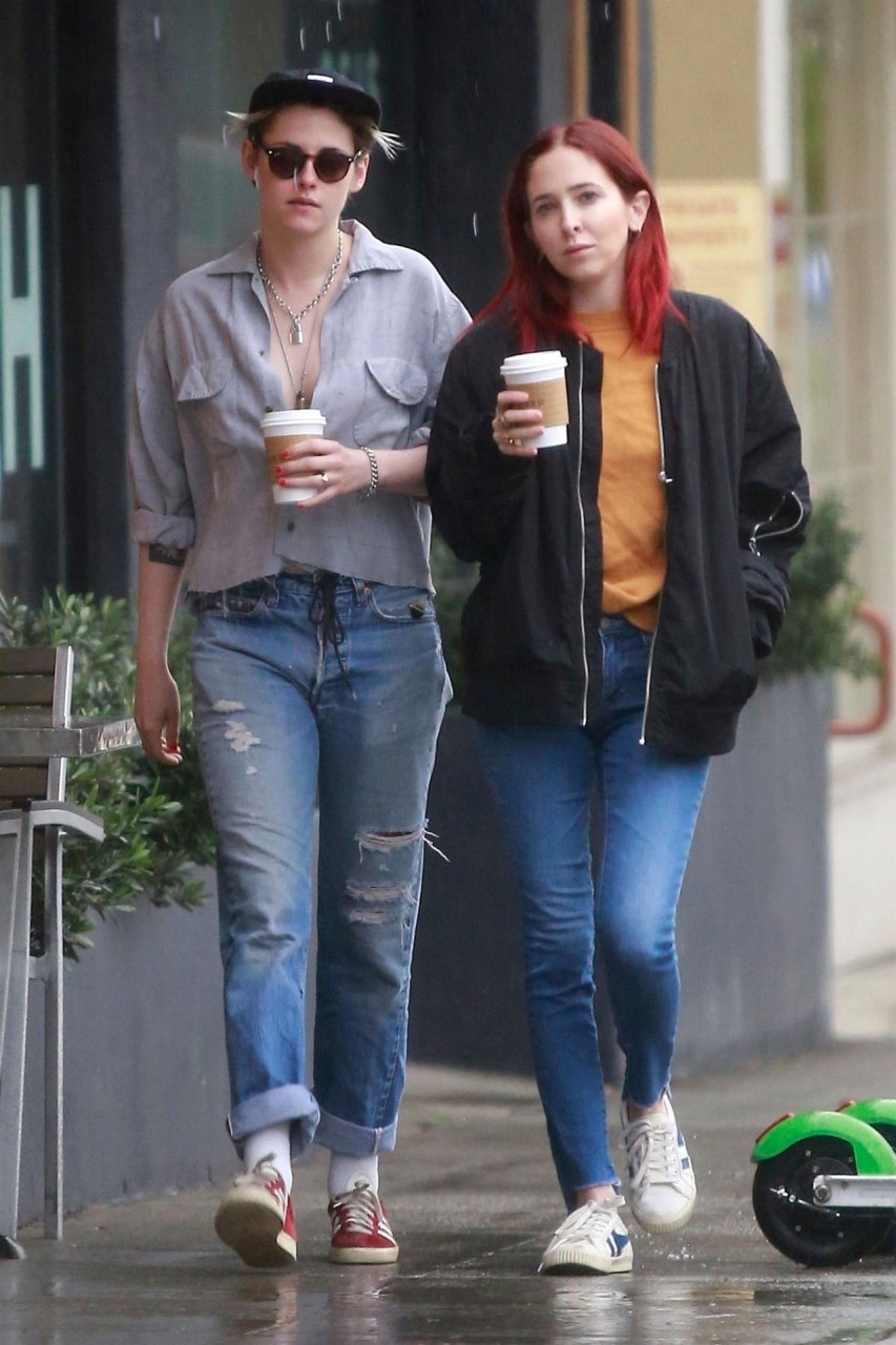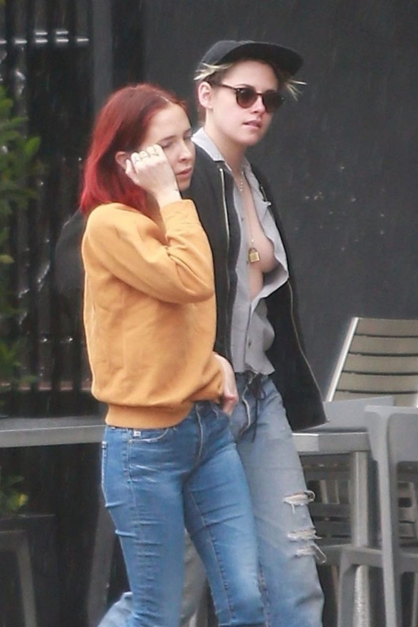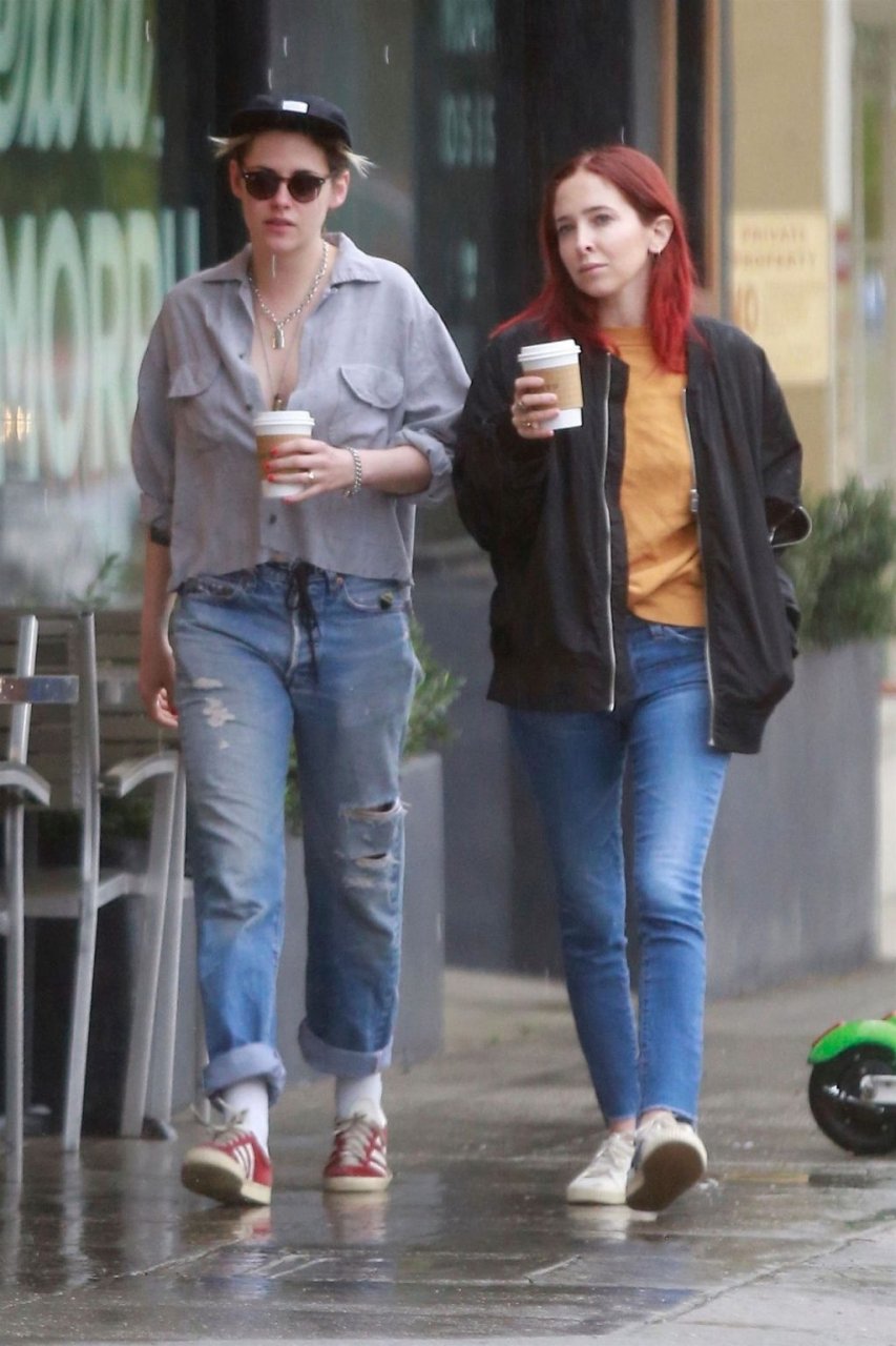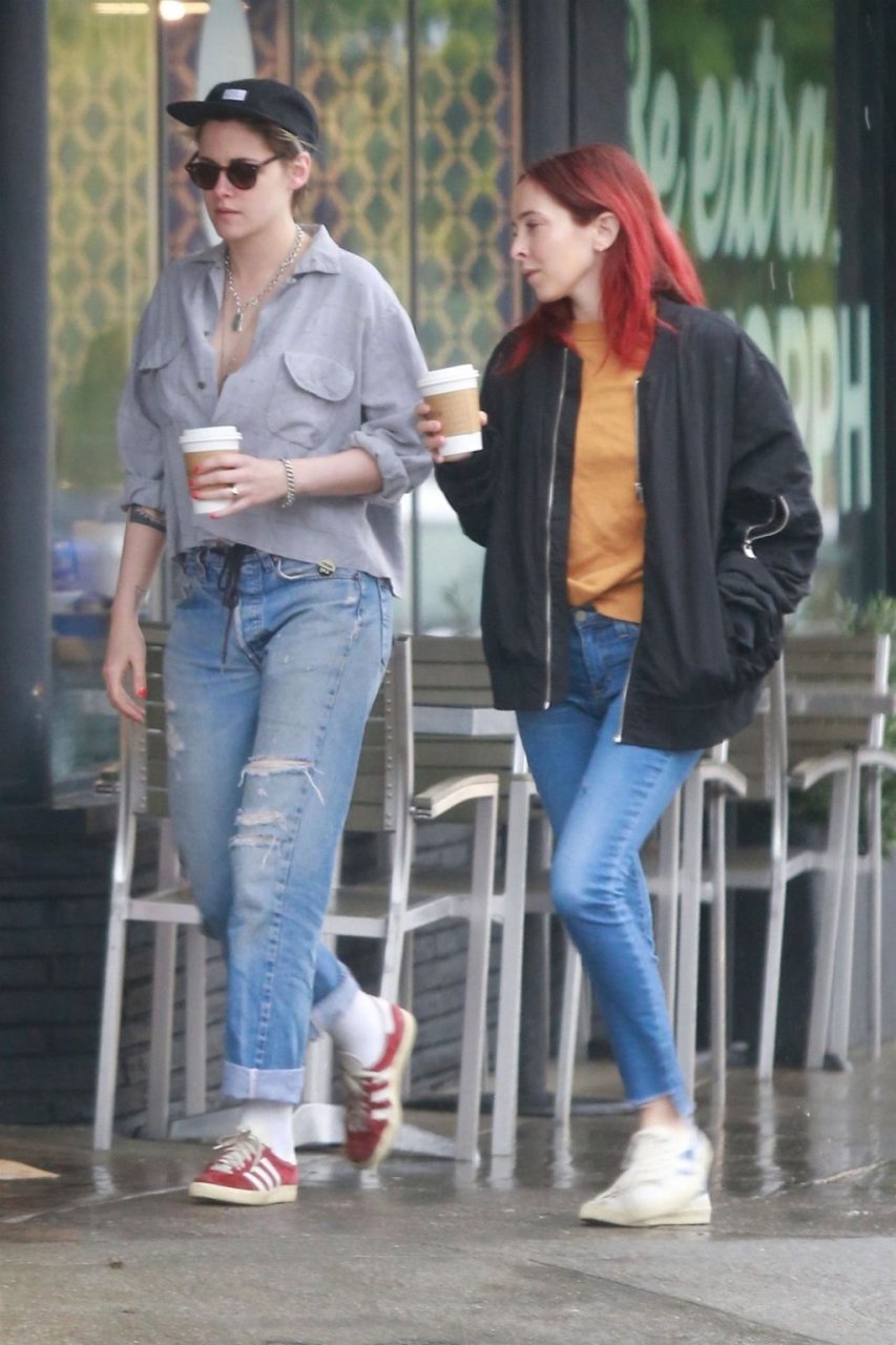 L’actrice Kristen Stewart et sa petite amie Sara Dinkin sortent prendre un café matinal sous la pluie à Los Feliz, le 31/01/2019. Kristen a décidé de ne pas porter de soutien-gorge pour cette sortie café et a dévoilé un peu plus que prévu.