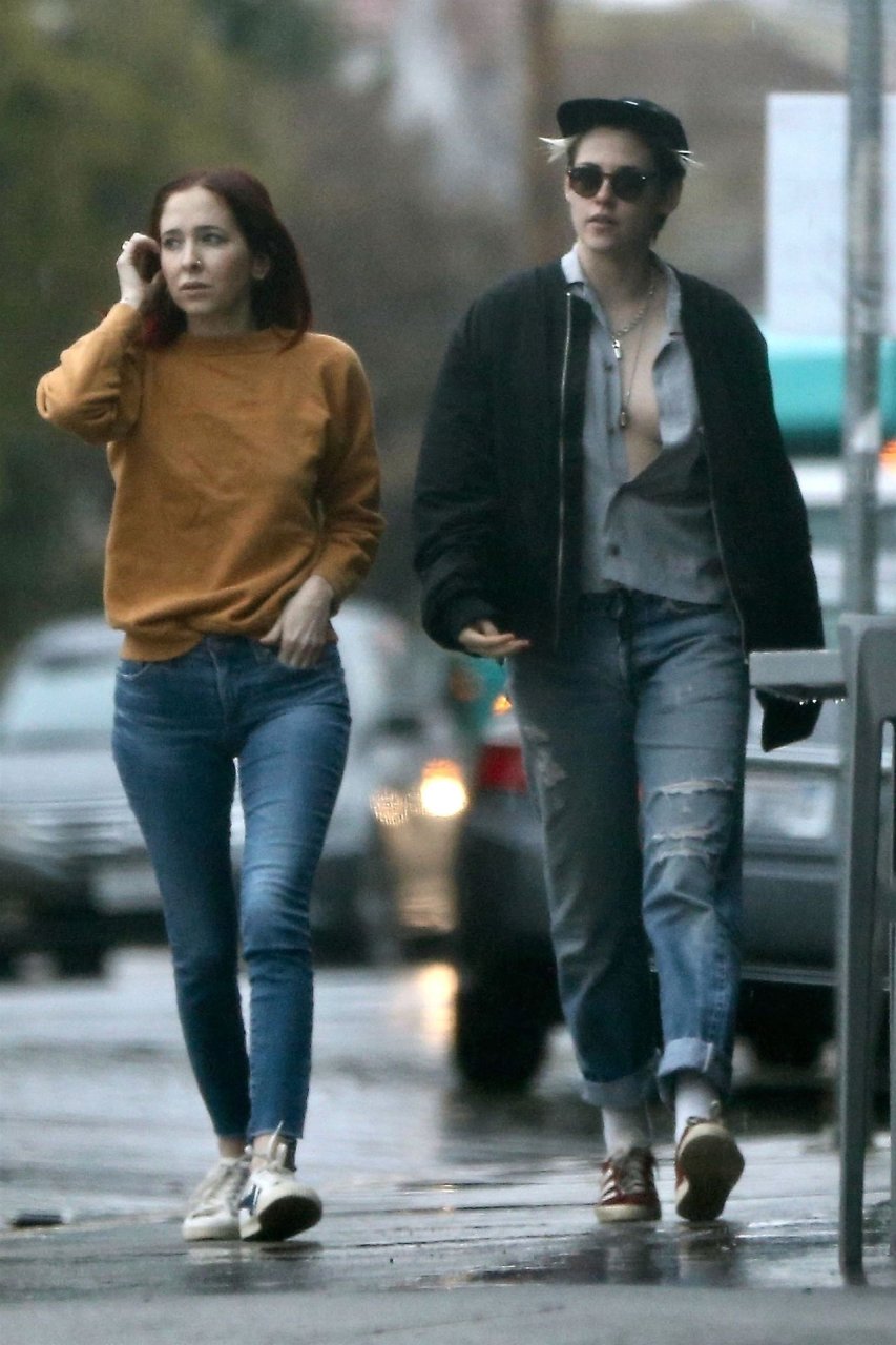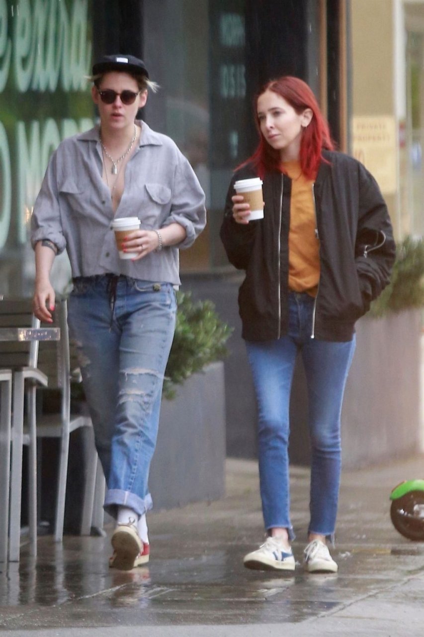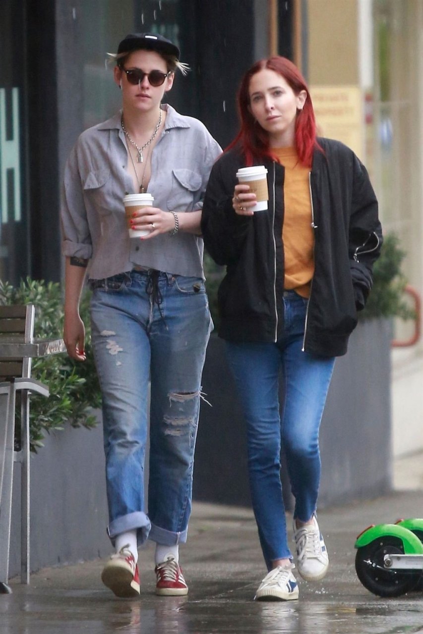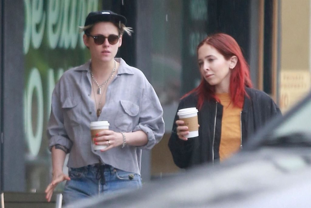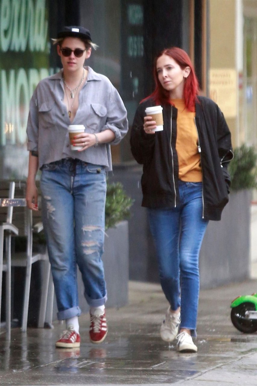 L’actrice Kristen Stewart et sa petite amie Sara Dinkin sortent prendre un café matinal sous la pluie à Los Feliz, le 31/01/2019. Kristen a décidé de ne pas porter de soutien-gorge pour cette sortie café et a dévoilé un peu plus que prévu.