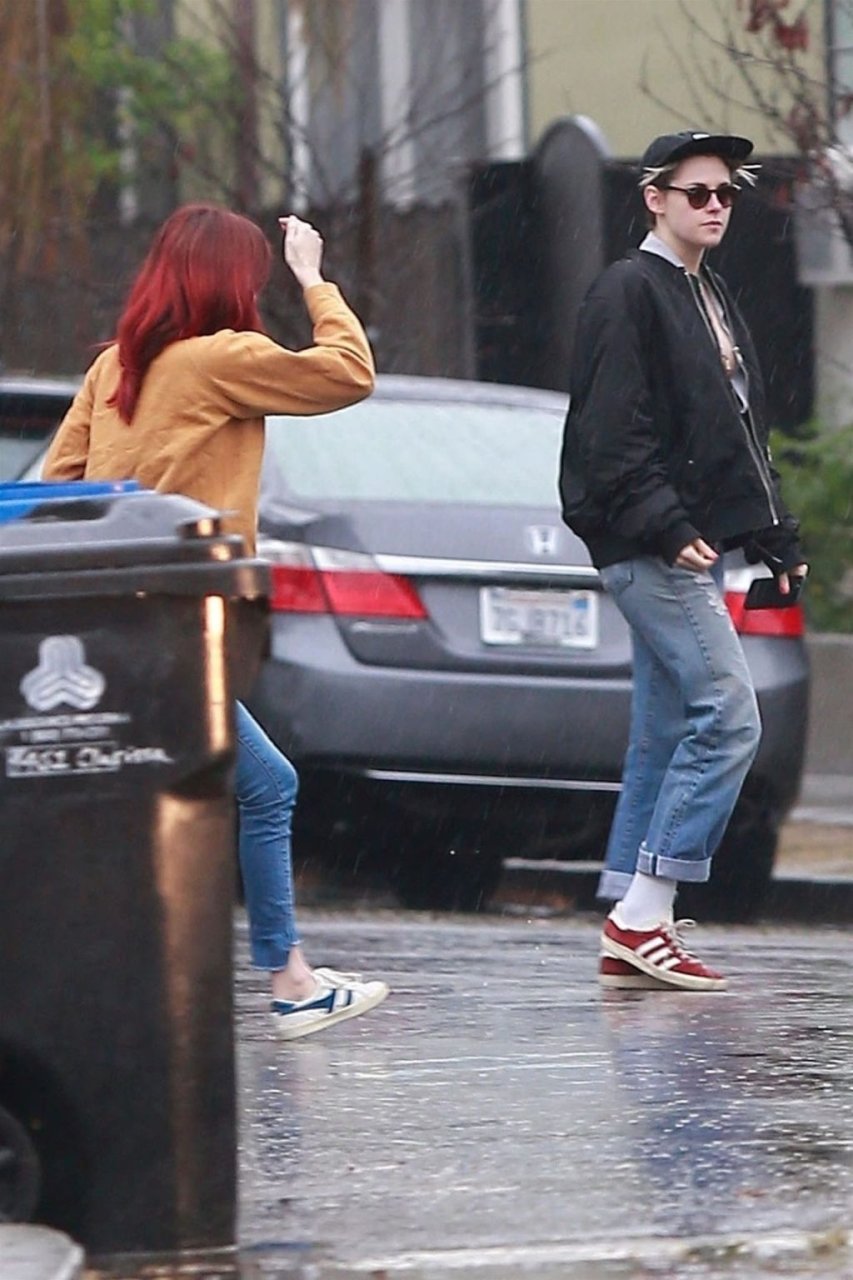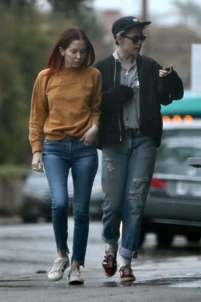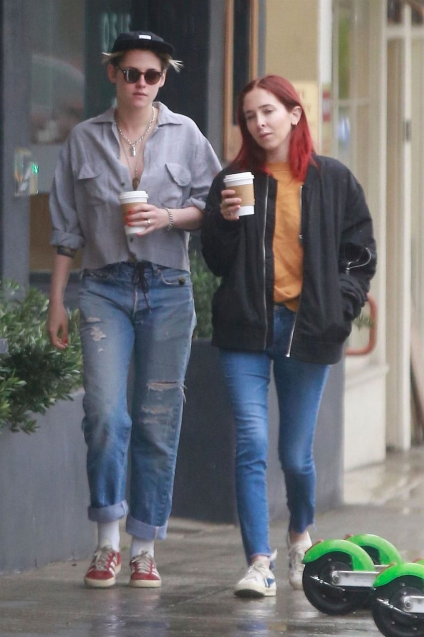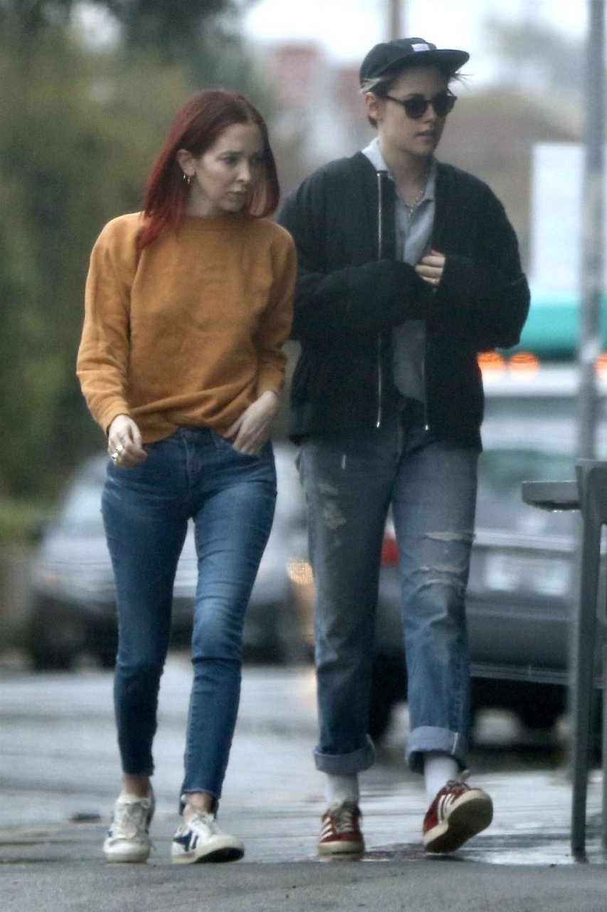 L’actrice Kristen Stewart et sa petite amie Sara Dinkin sortent prendre un café matinal sous la pluie à Los Feliz, le 31/01/2019. Kristen a décidé de ne pas porter de soutien-gorge pour cette sortie café et a dévoilé un peu plus que prévu.