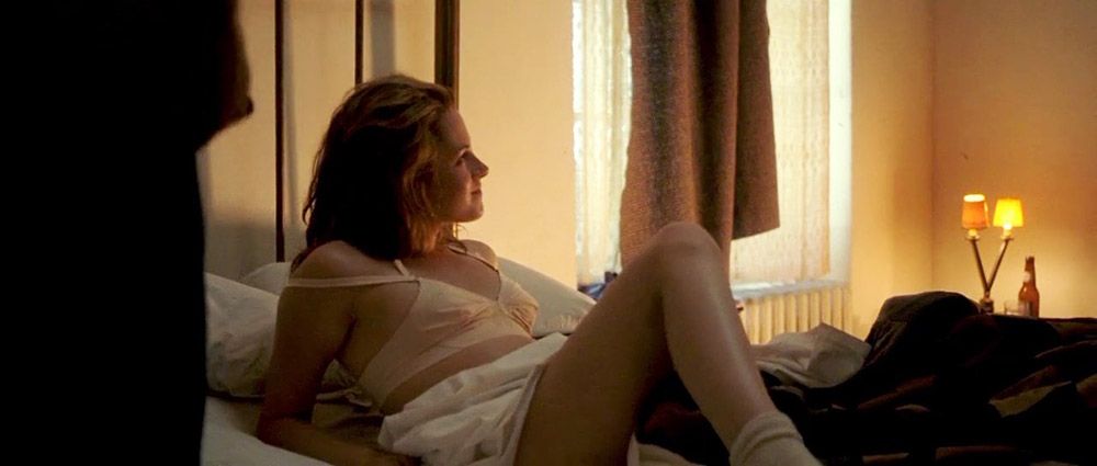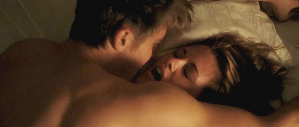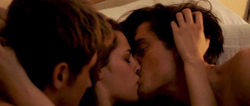 I like Kristen Stewart making out with a guy on a bed. Then she’s climbing on top of him and removing her shirt to reveal a white bra and then removing the bra to show tits. Stewart has sex with him while riding him.