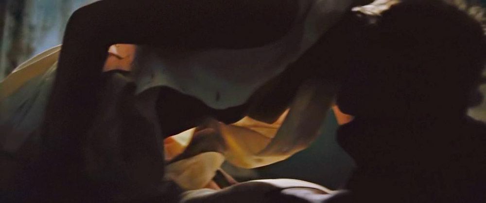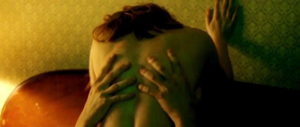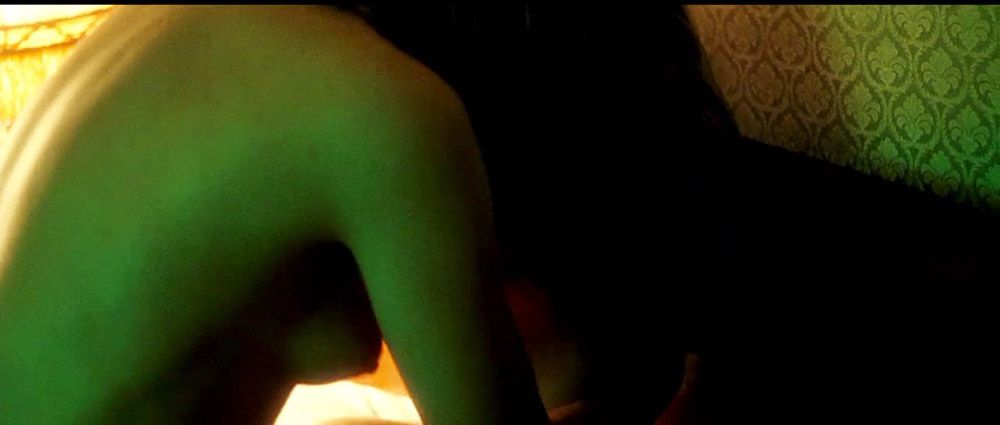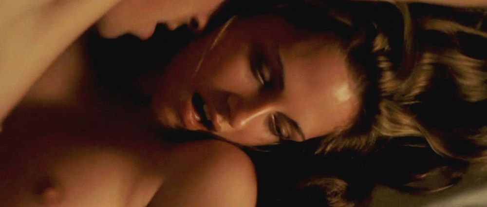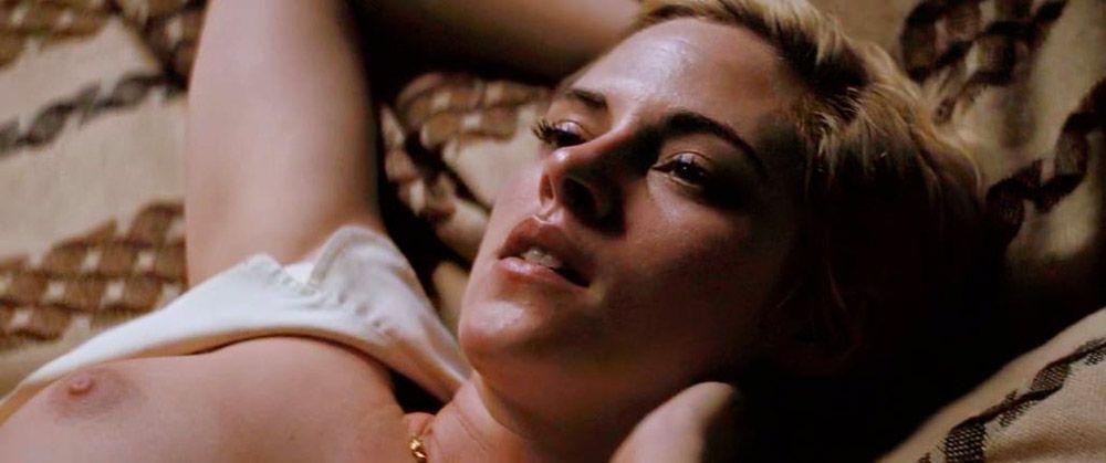 Then Kristen Stewart is on top of a guy, as she makes out with him in bed. Her bra is hanging off her right shoulder to reveal most of her right nipple. We then see Kristen having sex with the guy, lying on her back and moaning loudly. Her nude tits come into view while underneath him.