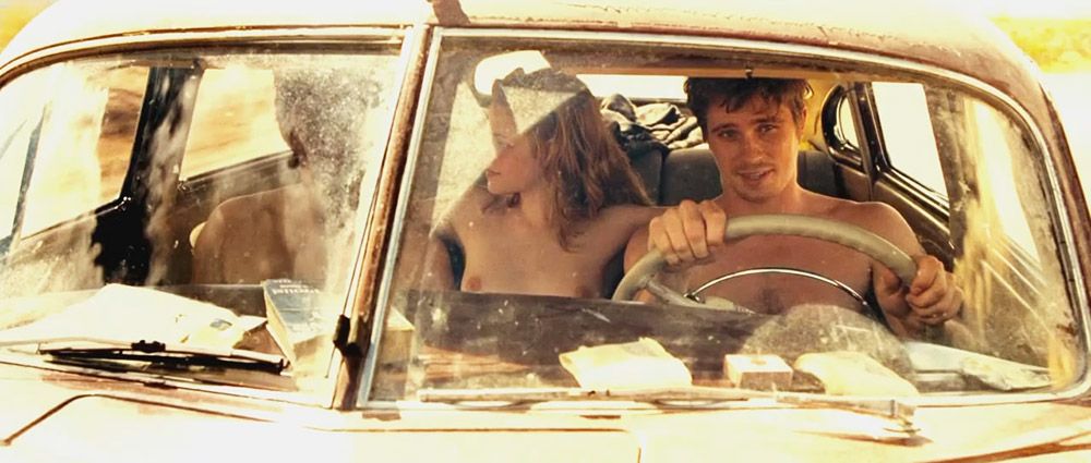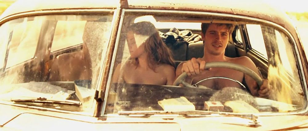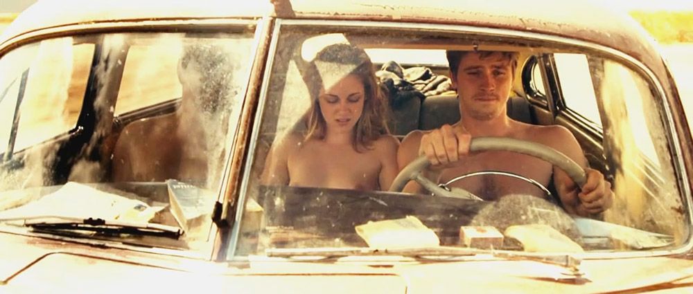 Hot Kristen Stewart is sitting topless between two guys in the front seat of a car. They drive down a highway, and we see her boobs. She then reaches her arms down and gives the guys handjobs, one with each hand.