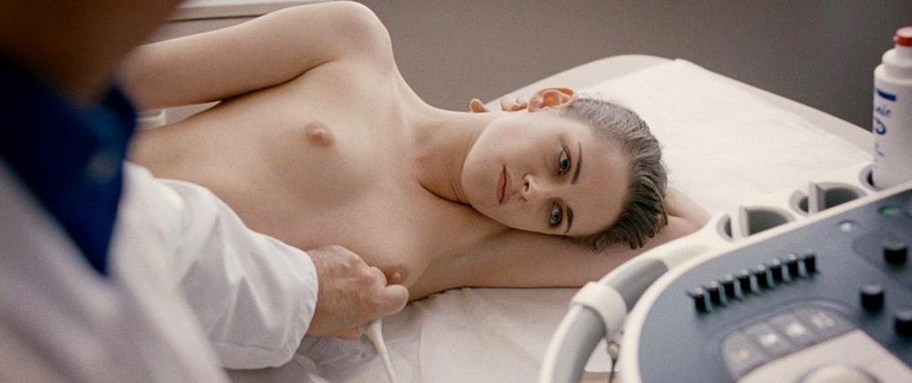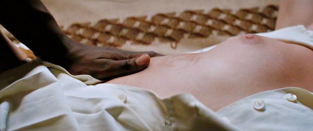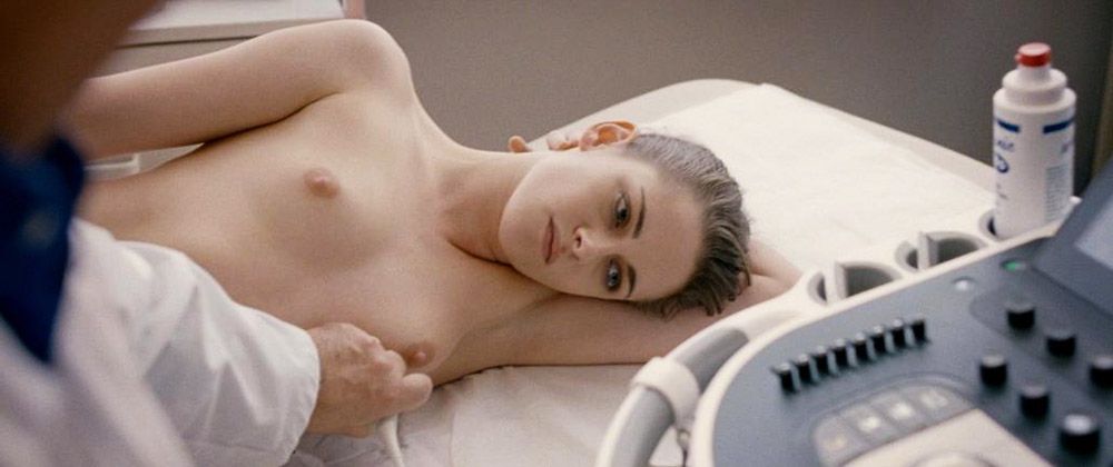 Topless Kristen Stewart is lying on her side on a doctor’s table. She then sits up and walks across the room, still without her shirt on.