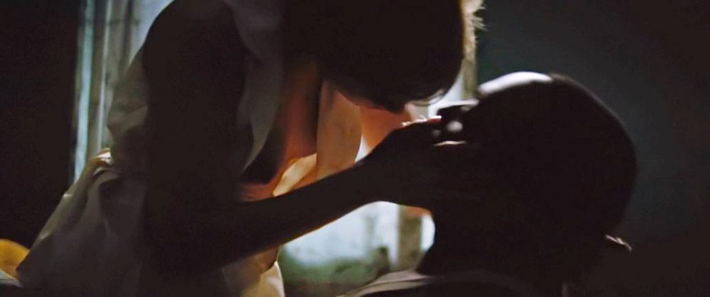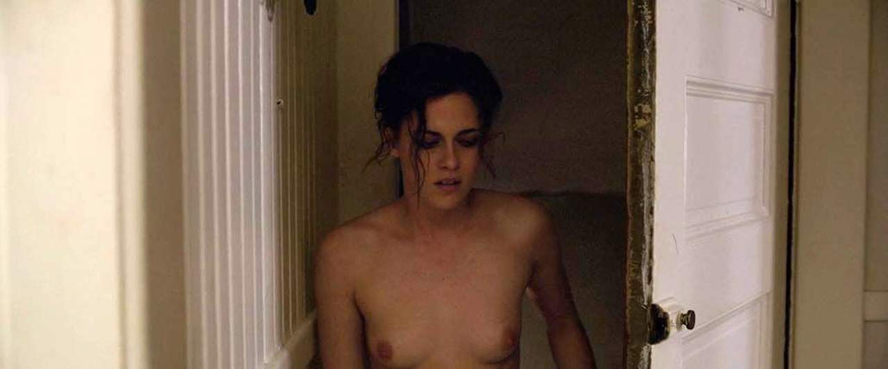 Kristen Stewart is undressing out of her maid’s outfit and showing bare breasts. She approaches a guy naked while holding a hatchet. She raises it but cannot hit him, backing away with the hatchet above her head. Kristen is then seen leaning against a door and falling to the floor with her hand on her mouth.