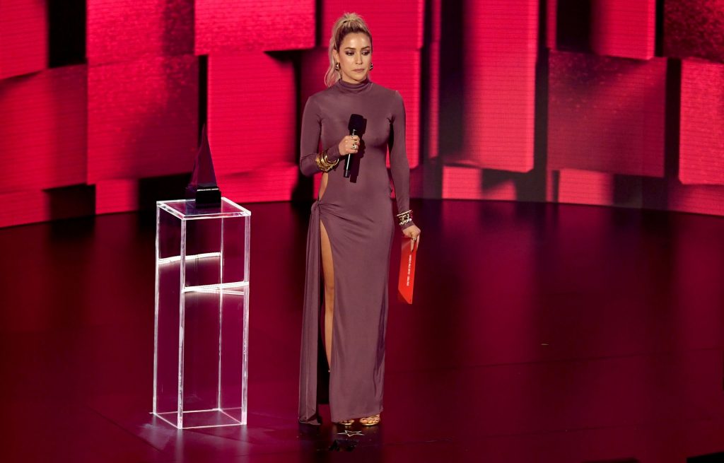 Elle portait une robe mauve avec une fente haute sur la cuisse, mettant en valeur ses jambes magnifiques. Sa tenue incroyable comprenait une robe Attico, des talons Stuart Weitzman, et des bijoux de Grace Lee, Lady Grey, Via Saviene, ainsi que des boucles d’oreilles Uncommon James.