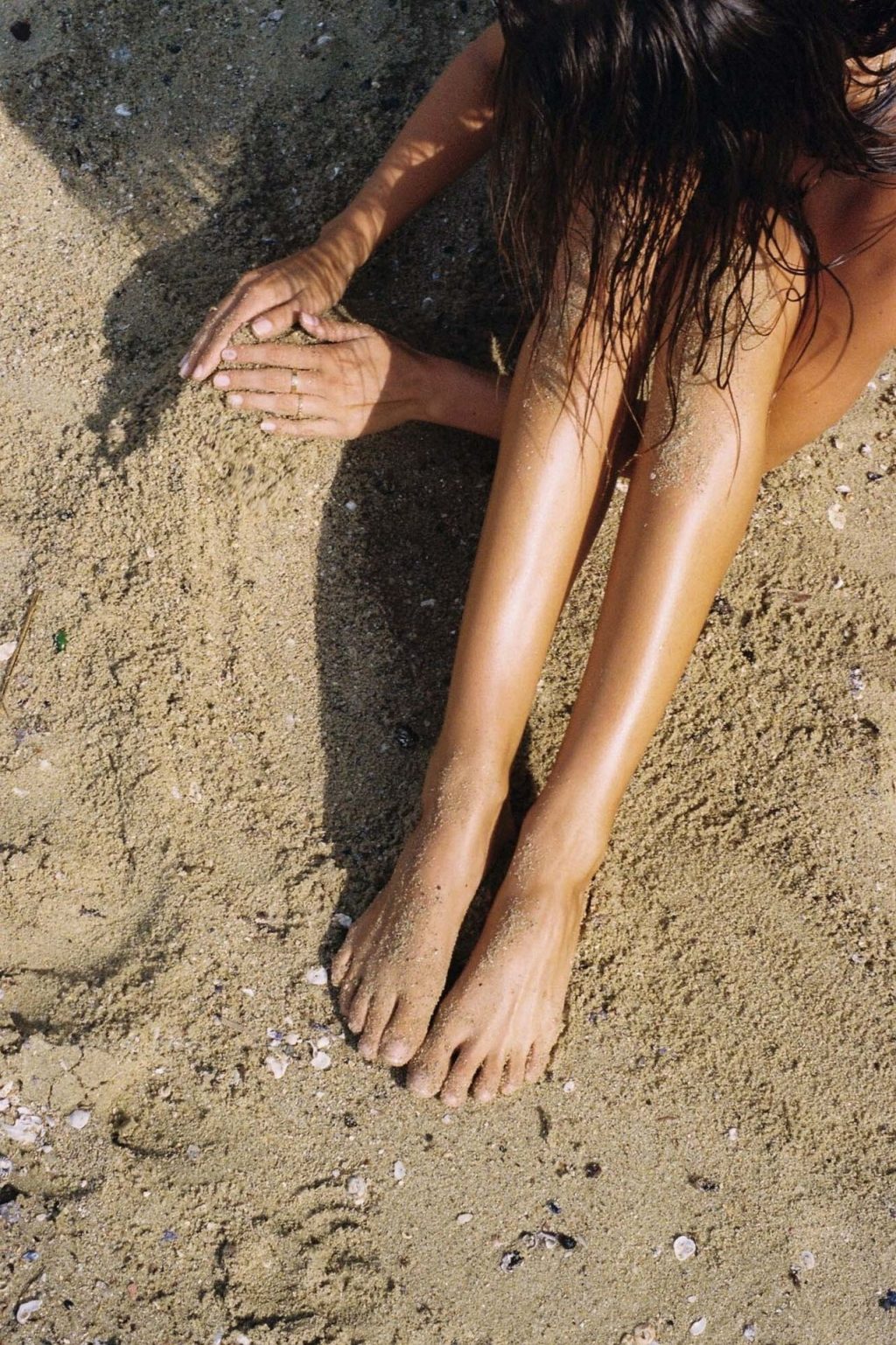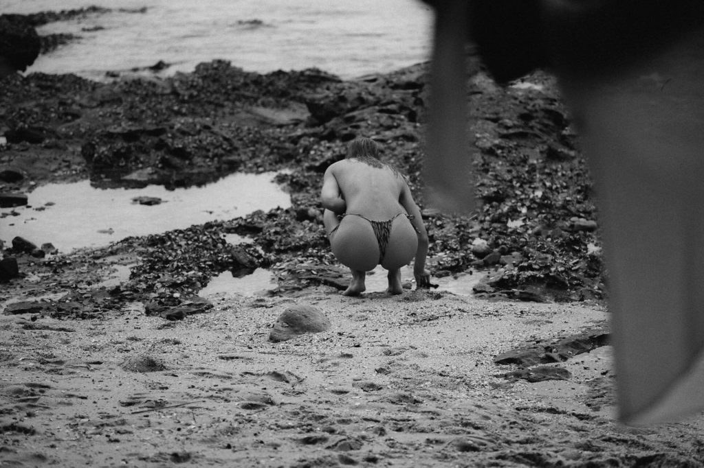 Le mannequin Kristina Mendonca pose topless et montre son minuscule bikini sur la plage de Sydney, Australie, lors d’une séance photo par Jonny Seelenmeyer (2020).