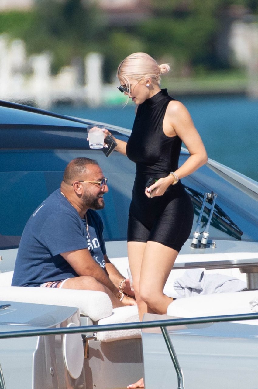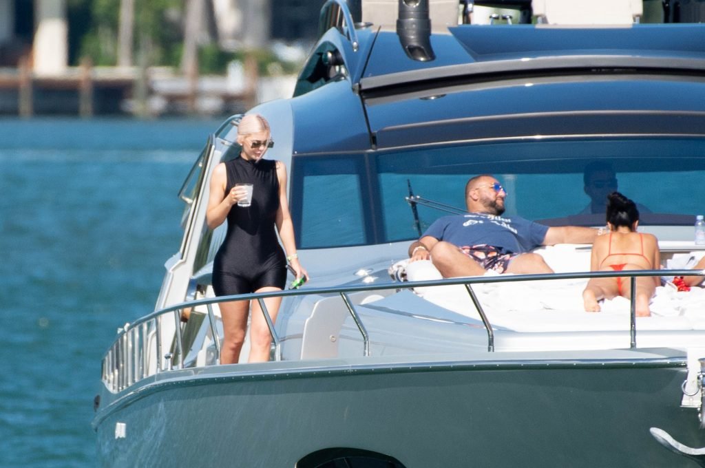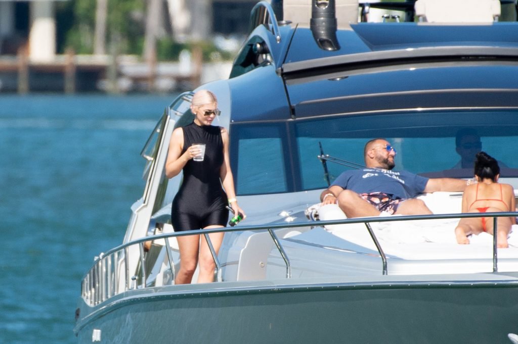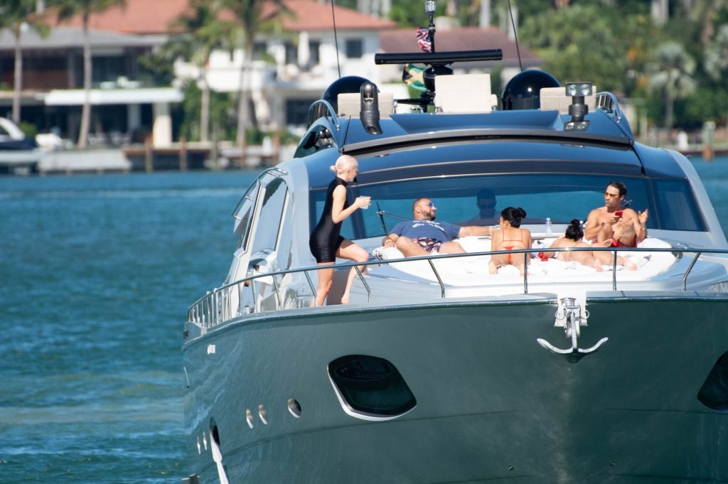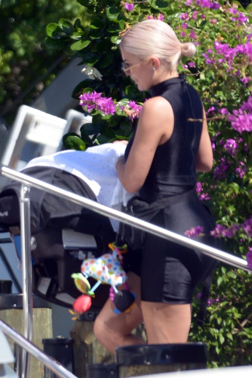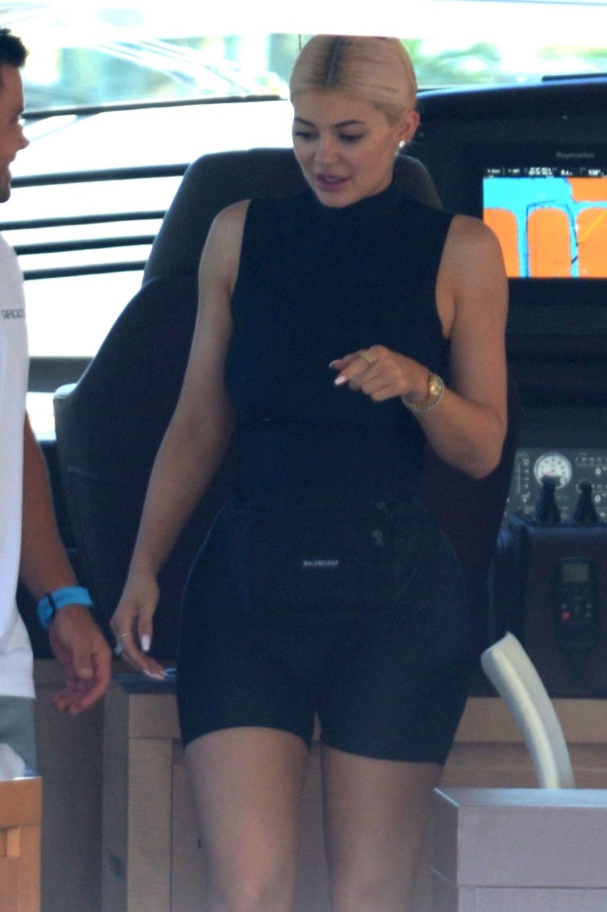 Kylie Jenner (21 ans) monte à bord du Groot avec sa fille Stormi et sa meilleure amie Jordyn Woods à Miami Beach, le 01/10/2018. On voit Kylie emmener son bébé à bord puis profiter du soleil et de la nourriture avec ses amies tout en exhibant ses courbes dans un maillot de bain noir une pièce.