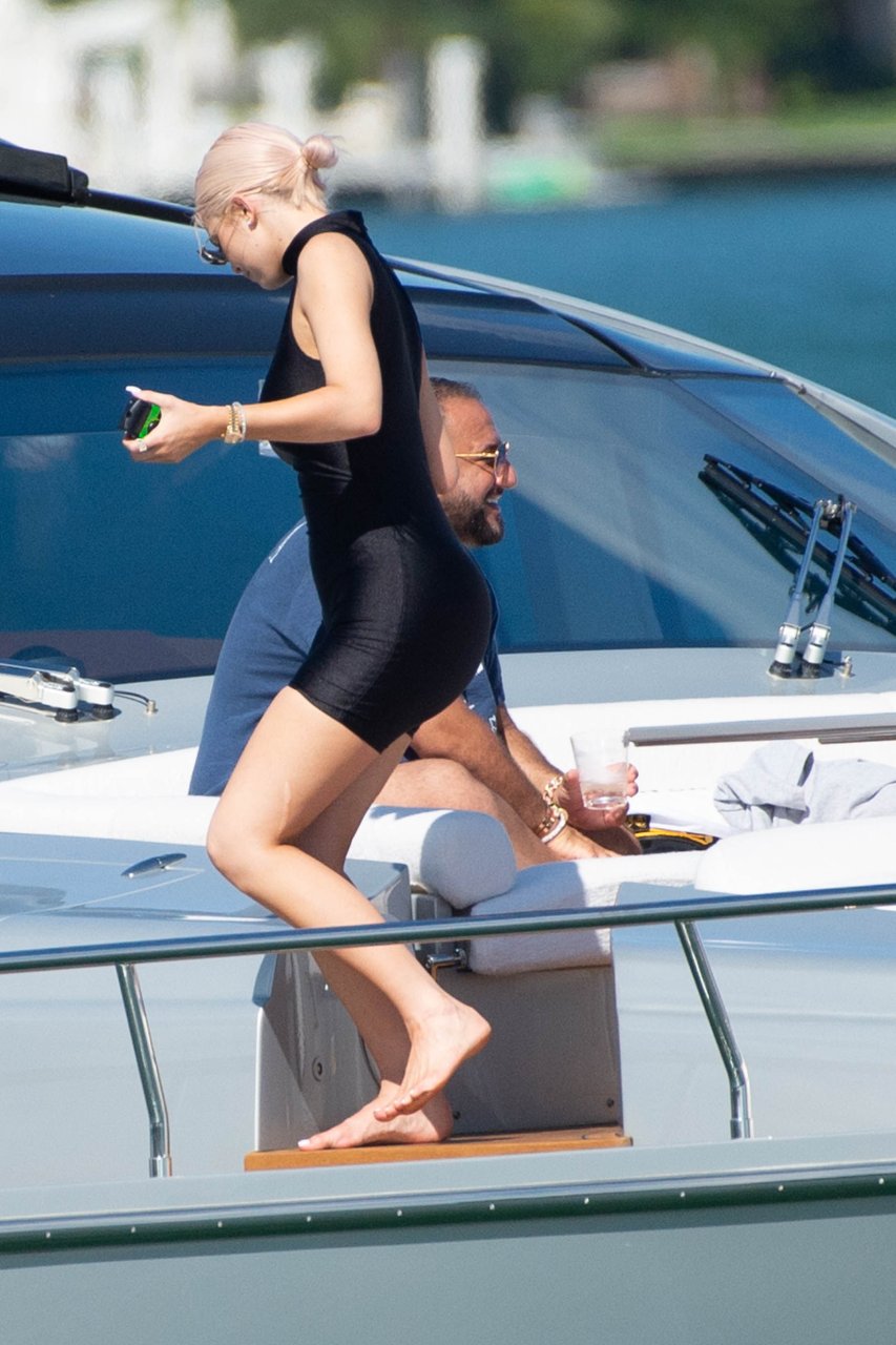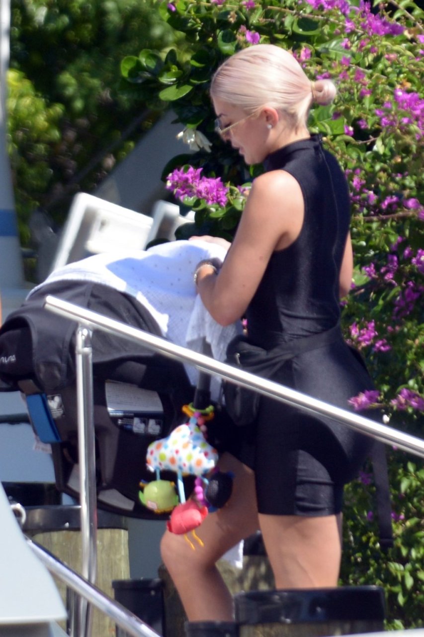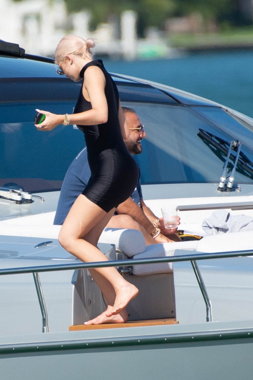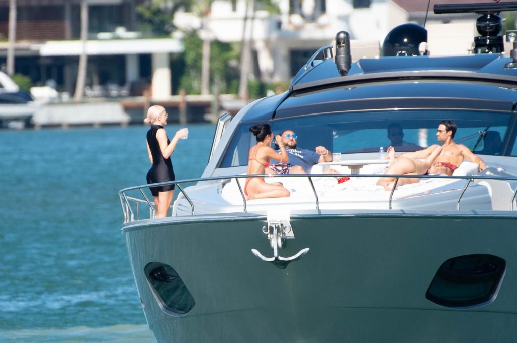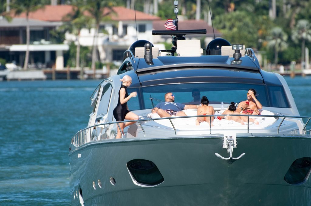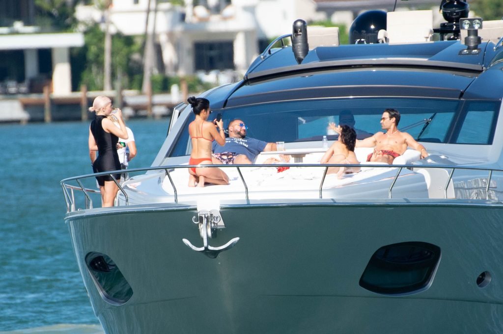 Kylie Jenner (21 ans) monte à bord du Groot avec sa fille Stormi et sa meilleure amie Jordyn Woods à Miami Beach, le 01/10/2018. On voit Kylie emmener son bébé à bord puis profiter du soleil et de la nourriture avec ses amies tout en exhibant ses courbes dans un maillot de bain noir une pièce.