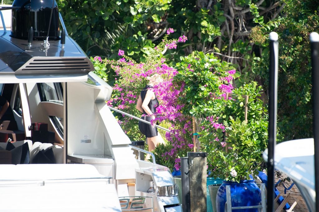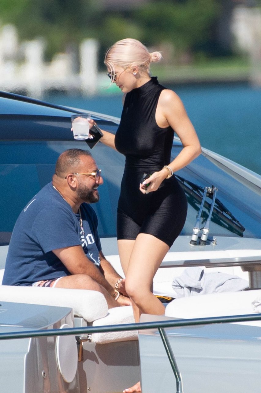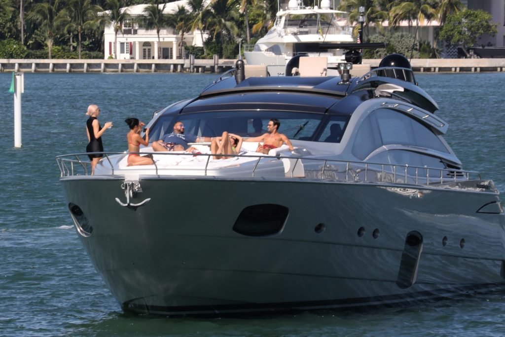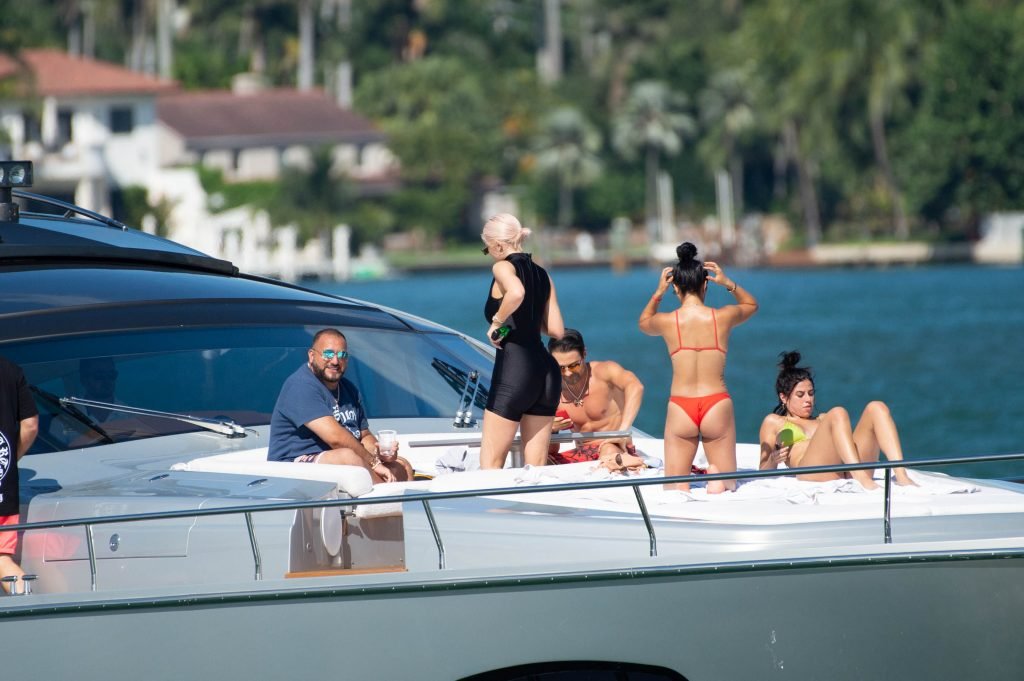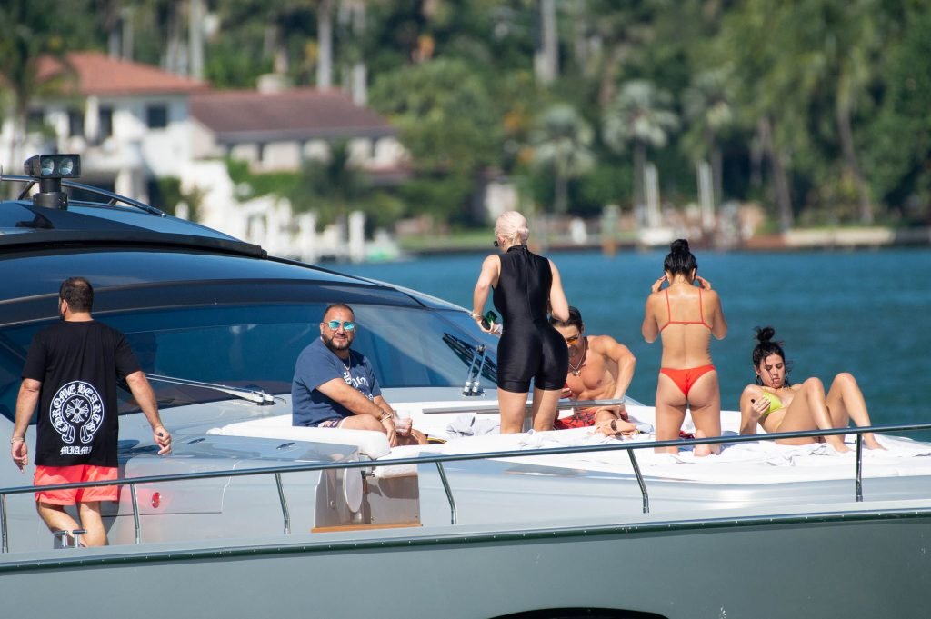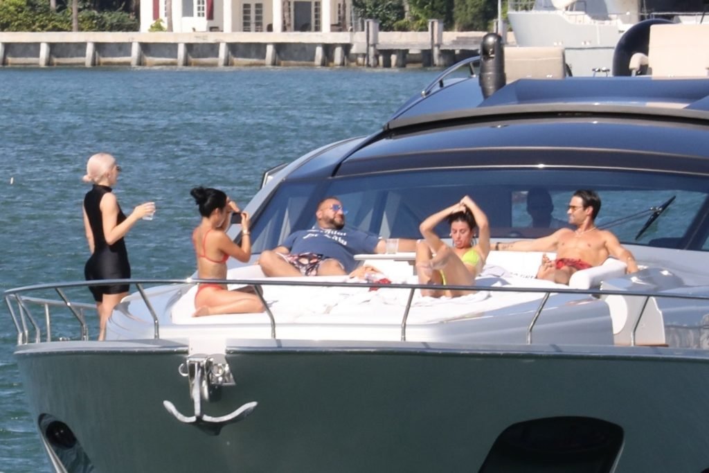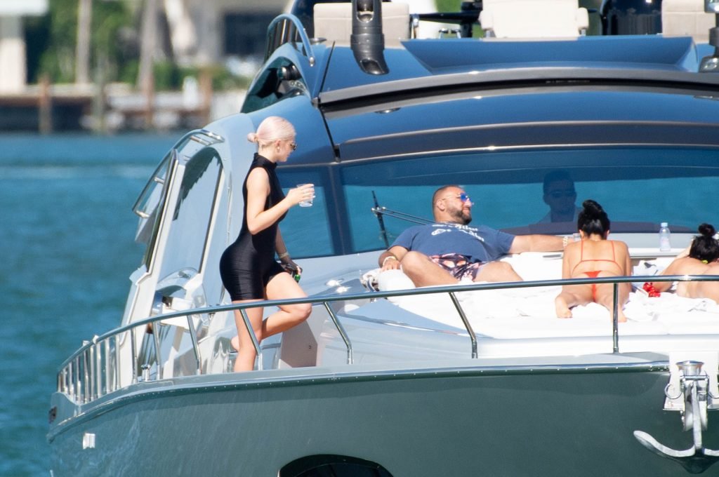 Kylie Jenner (21 ans) monte à bord du Groot avec sa fille Stormi et sa meilleure amie Jordyn Woods à Miami Beach, le 01/10/2018. On voit Kylie emmener son bébé à bord puis profiter du soleil et de la nourriture avec ses amies tout en exhibant ses courbes dans un maillot de bain noir une pièce.