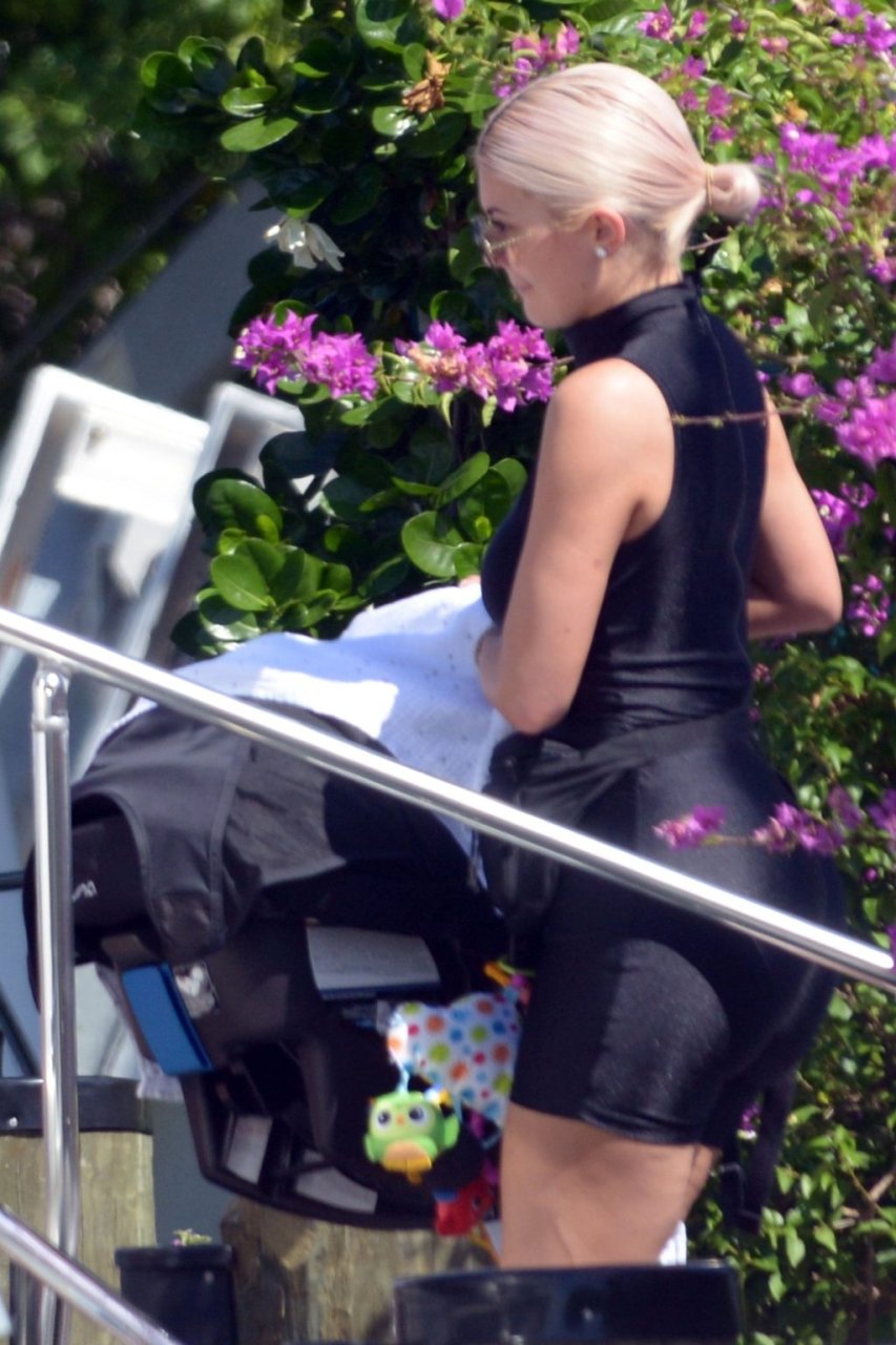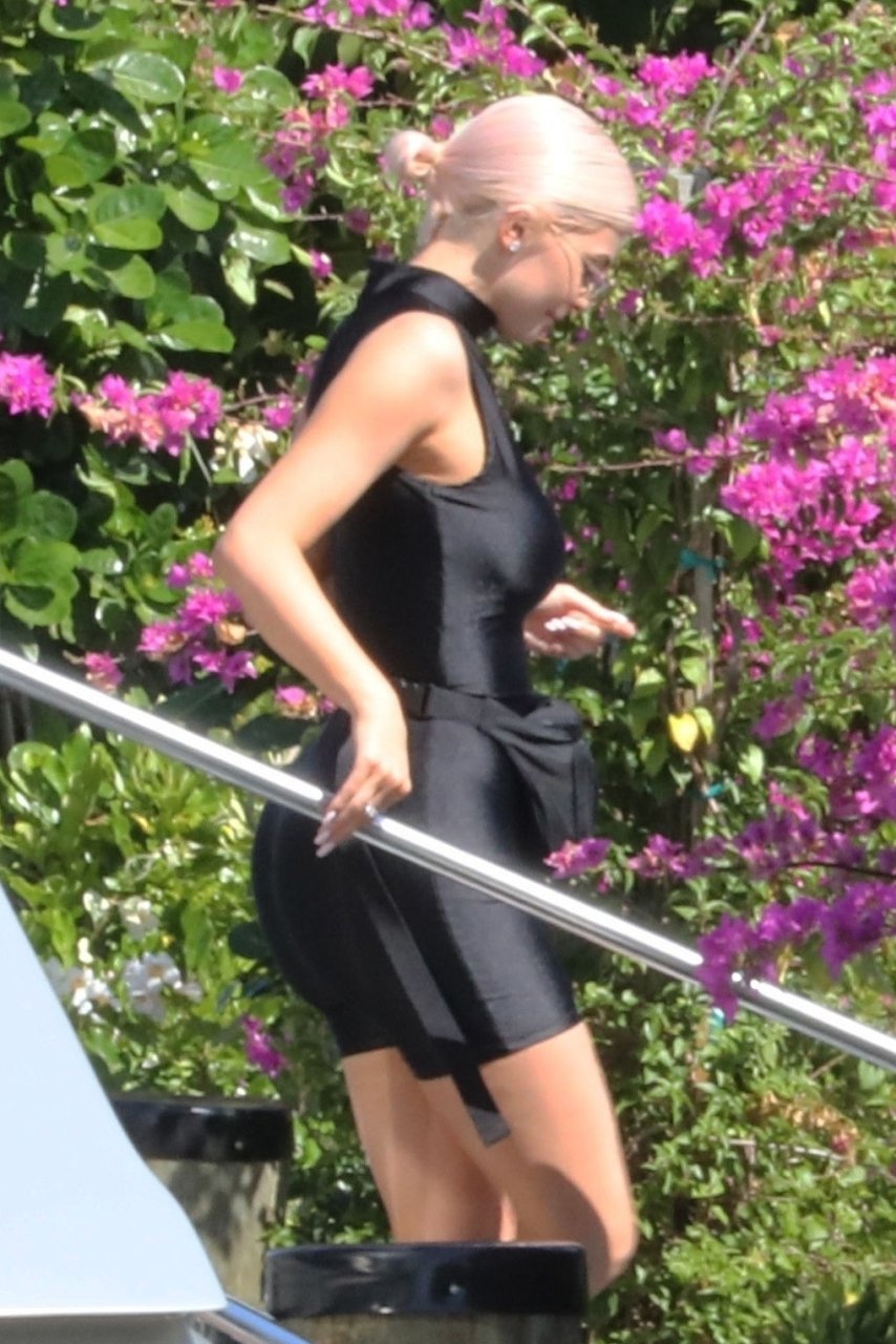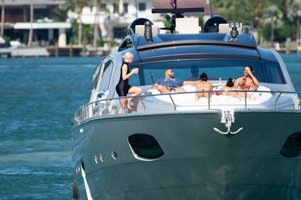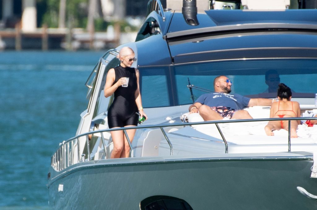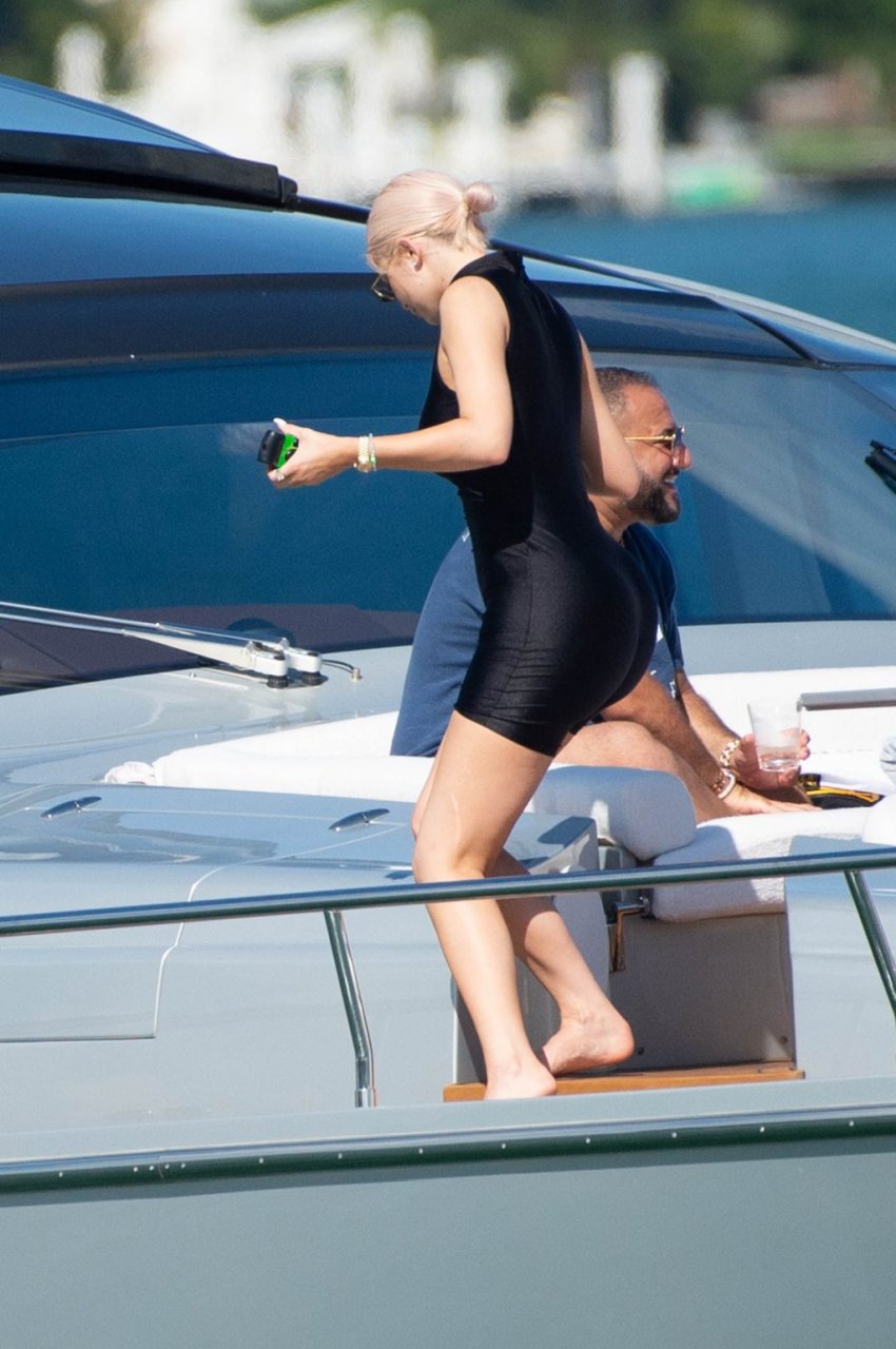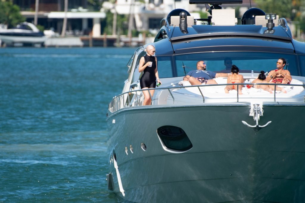 Kylie Jenner (21 ans) monte à bord du Groot avec sa fille Stormi et sa meilleure amie Jordyn Woods à Miami Beach, le 01/10/2018. On voit Kylie emmener son bébé à bord puis profiter du soleil et de la nourriture avec ses amies tout en exhibant ses courbes dans un maillot de bain noir une pièce.