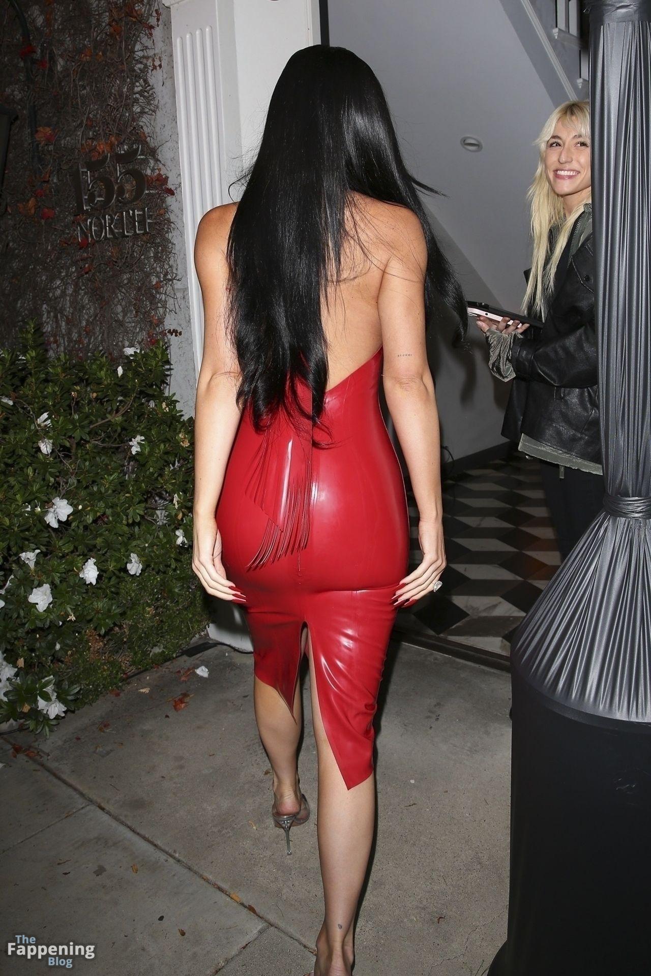 Kylie Jenner a assisté à la fête de Noël d’OBB Media à West Hollywood. Le mannequin est arrivée dans une robe en latex rouge sans soutien-gorge, ses énormes seins appuyant fortement contre le matériau brillant.