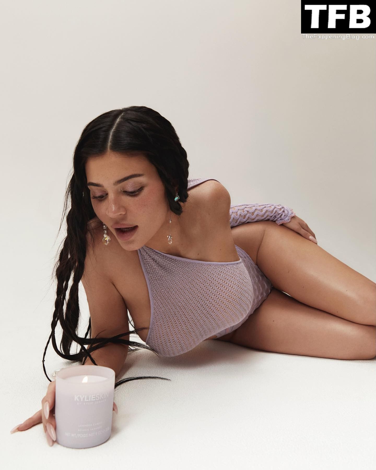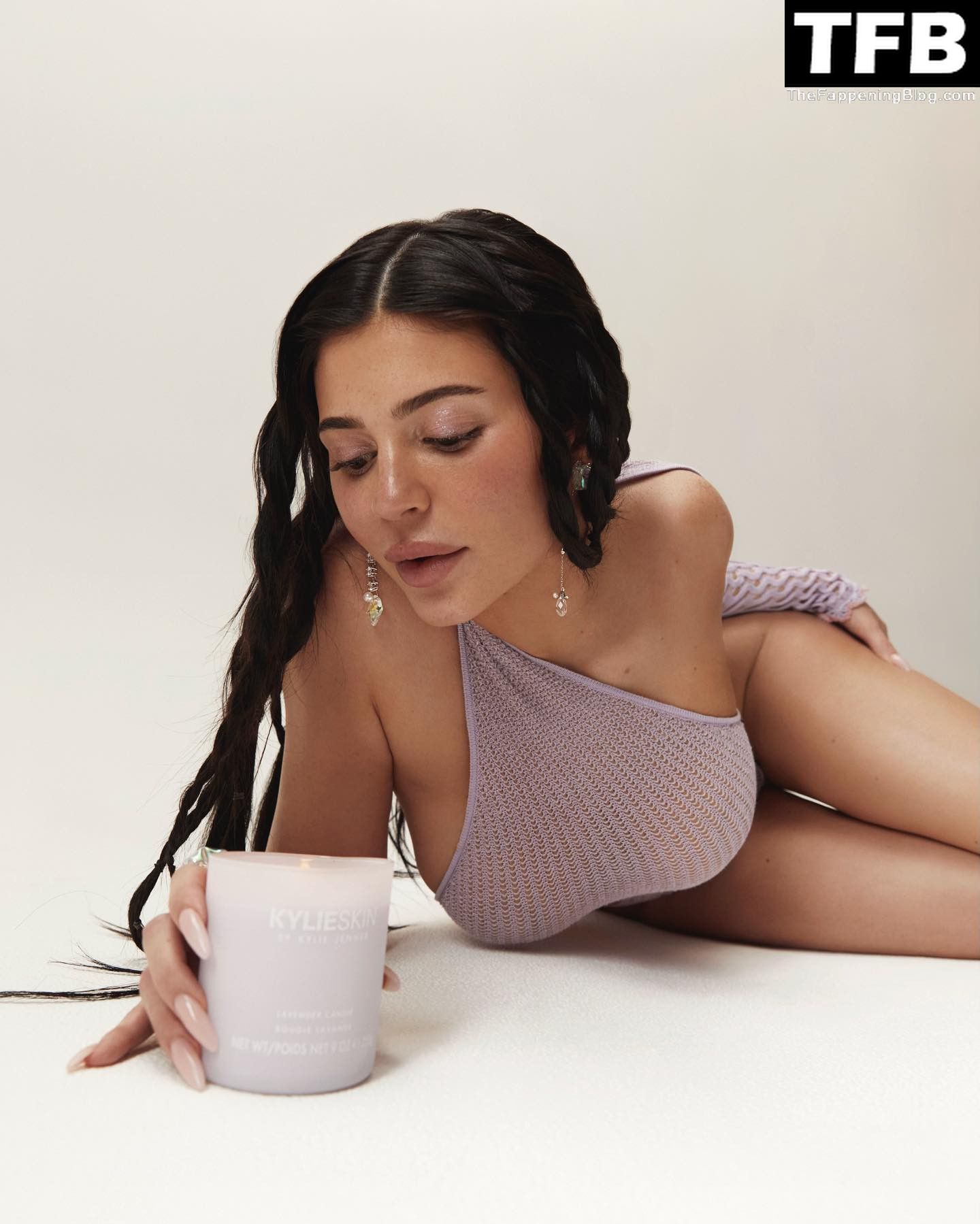 Le mannequin Kylie Jenner affiche une silhouette voluptueuse dans un body minimaliste alors qu’elle fait la promotion de sa nouvelle collection lavande Kylie Skin (mai 2022).