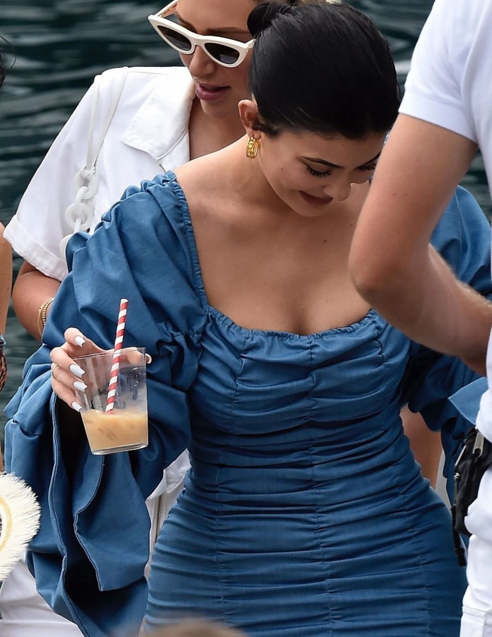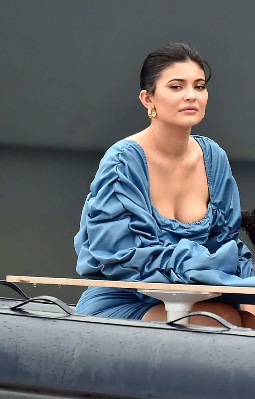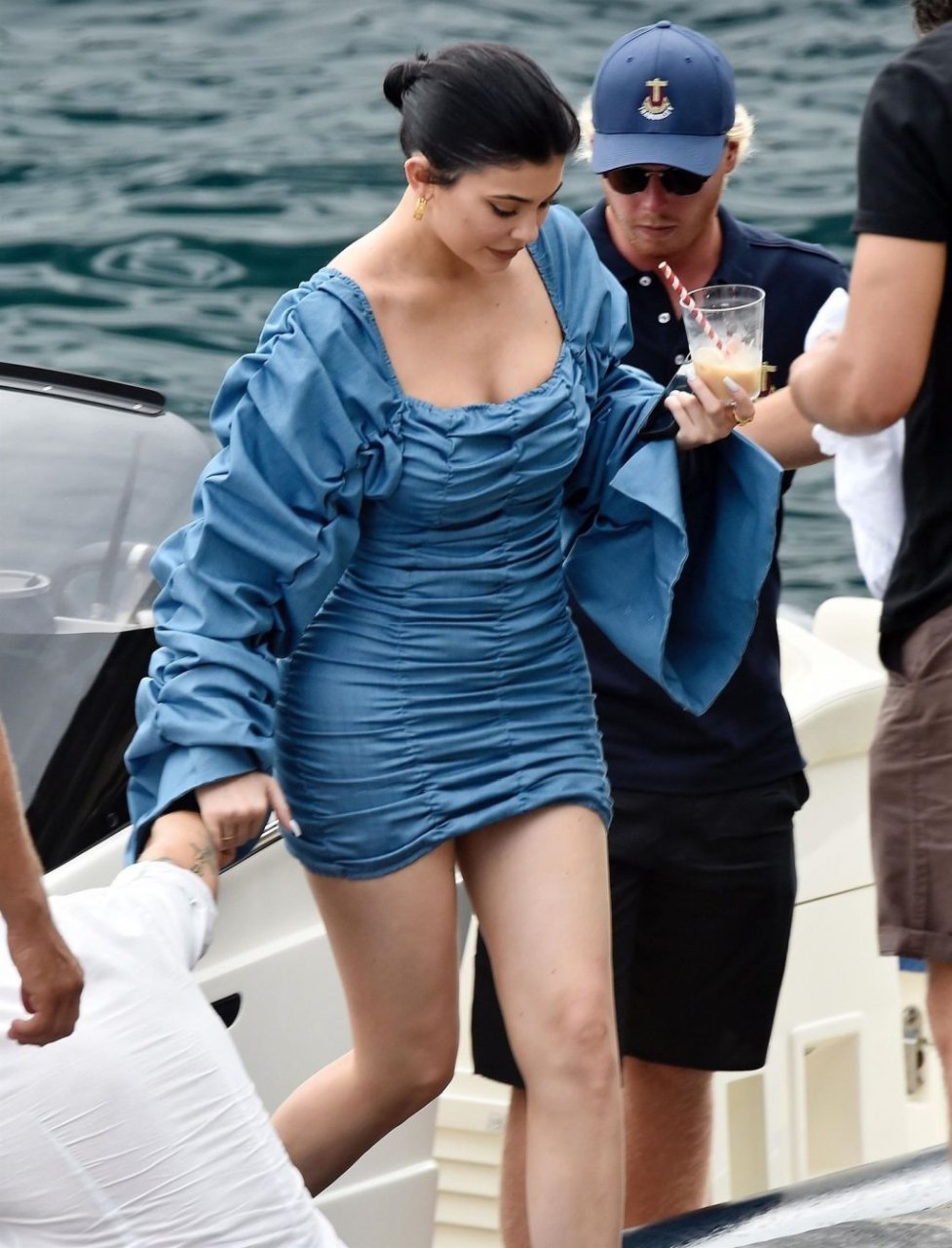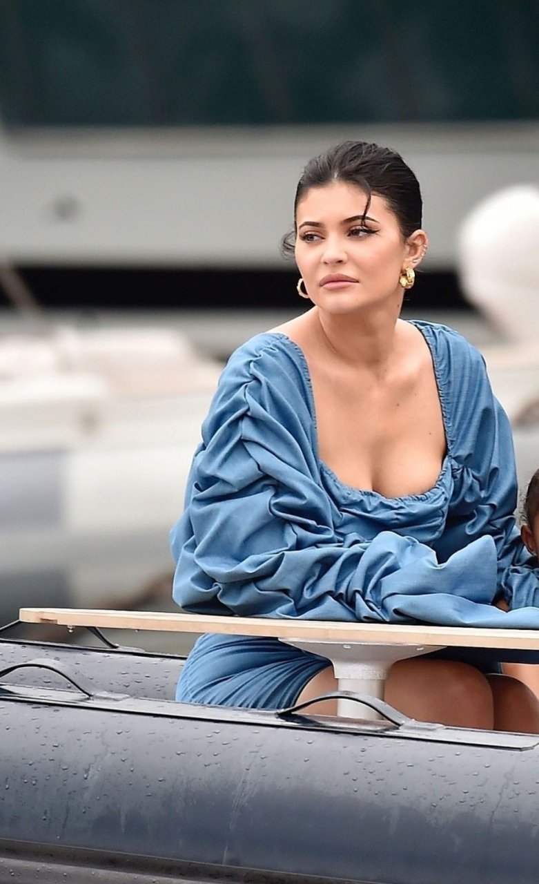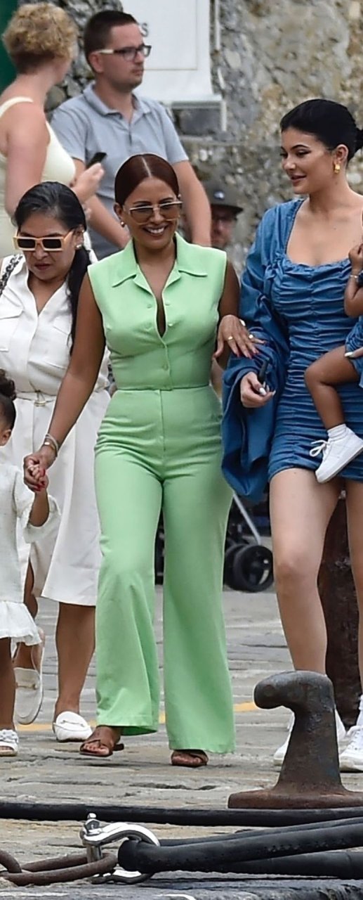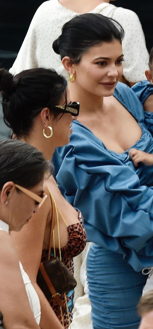 Kylie Jenner profite de la journée avec sa charmante fille Stormy portant des robes en jean à volants assorties de TLZ L’FEMME à Portofino en famille, 12/08/2019. La fille d’anniversaire Kylie et Stormy admirent les paysages avec papa Travis Scott, Scott Disick, Sofia Richie ainsi que sa mère Kris Jenner et Corey Gamble.