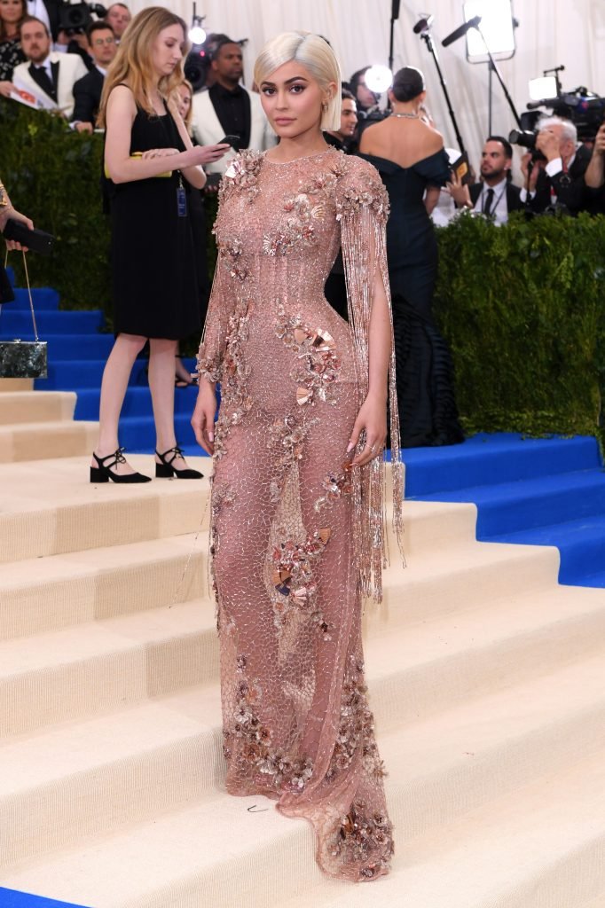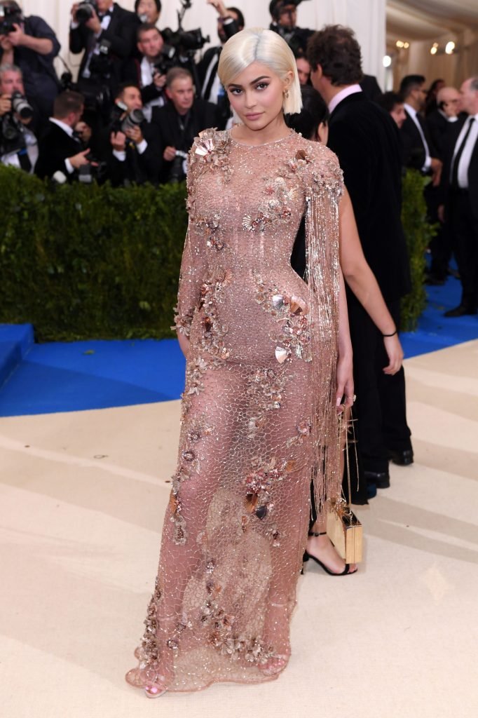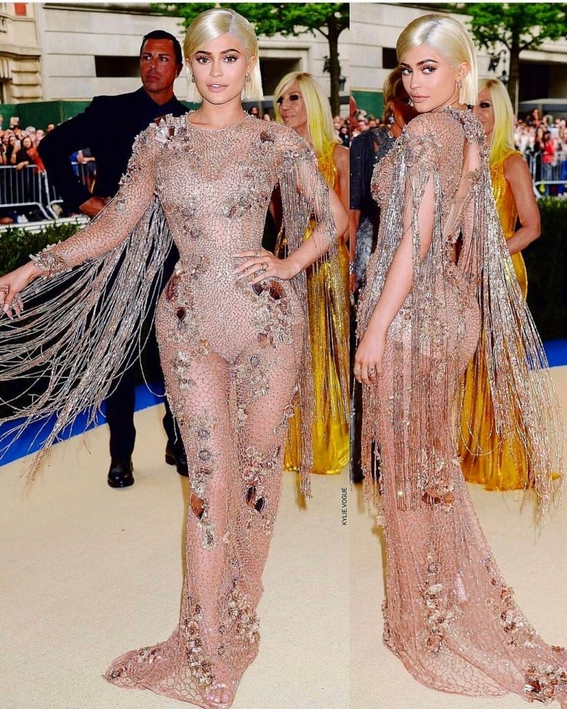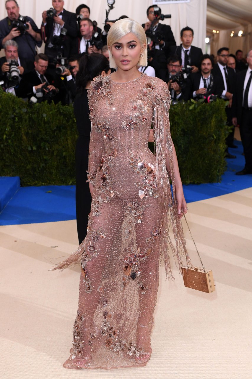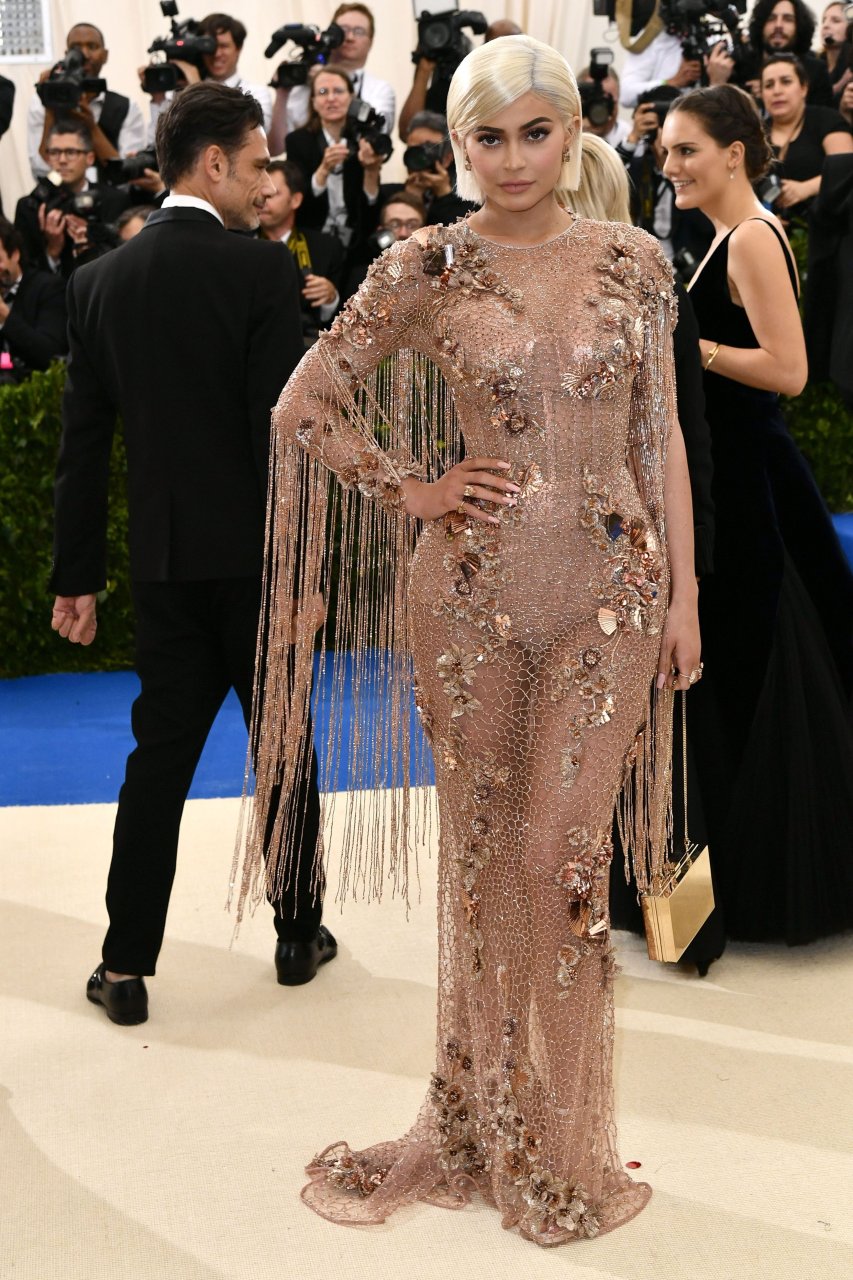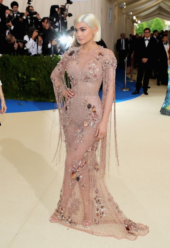 Kylie Jenner porte une robe nude transparente Versace au Met Gala 2017 à NYC, 01/05/2017. Kylie Jenner est une actrice américaine, créatrice, mannequin, star de la télévision, mondaine. Âge – 19.