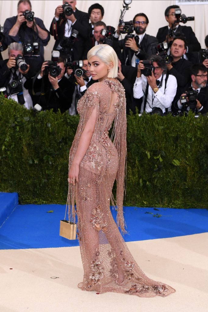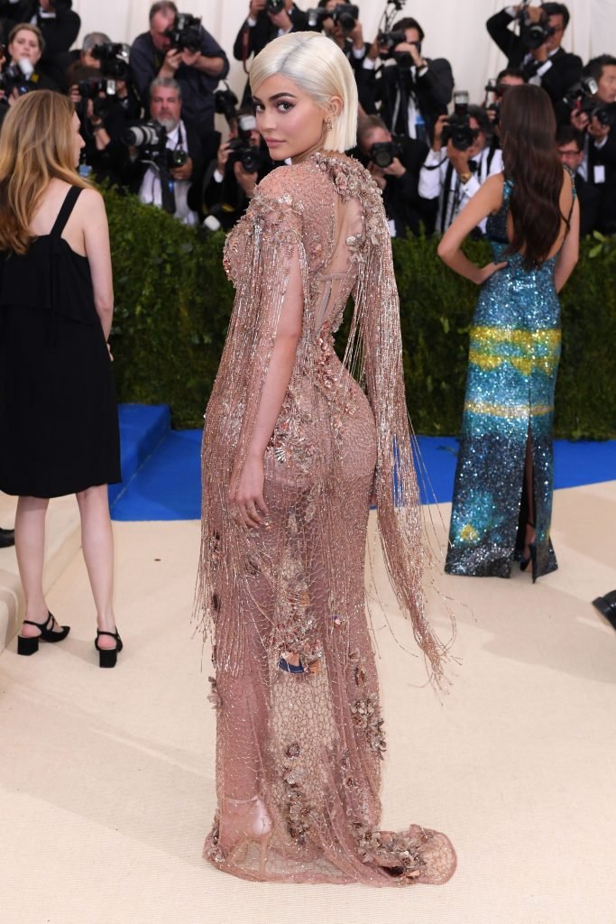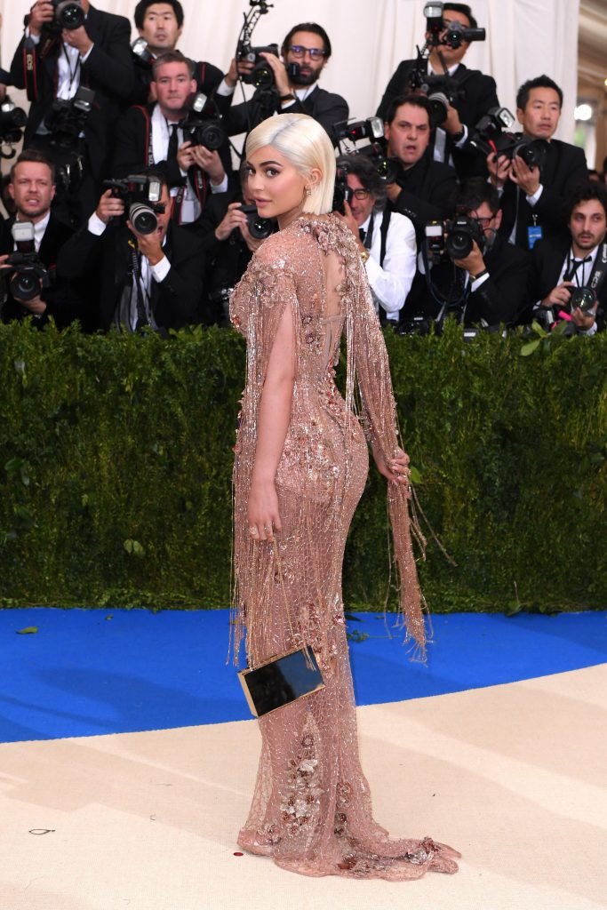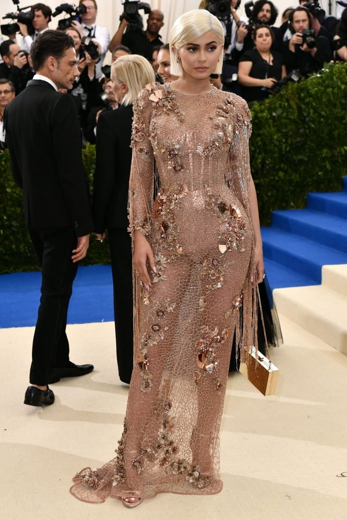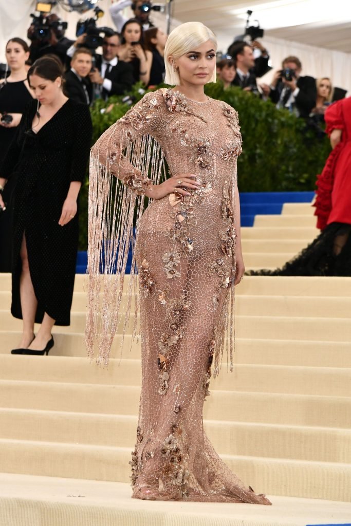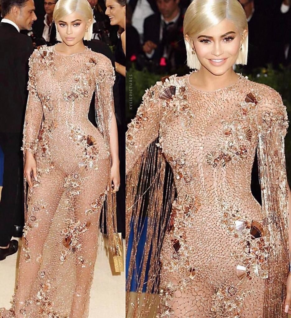 Kylie Jenner porte une robe nude transparente Versace au Met Gala 2017 à NYC, 01/05/2017. Kylie Jenner est une actrice américaine, créatrice, mannequin, star de la télévision, mondaine. Âge – 19.