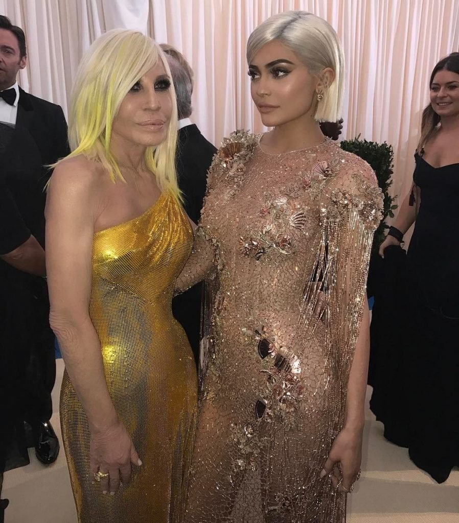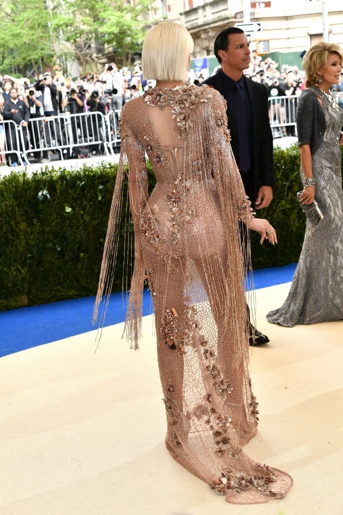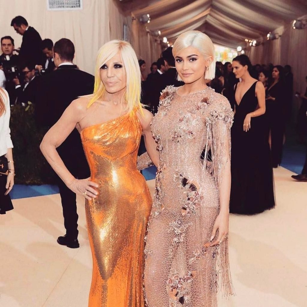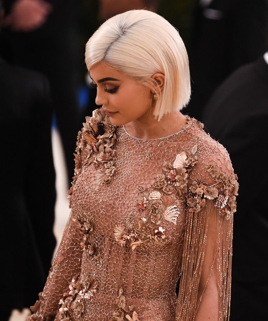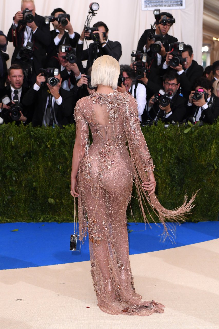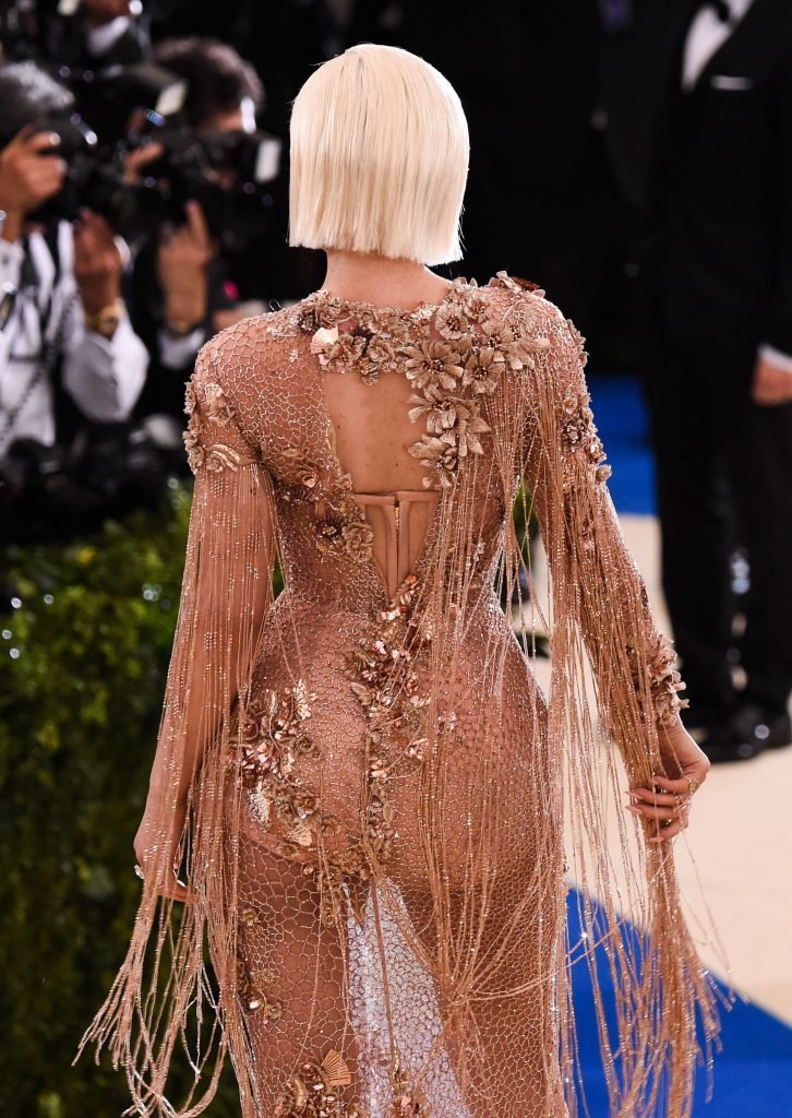 Kylie Jenner porte une robe nude transparente Versace au Met Gala 2017 à NYC, 01/05/2017. Kylie Jenner est une actrice américaine, créatrice, mannequin, star de la télévision, mondaine. Âge – 19.