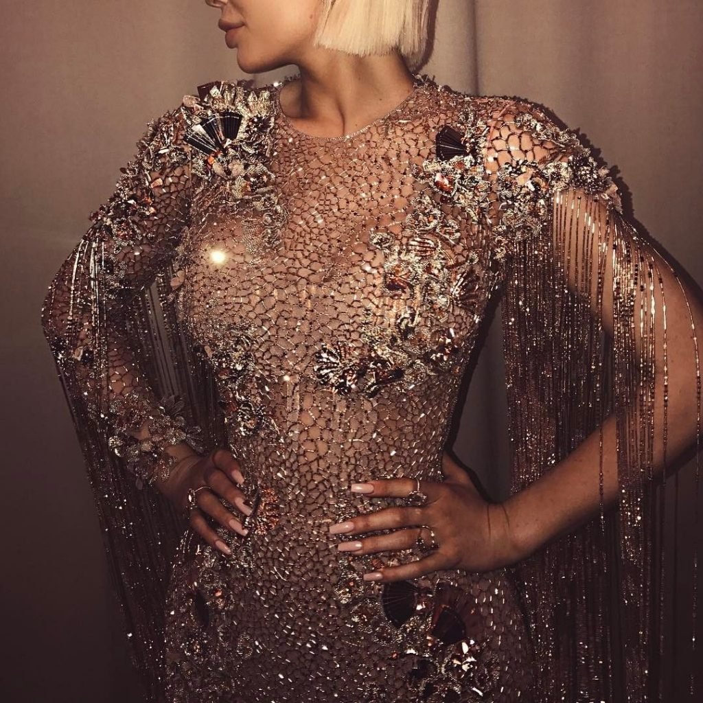 A-t-elle payé pour exactement la même silhouette que sa sœur (hanches larges) ? Et c’est quoi ce truc en or avec lequel elle prend une photo ? C’est cette garce de Versace ?
