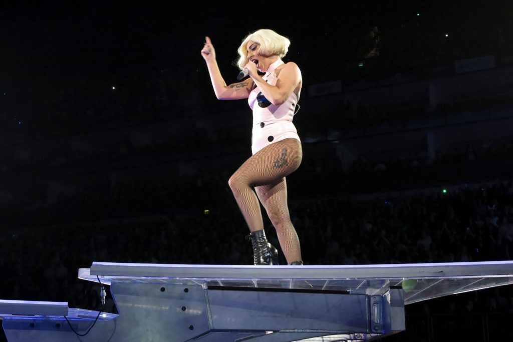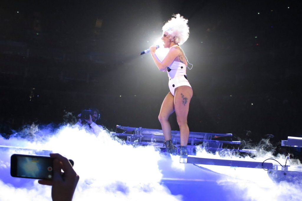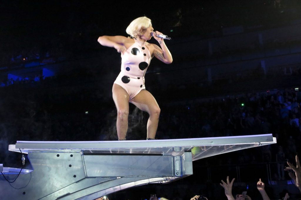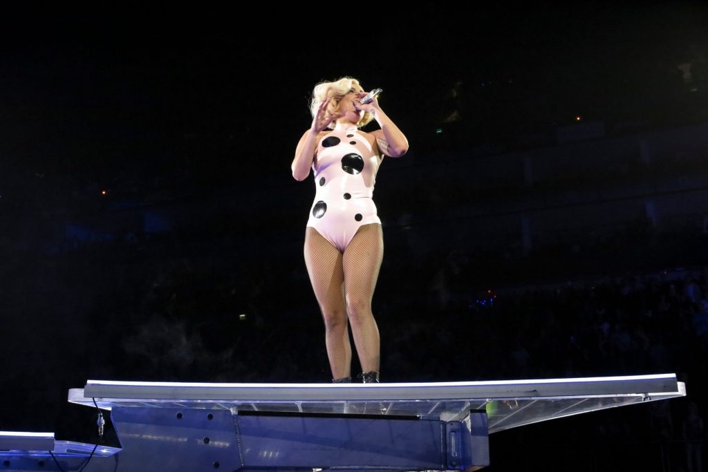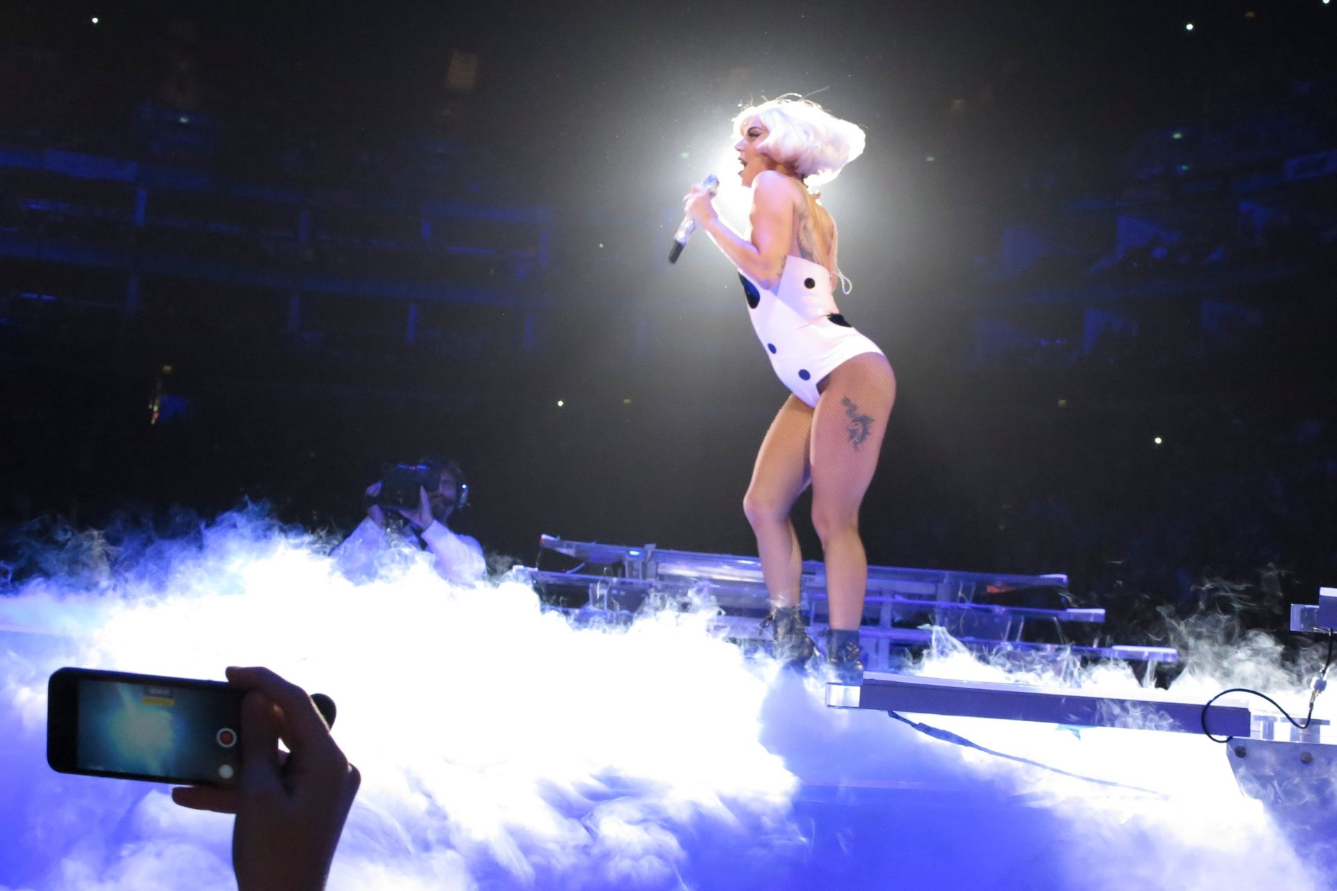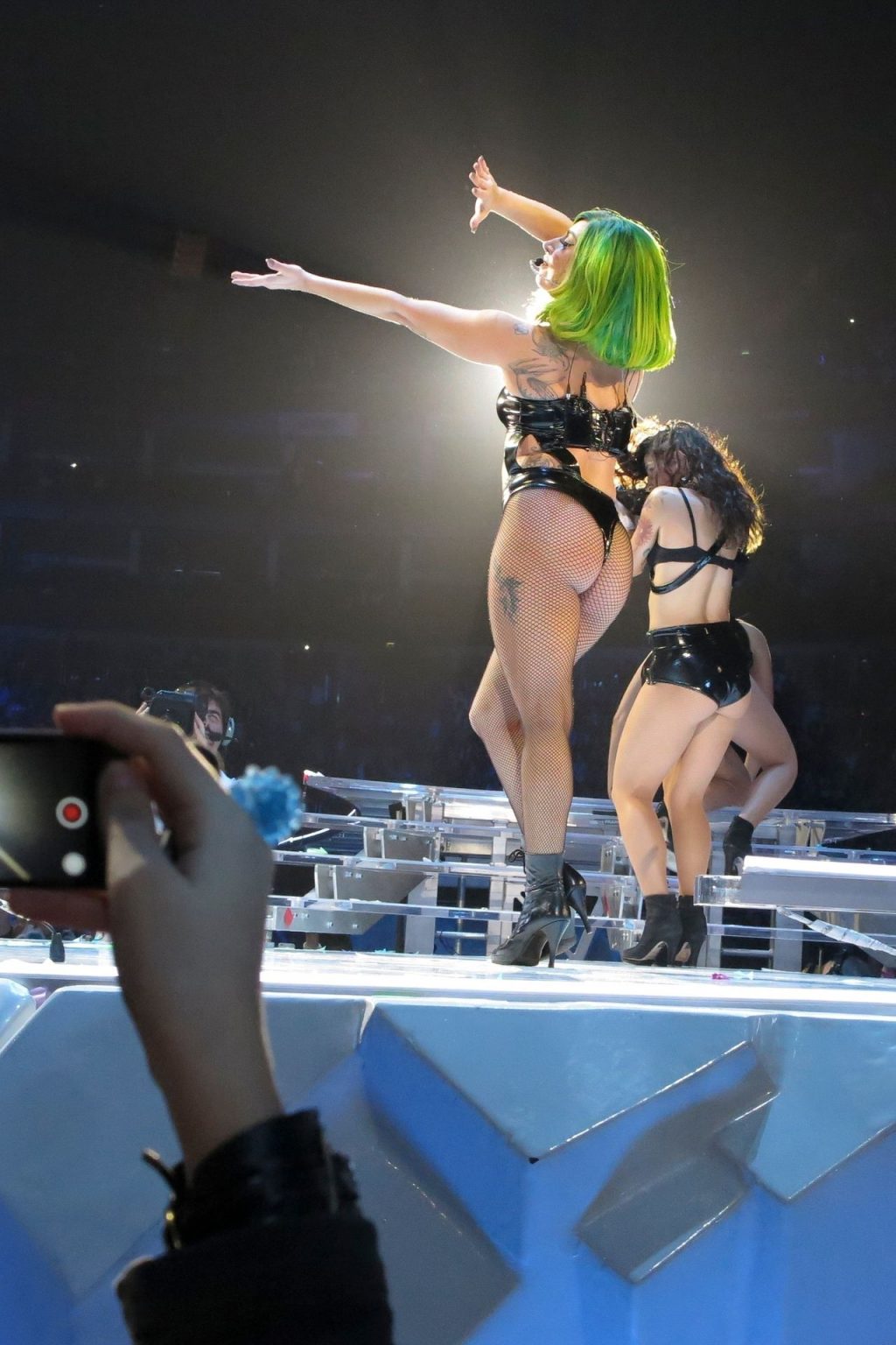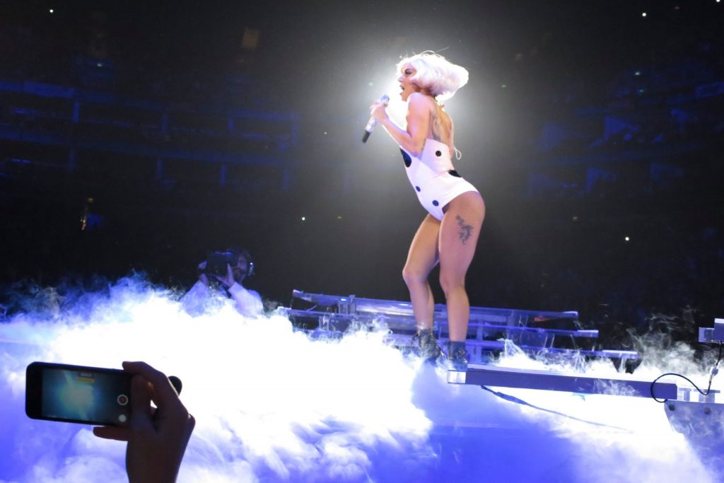 La chanteuse Lady Gaga se produit à l’O2 Arena de Londres, en Angleterre, le 23/10/2014. Elle a surpris avec ses nombreuses tenues et ses poses sexy sur scène.