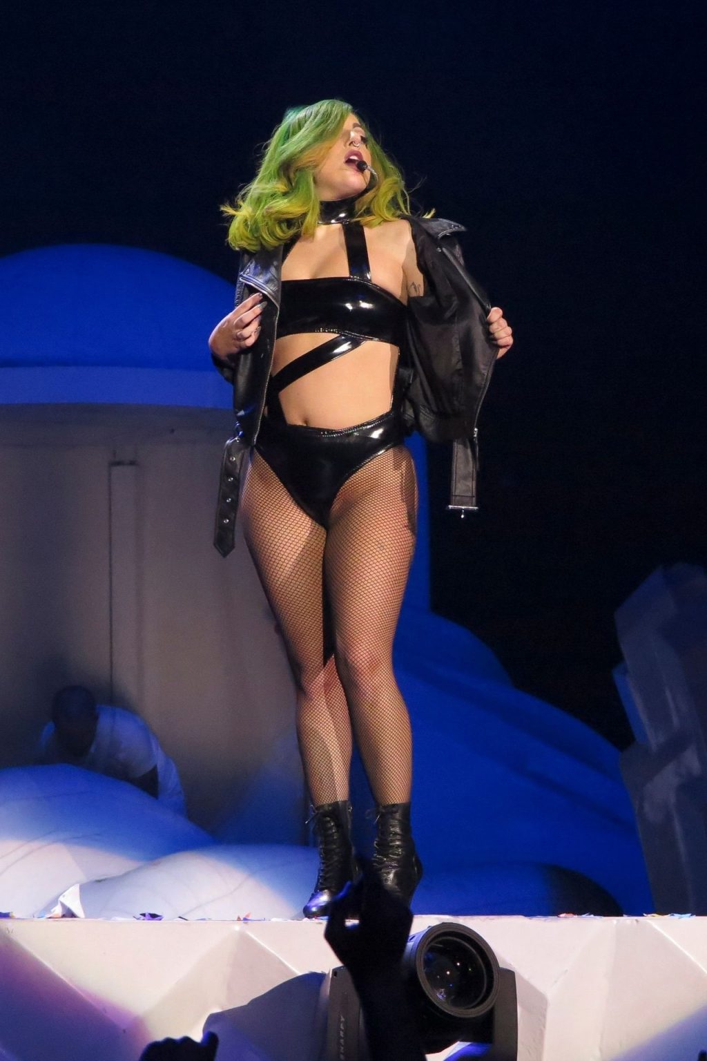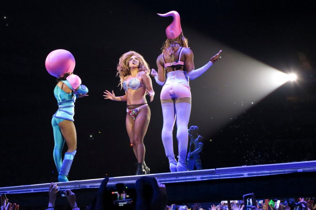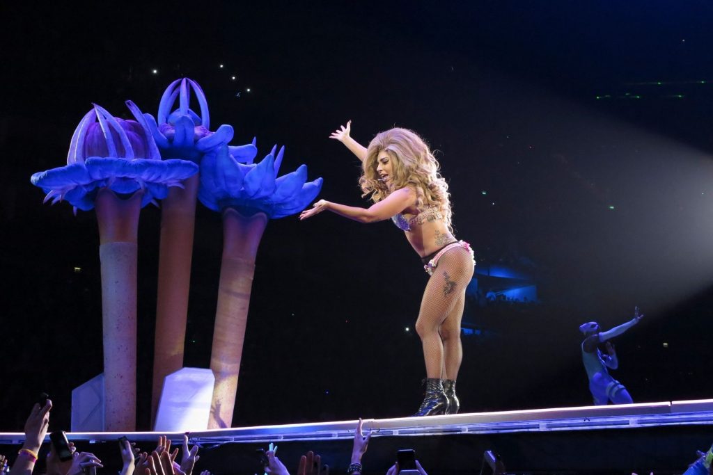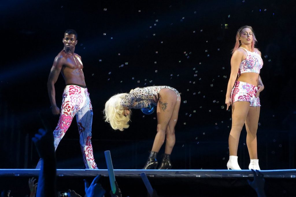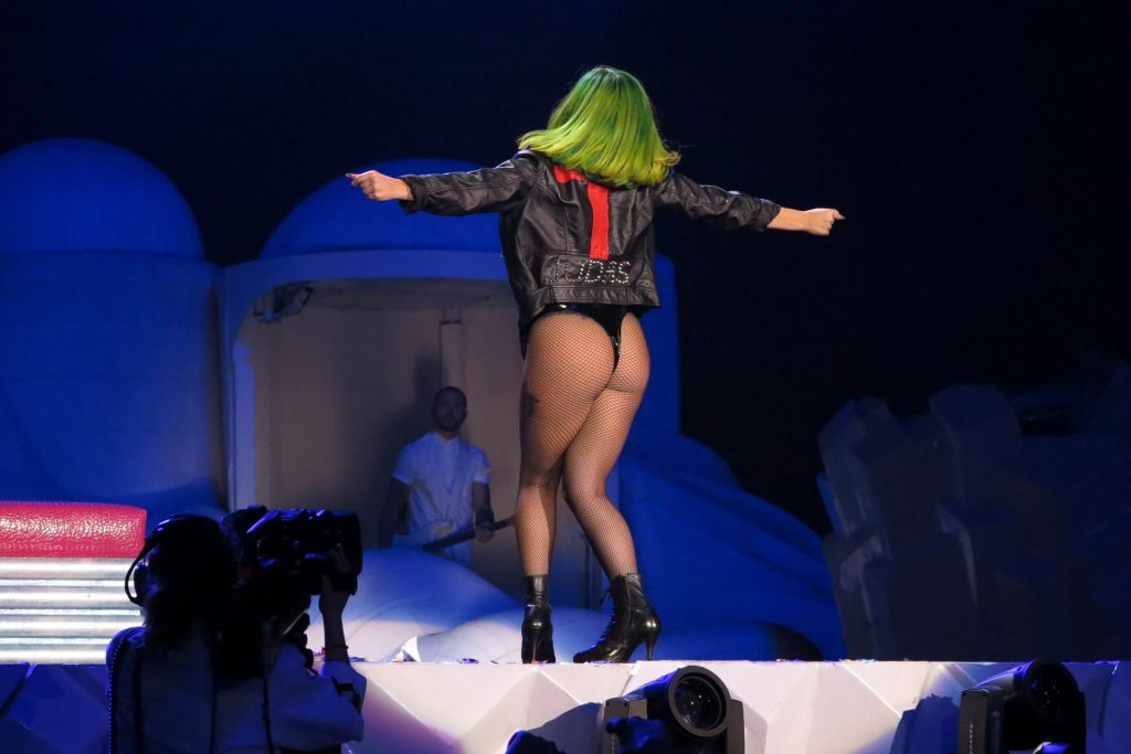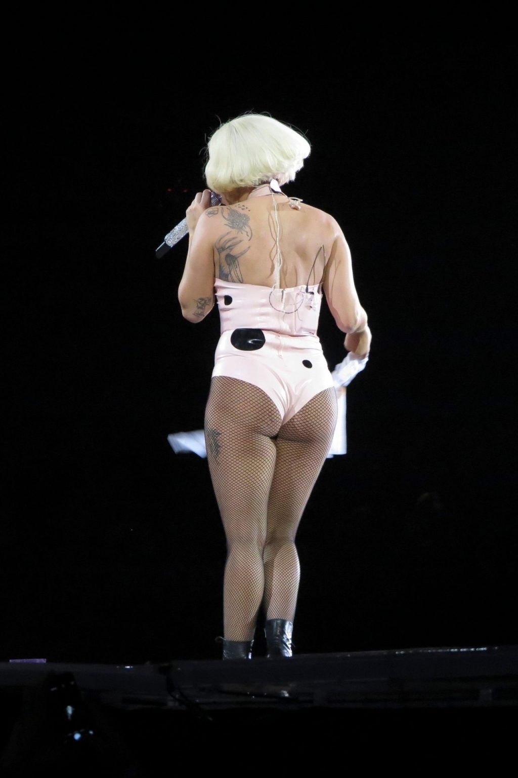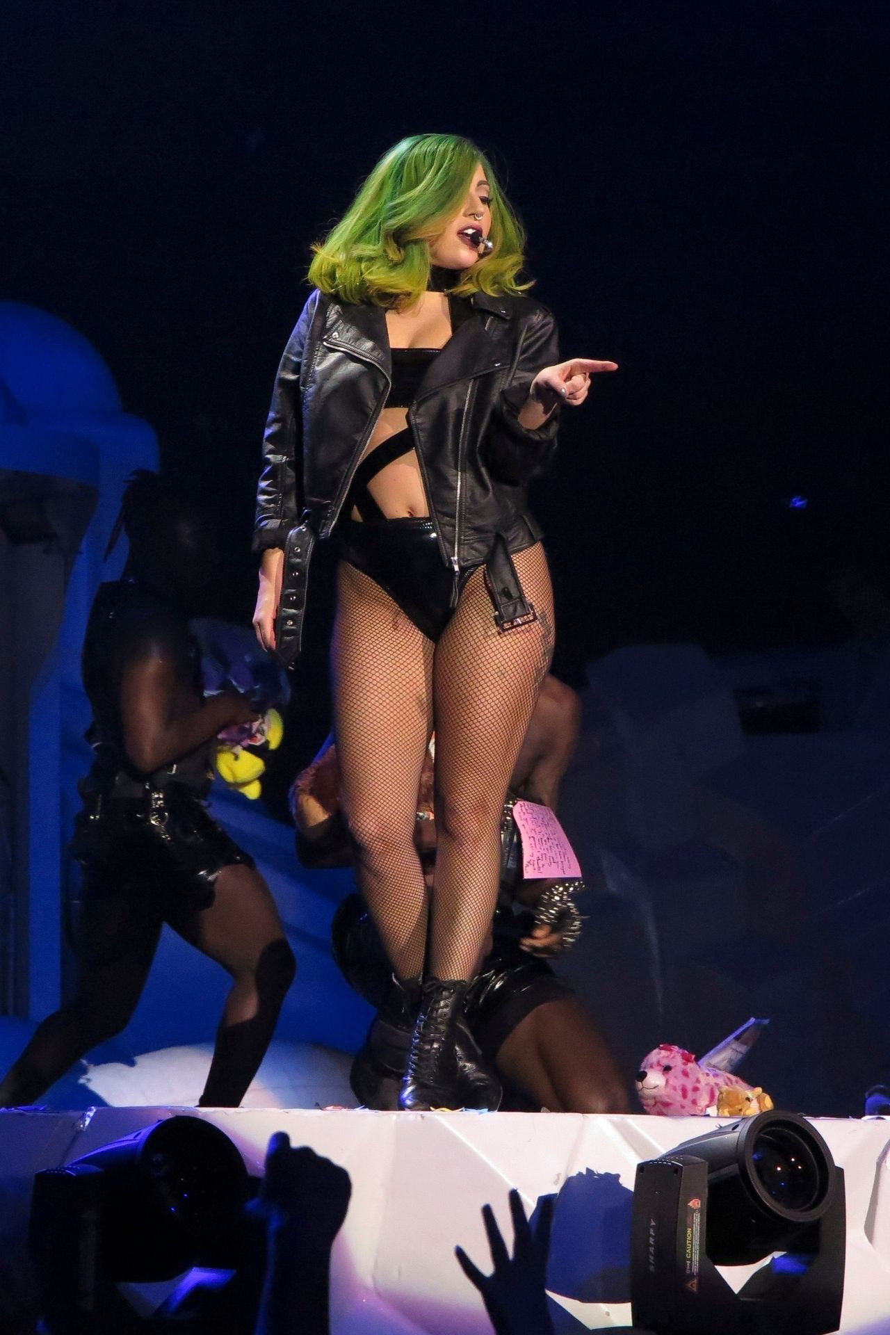 La chanteuse Lady Gaga se produit à l’O2 Arena de Londres, en Angleterre, le 23/10/2014. Elle a surpris avec ses nombreuses tenues et ses poses sexy sur scène.