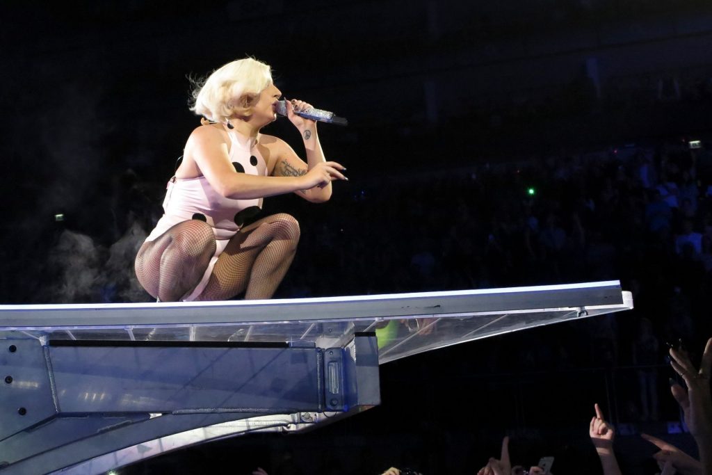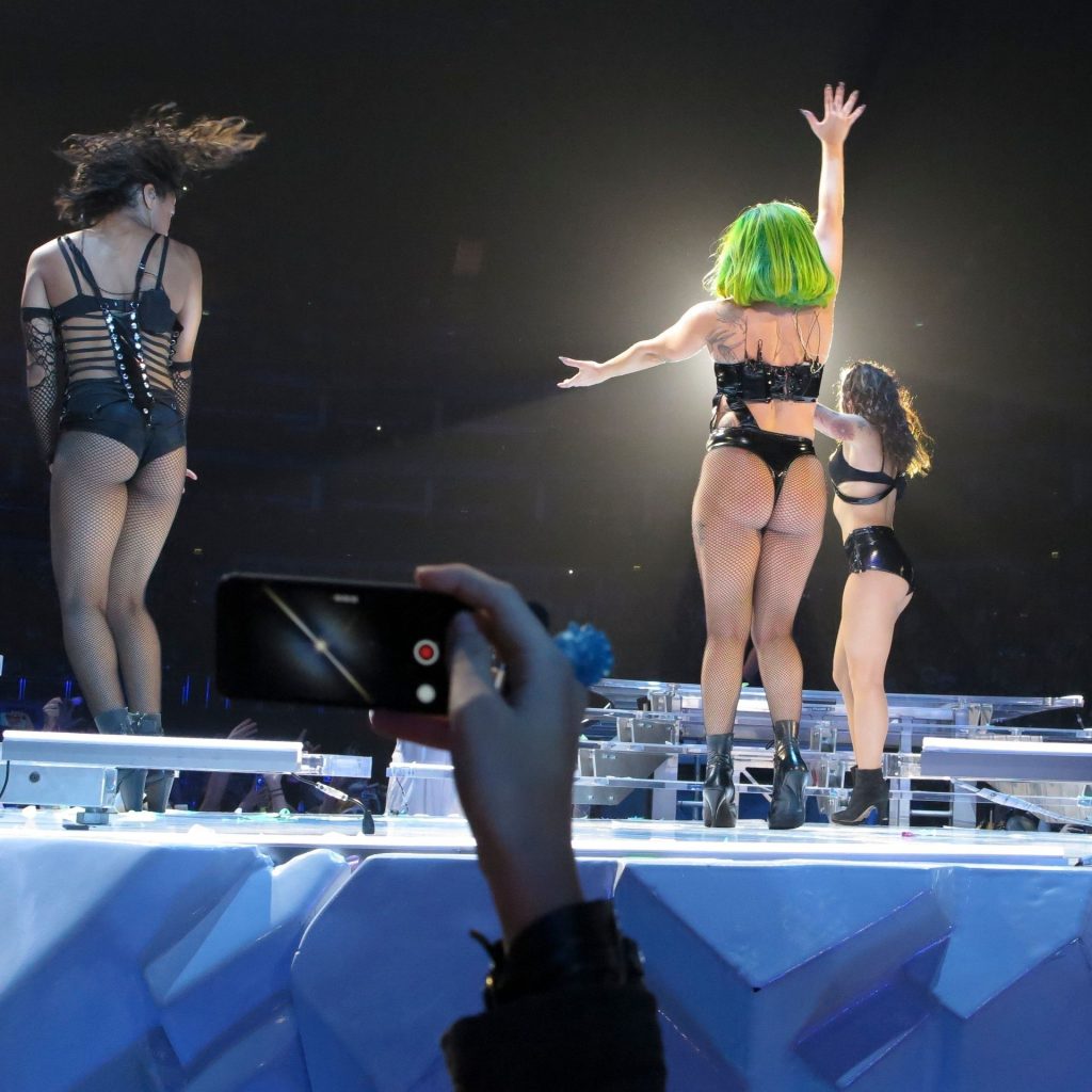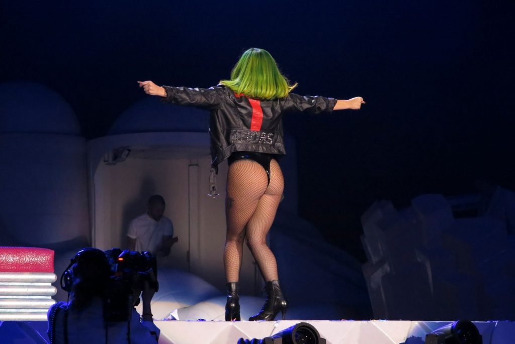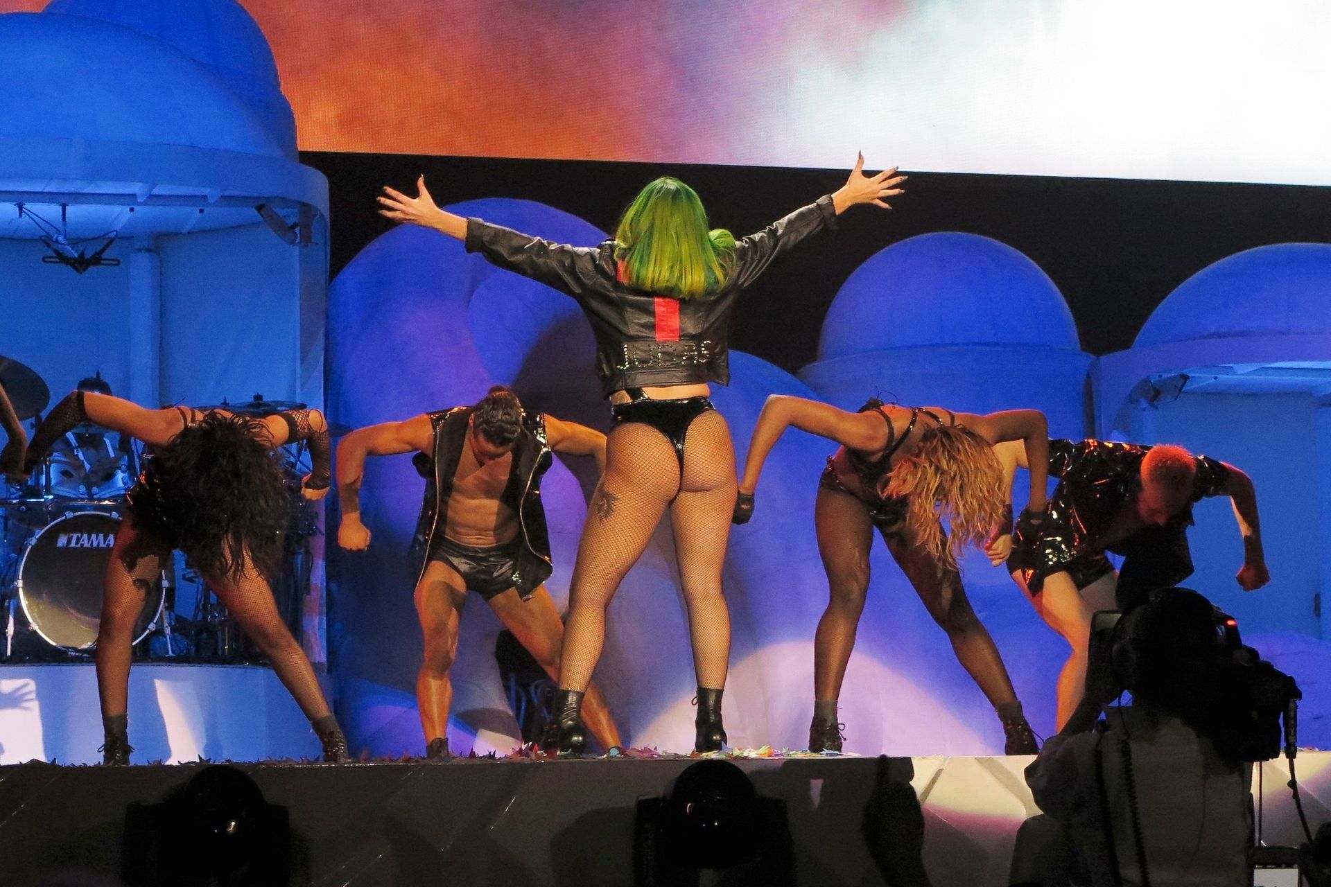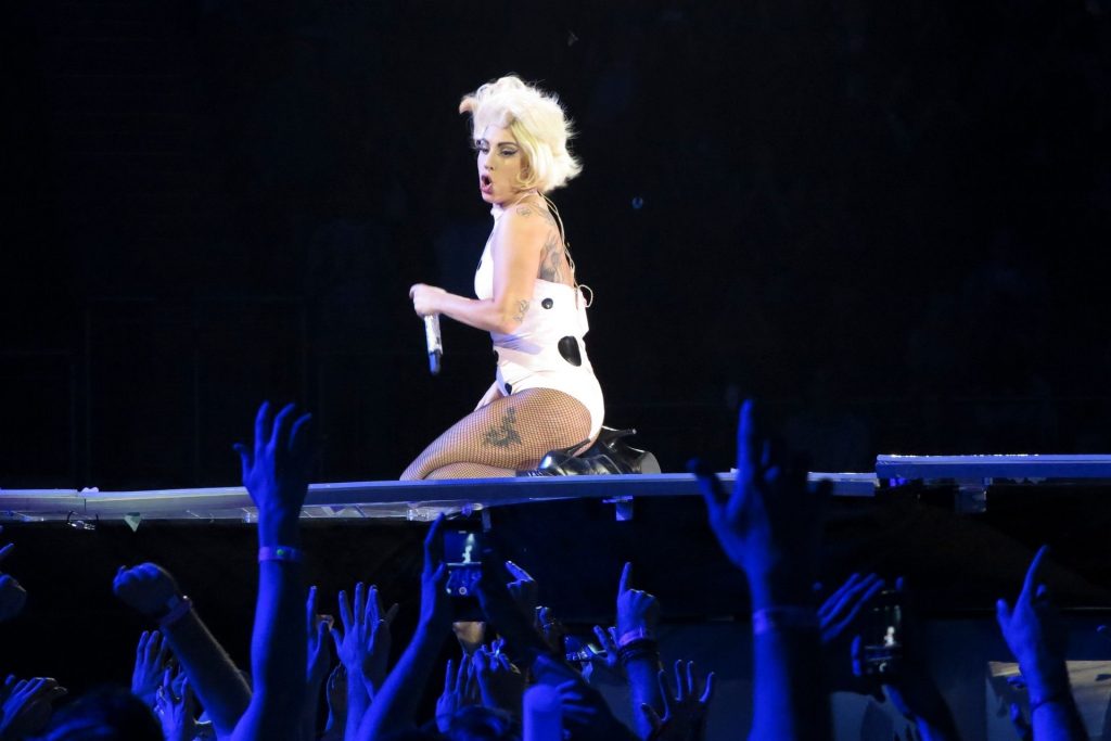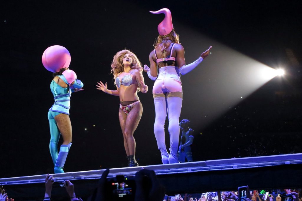 La chanteuse Lady Gaga se produit à l’O2 Arena de Londres, en Angleterre, le 23/10/2014. Elle a surpris avec ses nombreuses tenues et ses poses sexy sur scène.